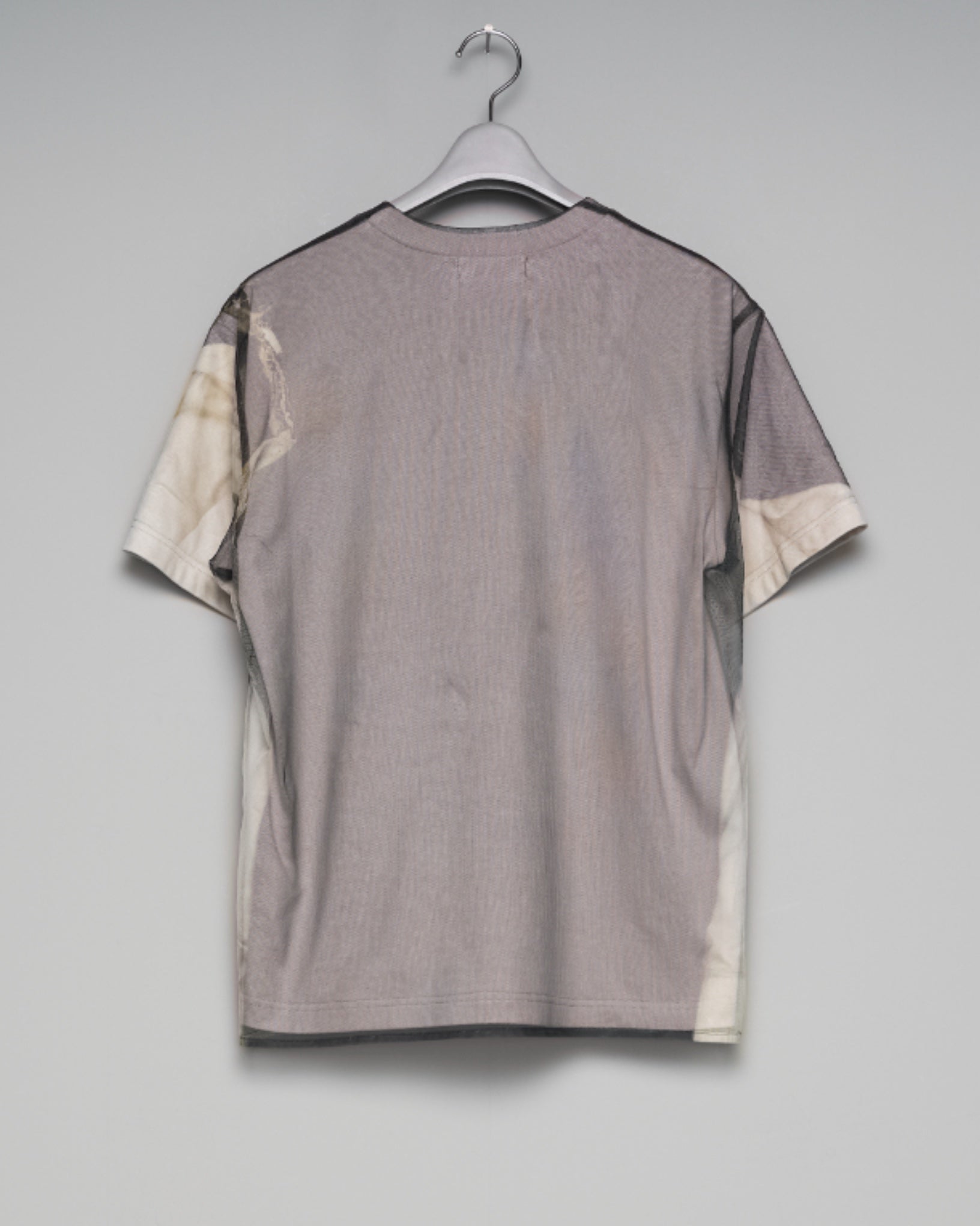 チュール面に1900年代のフロックコートを裏返し、時代を経たコートの質感や、当時のタグをプリント。