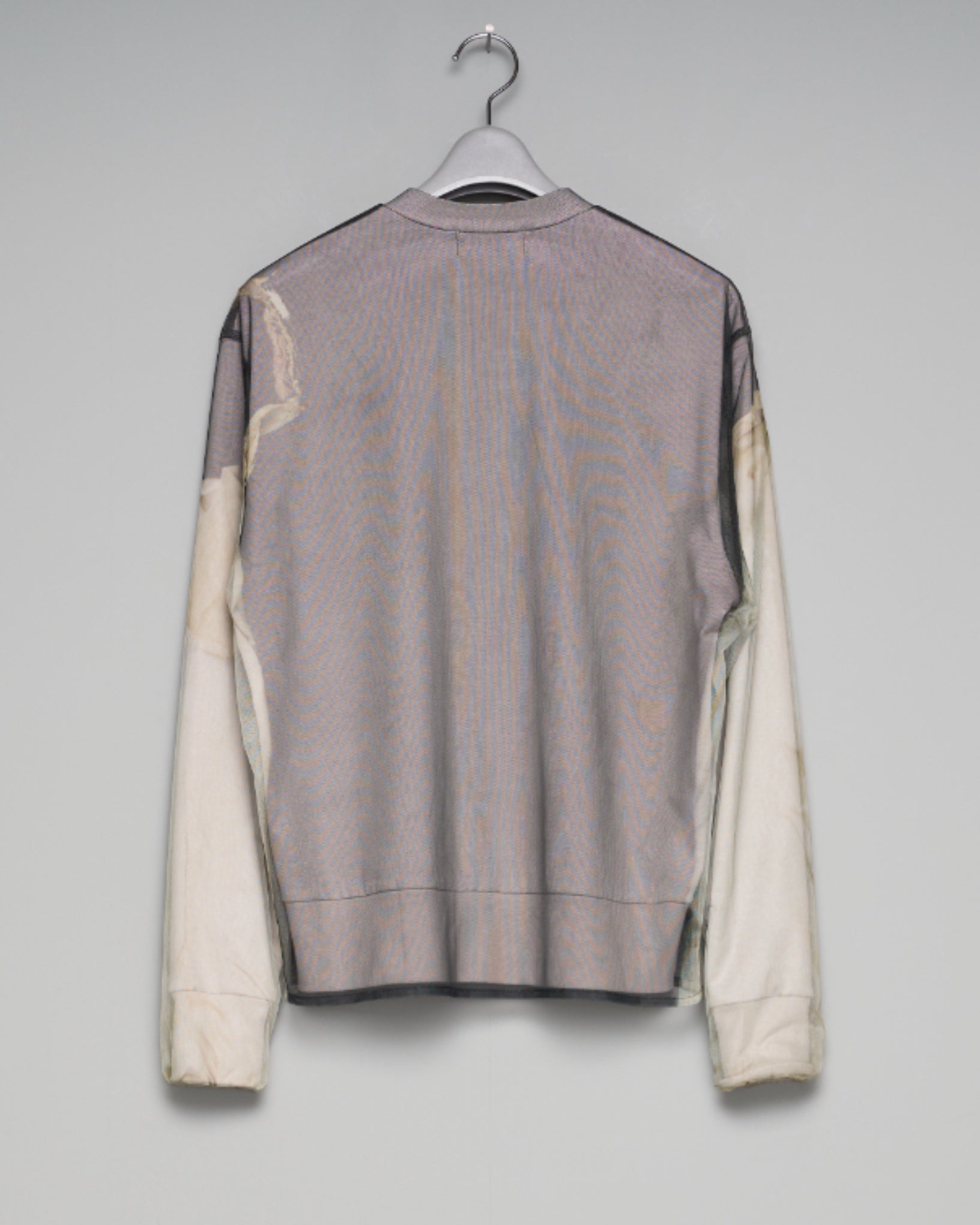 チュール面に1900年代のフロックコートを裏返し、時代を経たコートの質感や、当時のタグをプリント。
