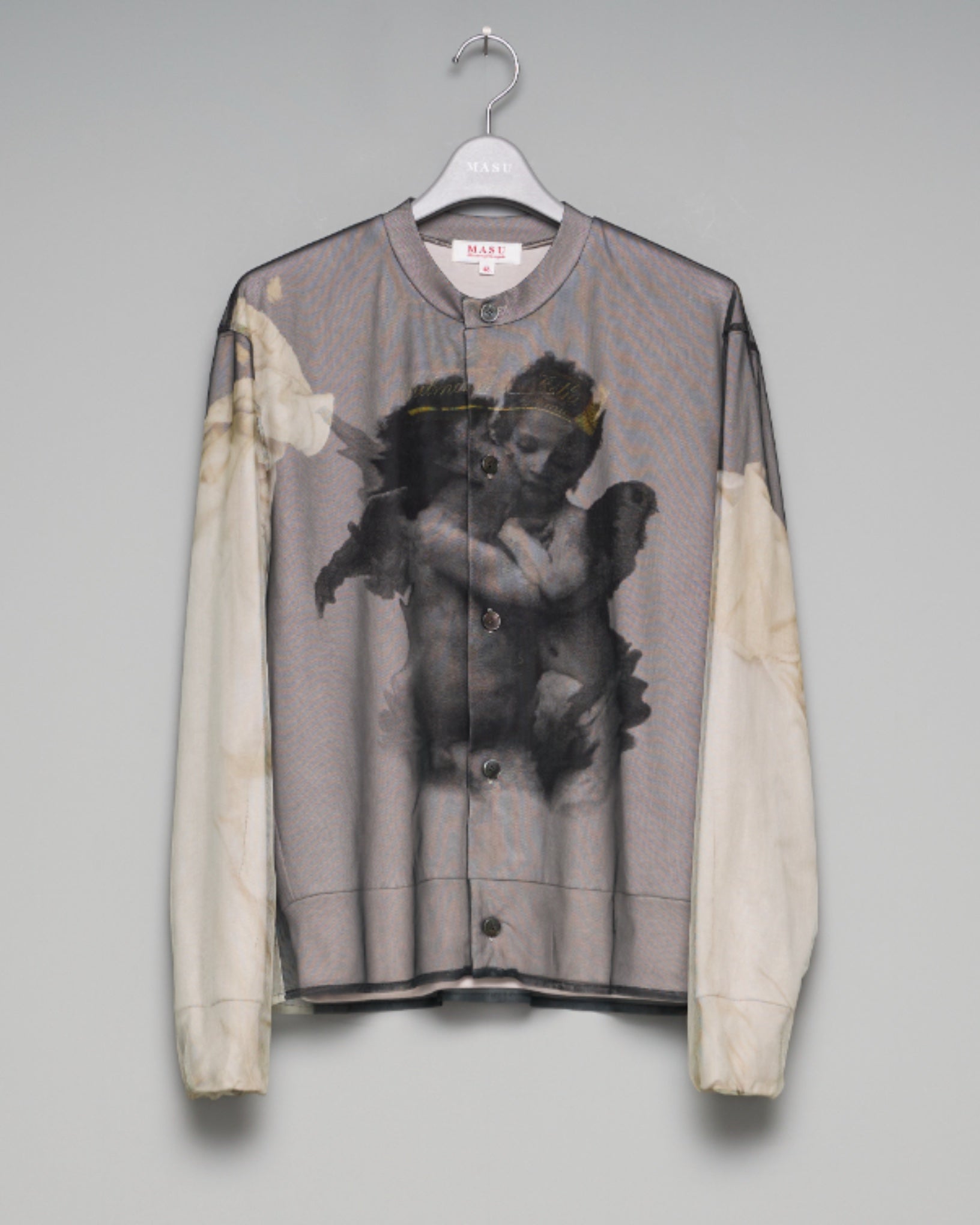 天竺面にはブランドの象徴とも呼べる天使グラフィックを配し、祈りと退廃的な美しさを共存させている。