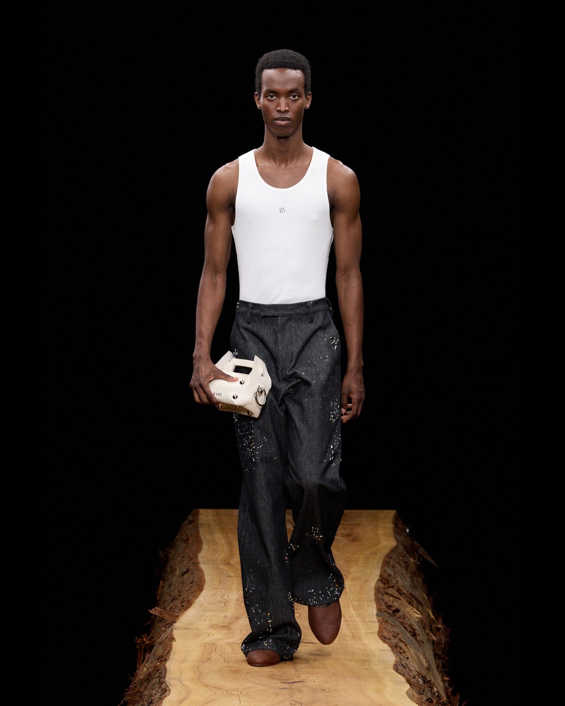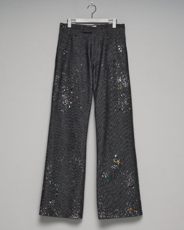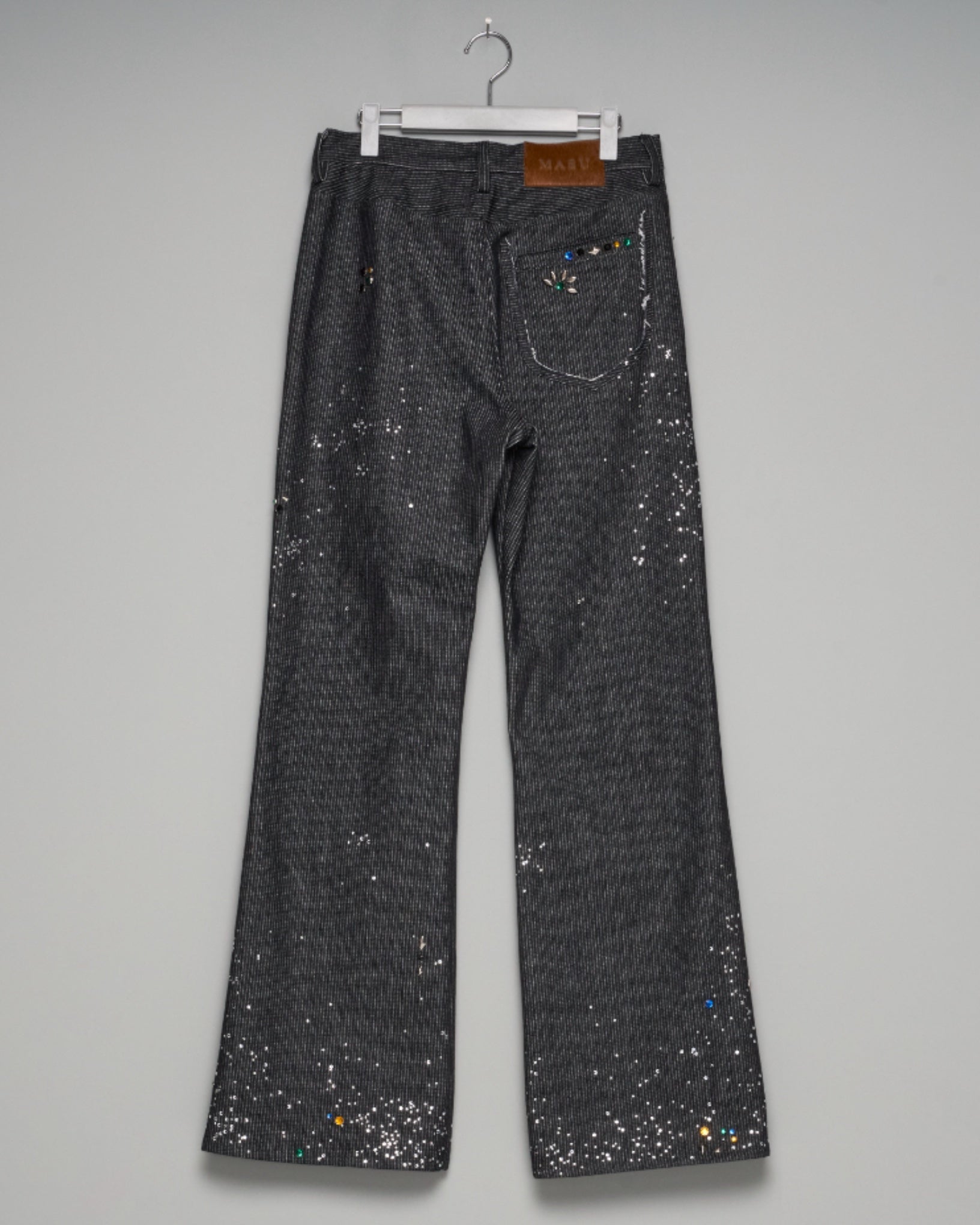 膝部分のラインストーンやスタッズは、まるで長い年月を経て剥がれ落ちたかのように、不自然に、あるいは必然的に欠落している。