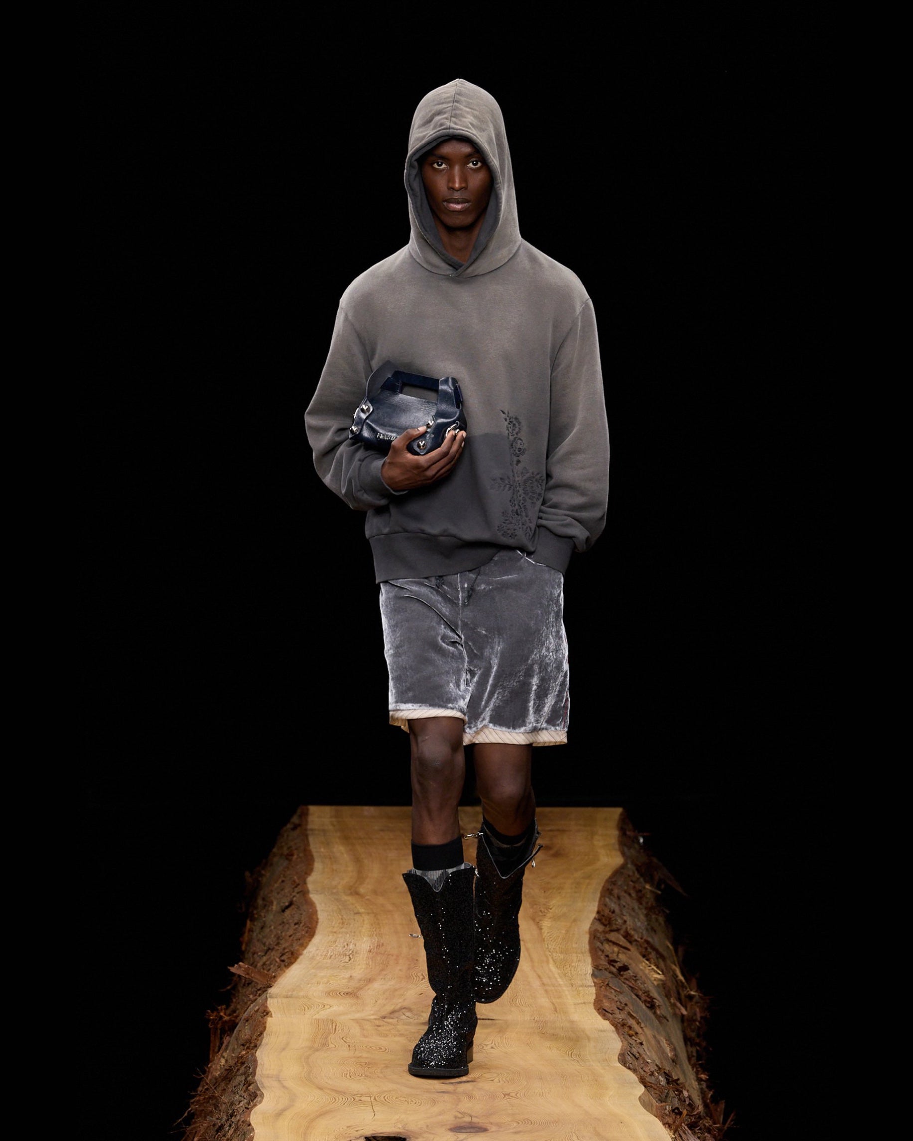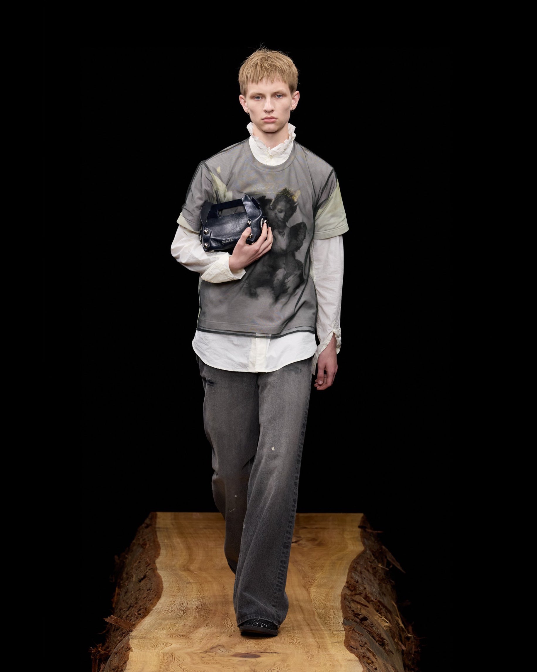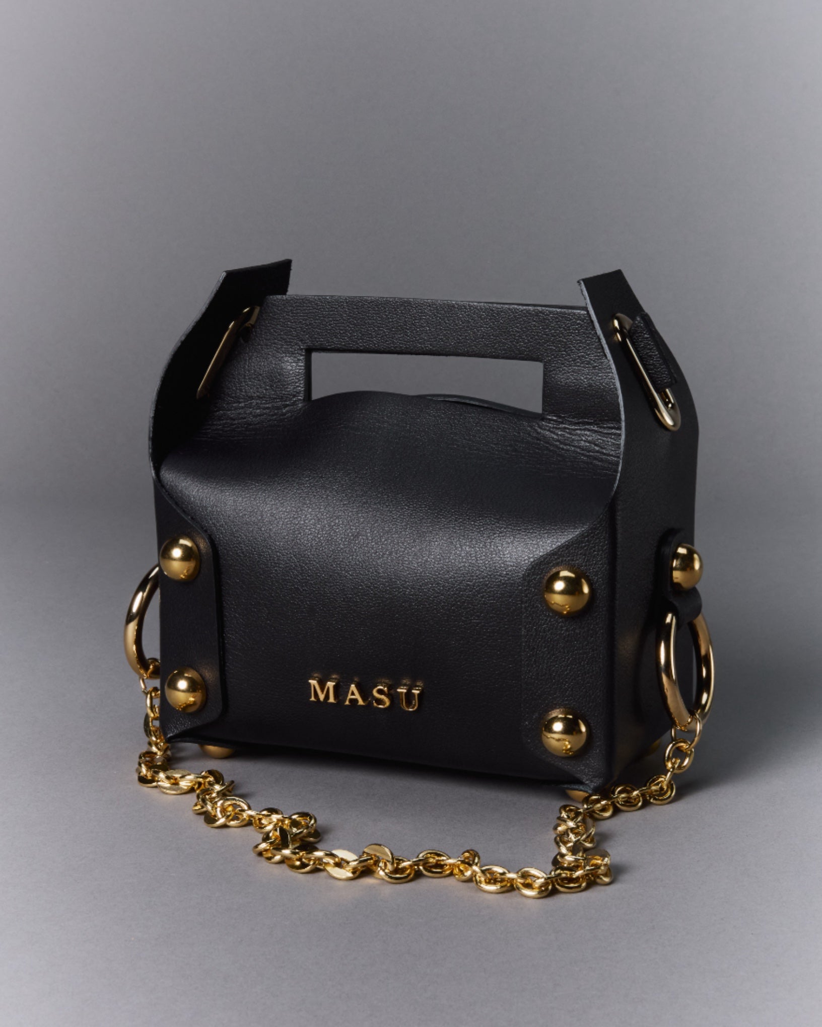 ツヤのある牛革を使用し、縫製は一切入れず丸型の鋲の打ち込みのみで形作られ、ゴールドのチェーンが実用性と共に魅力を際立たせた。