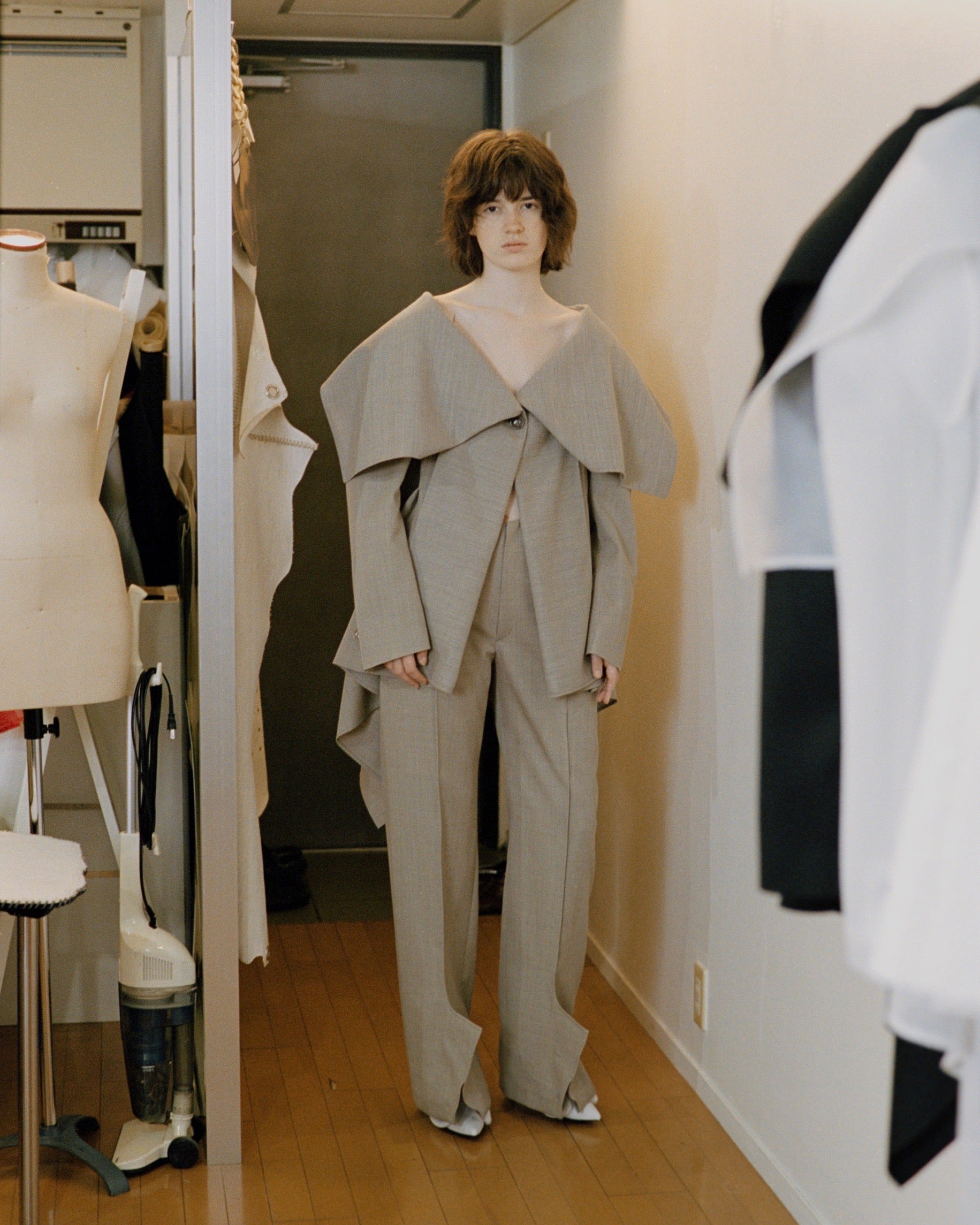 ・着物のような平面、幾何学的なモチーフと西洋的なドレープ、テーラリングを組み合わせた、YOHEI OHNOの造形コンセプトが強く反映された作り。
