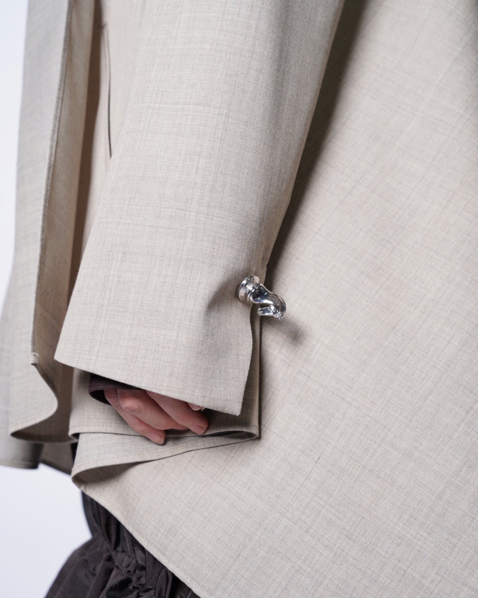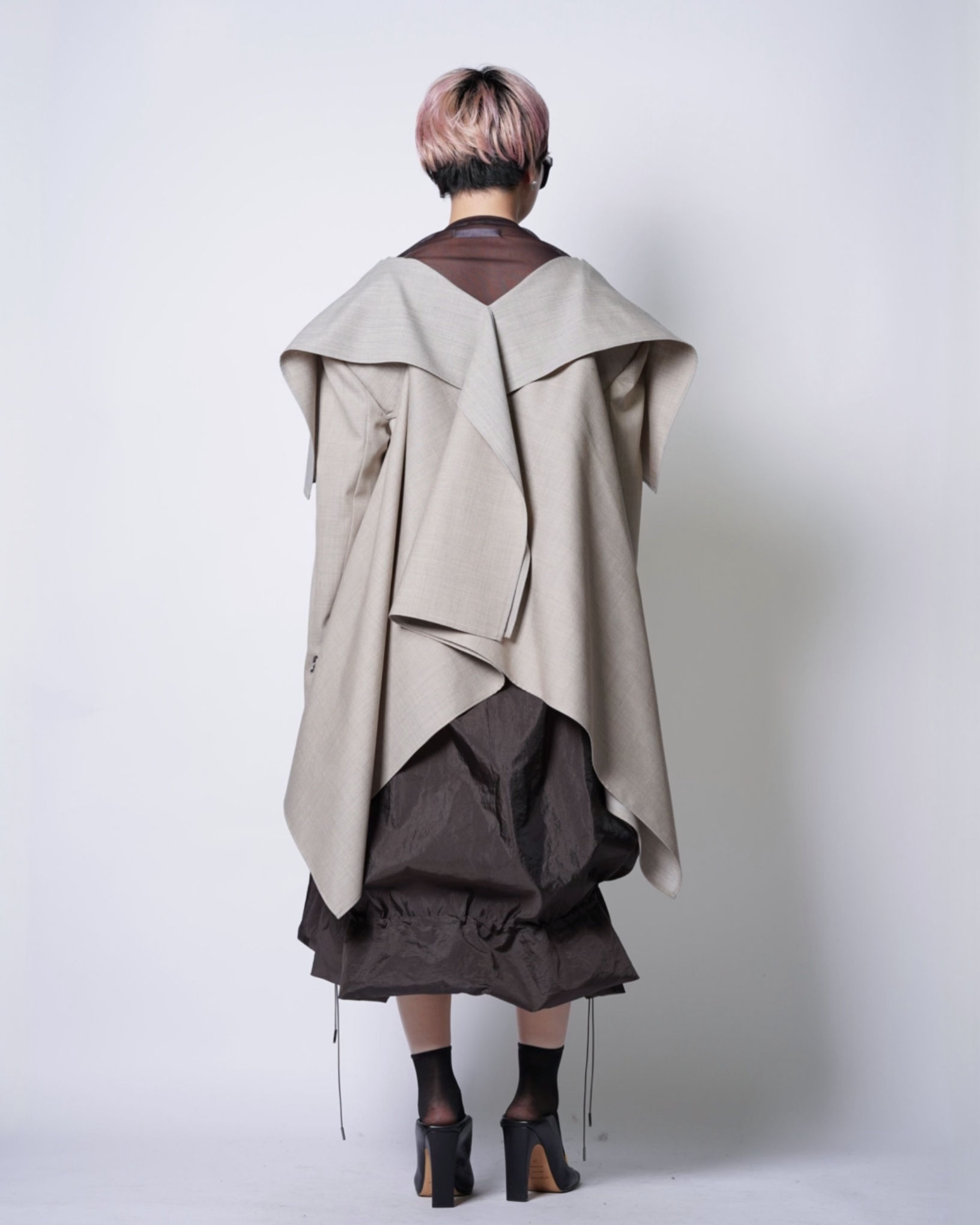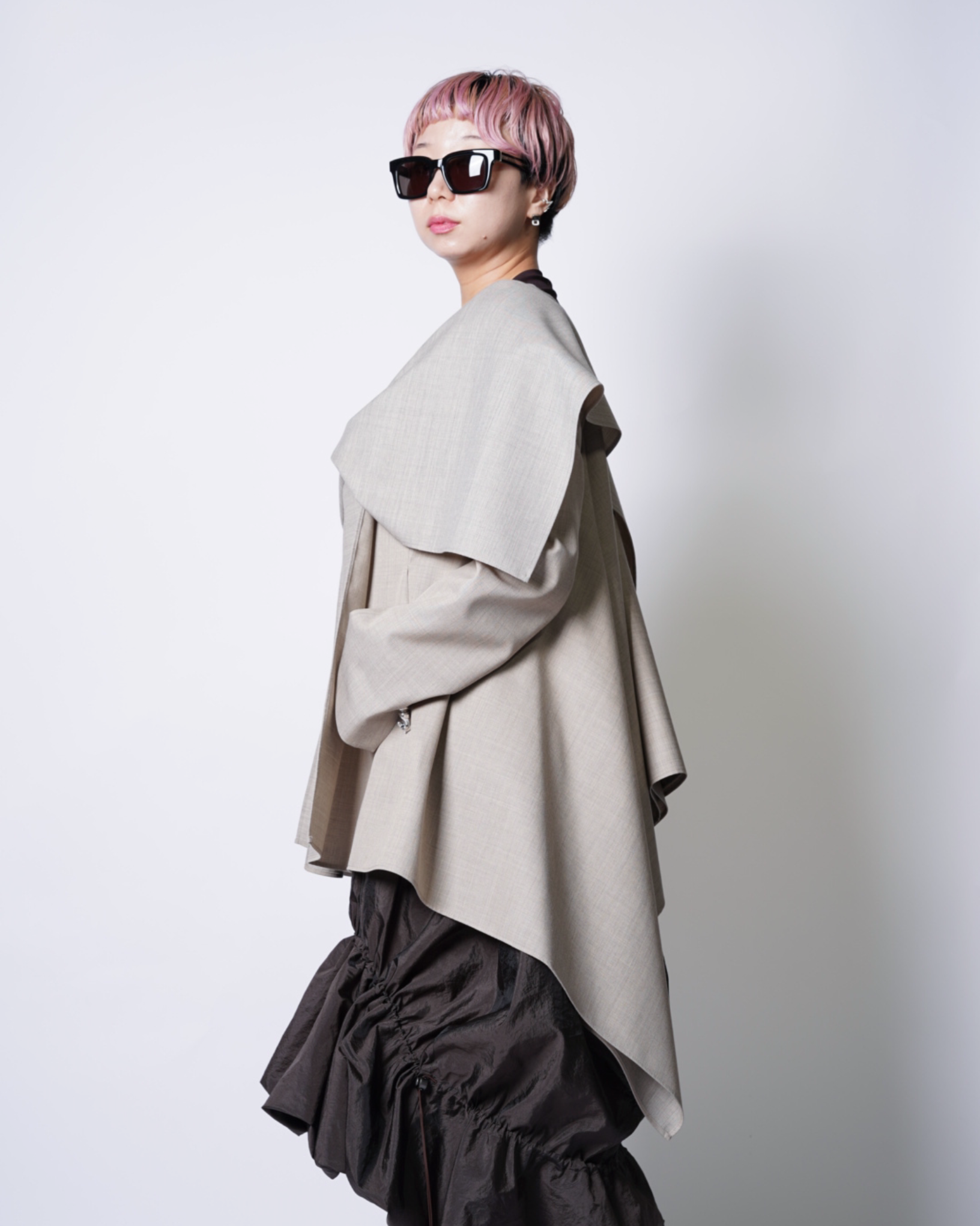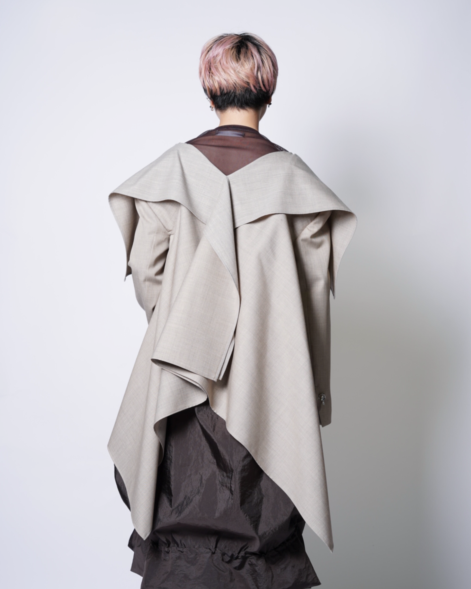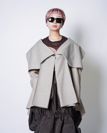 ・肩から袖にかけてはテーラージャケットらしい構築感のあるラインを作っており、複雑なフォルムながらも端正な側面も兼ねたシルエットです。