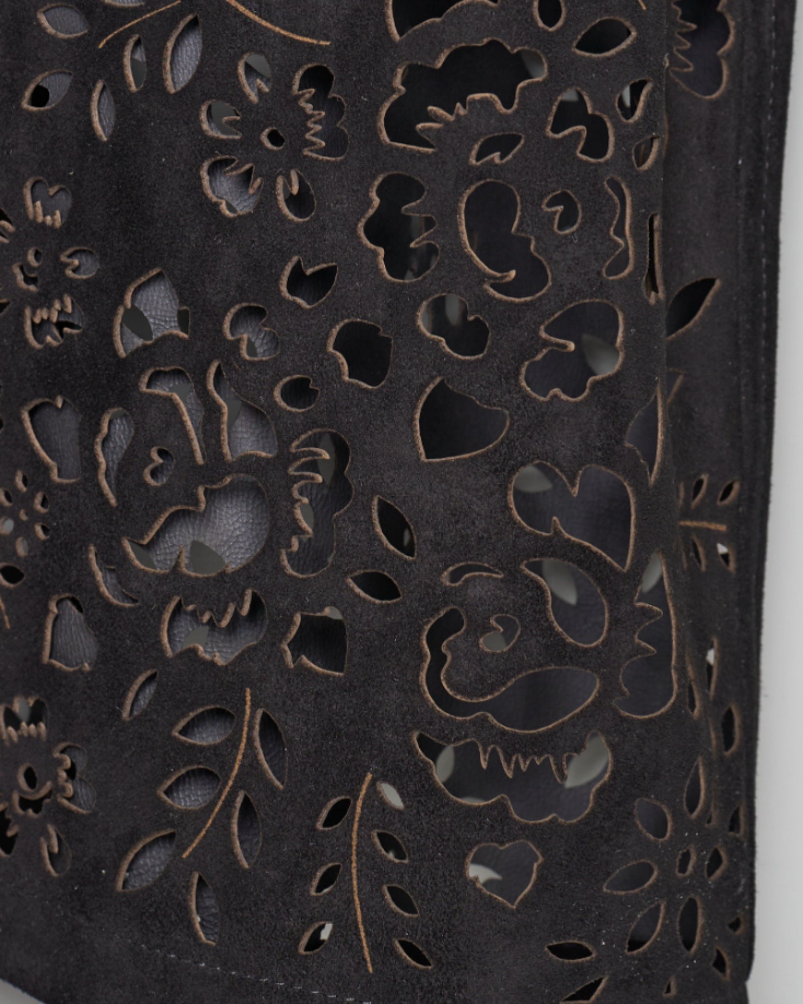 従来のレーザーカットに併せて革を焼き切るのではなく、表面を焼き付けて花柄を描き出す技法を採用している。
