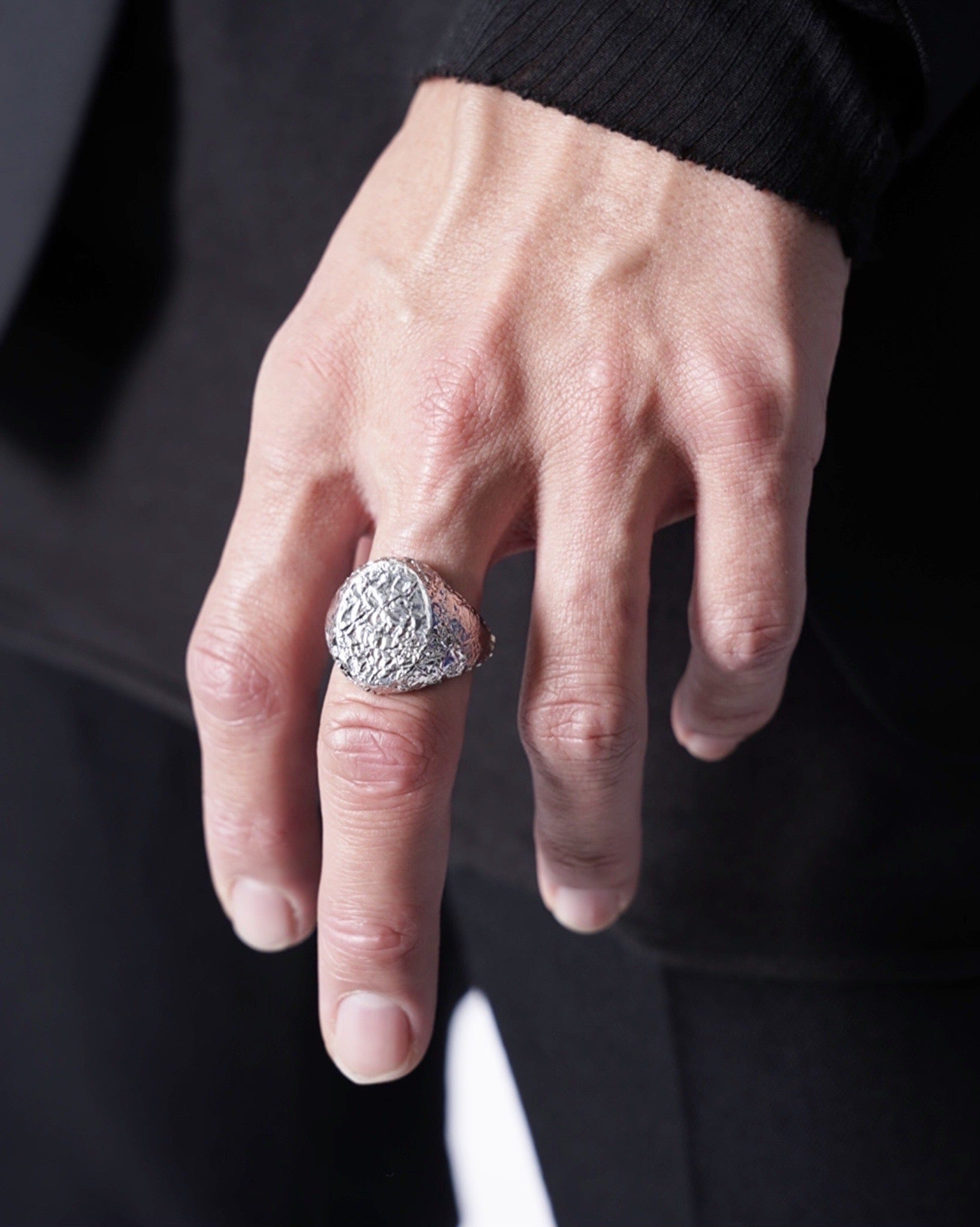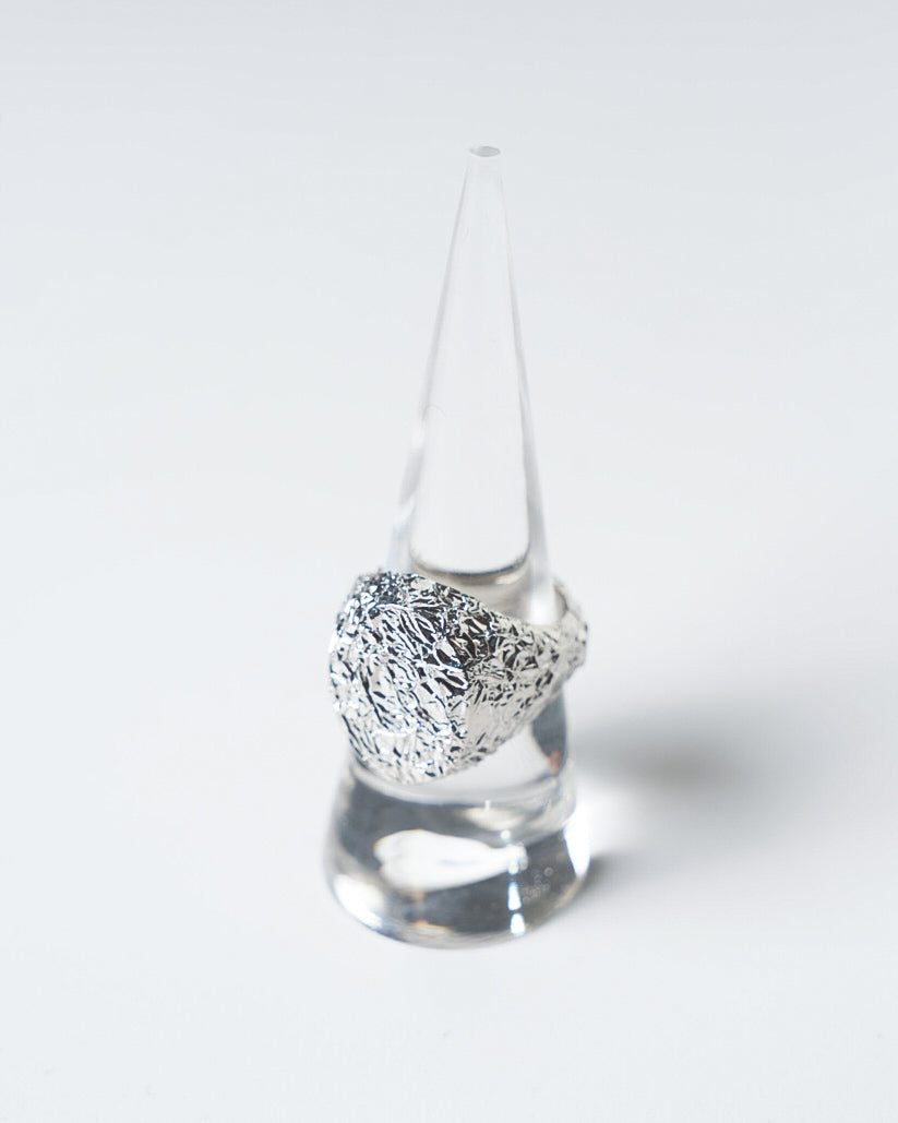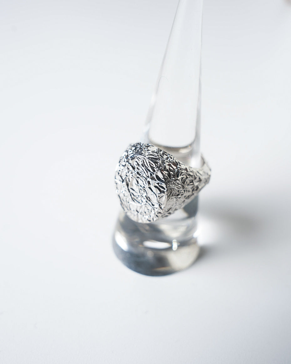・シグネットリングをアルミ箔で包んだようなユニークなデザイン。