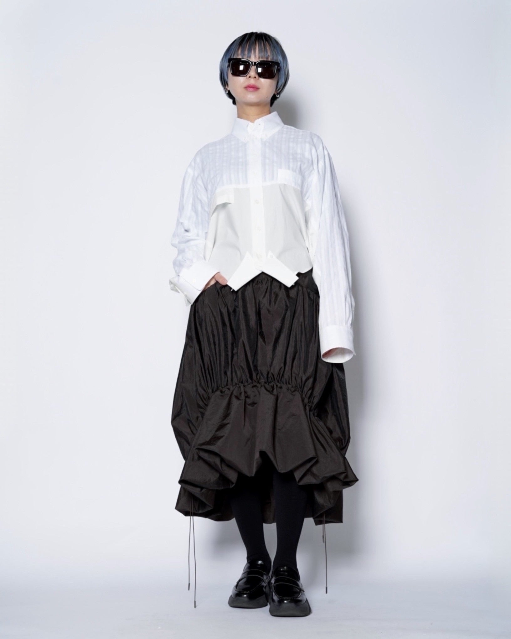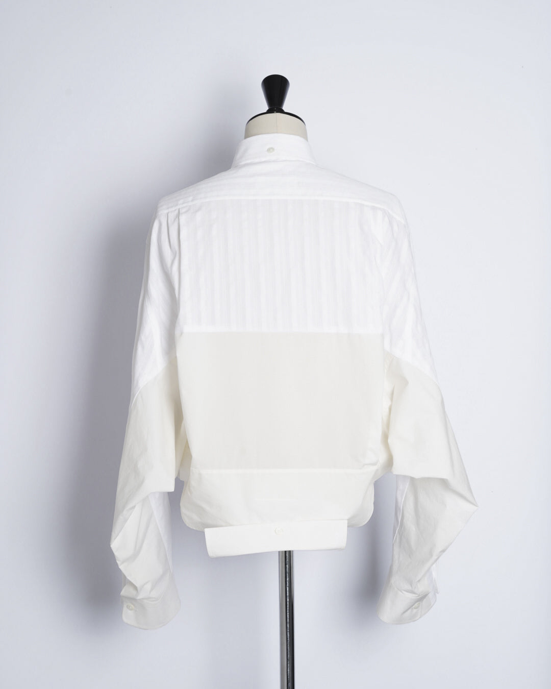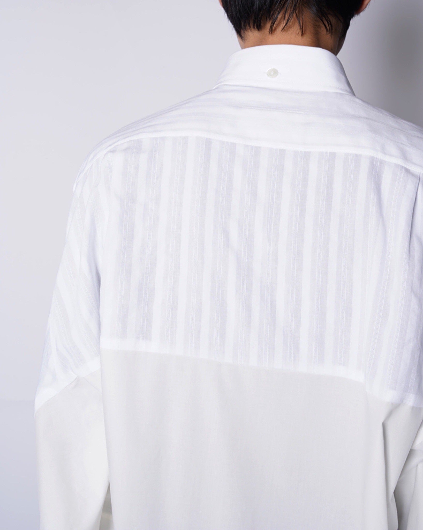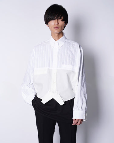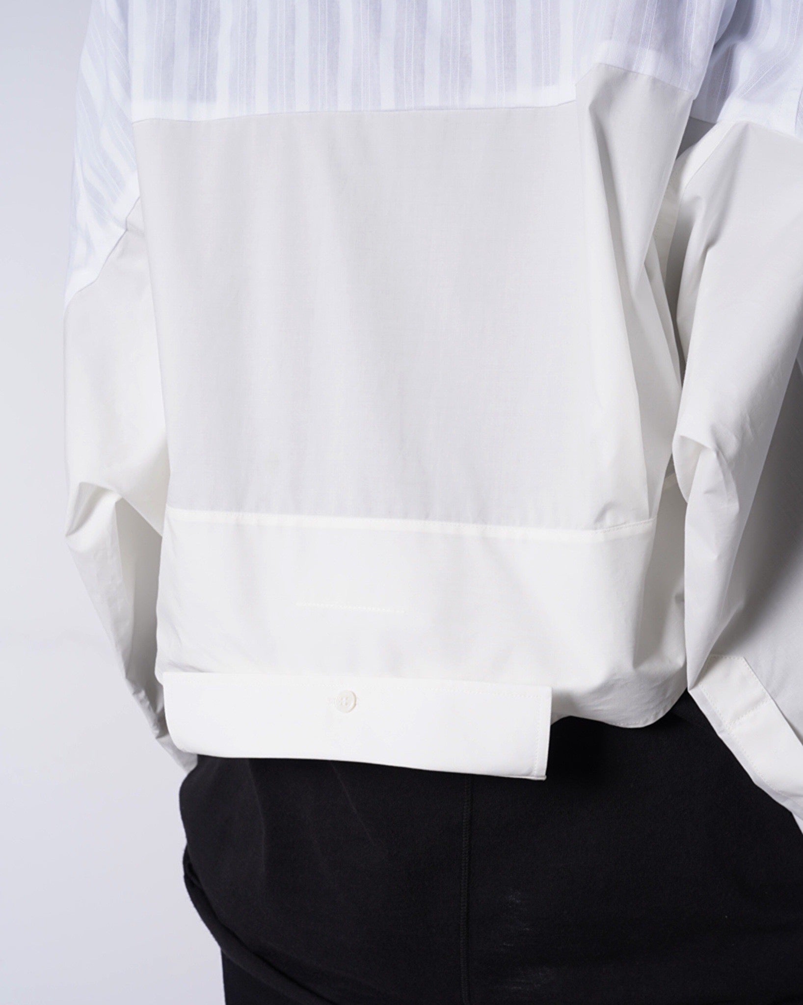 ・軽快な織りストライプとドレッシーなブロードクロスの異なる表情の生地感で、異質的なドッキングデザインに。