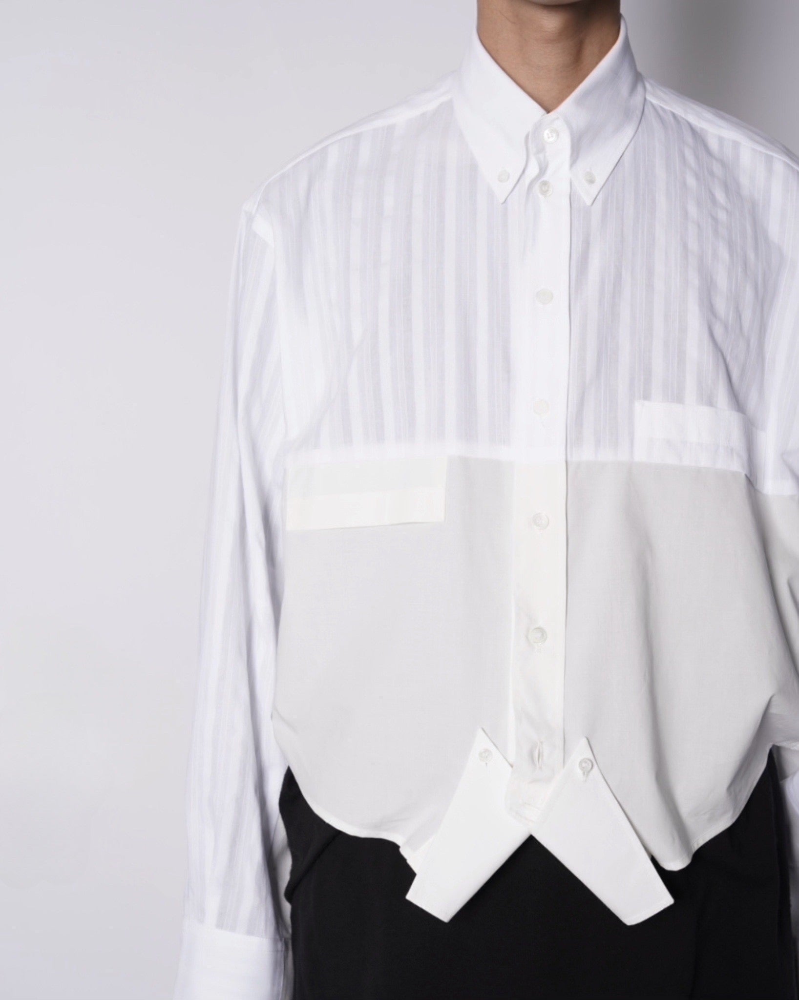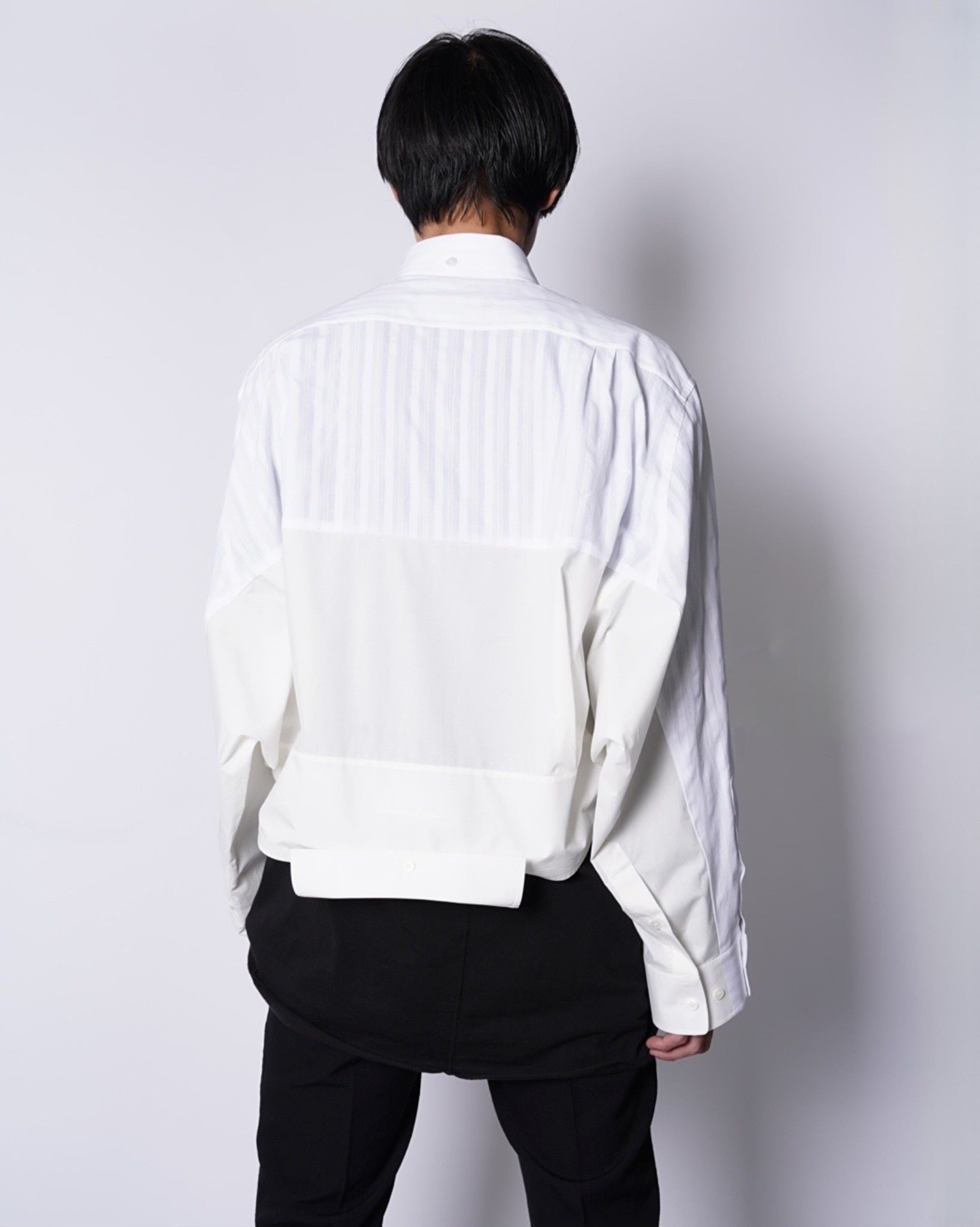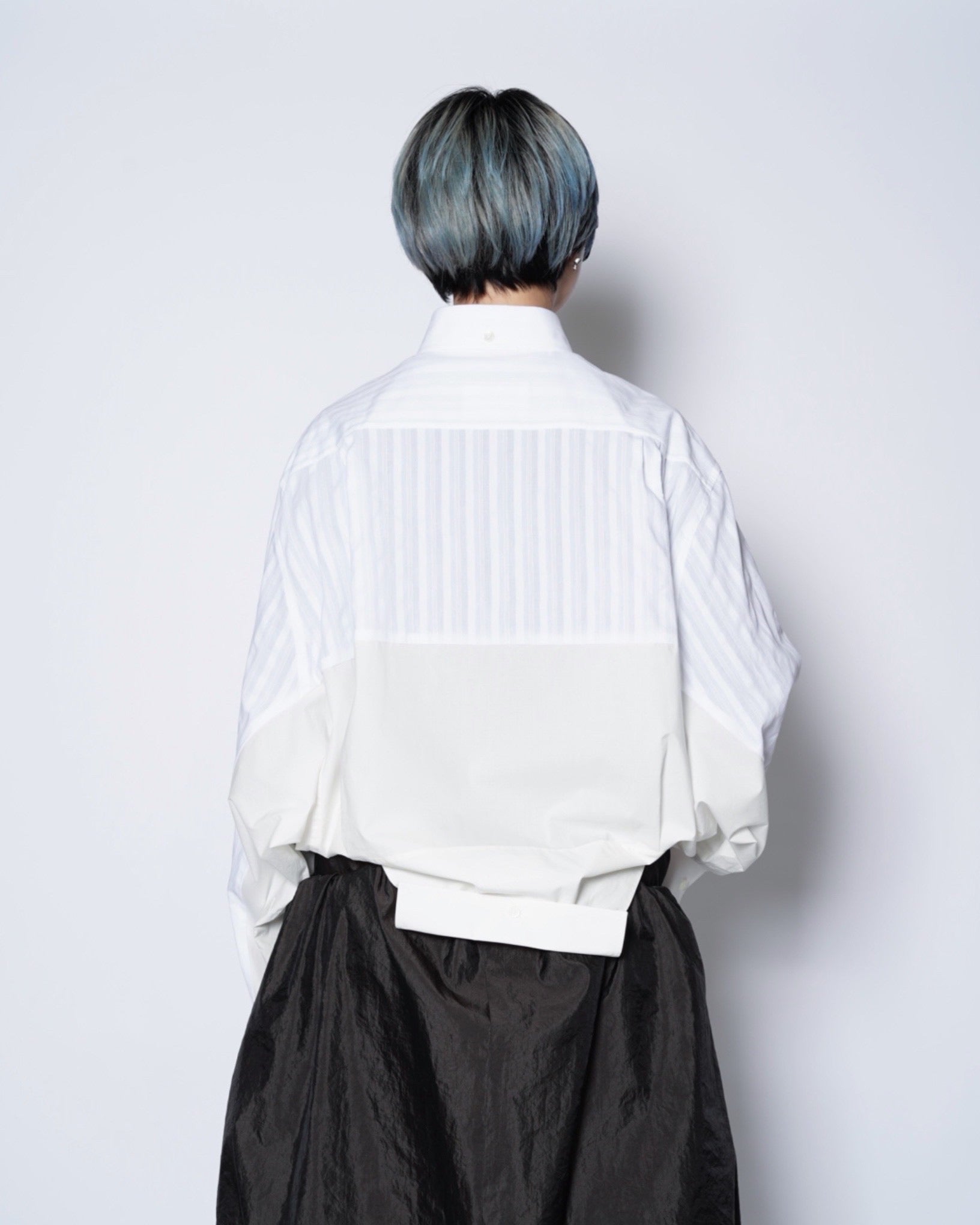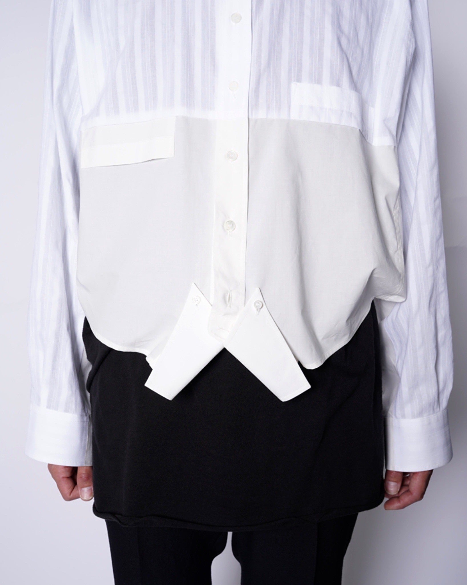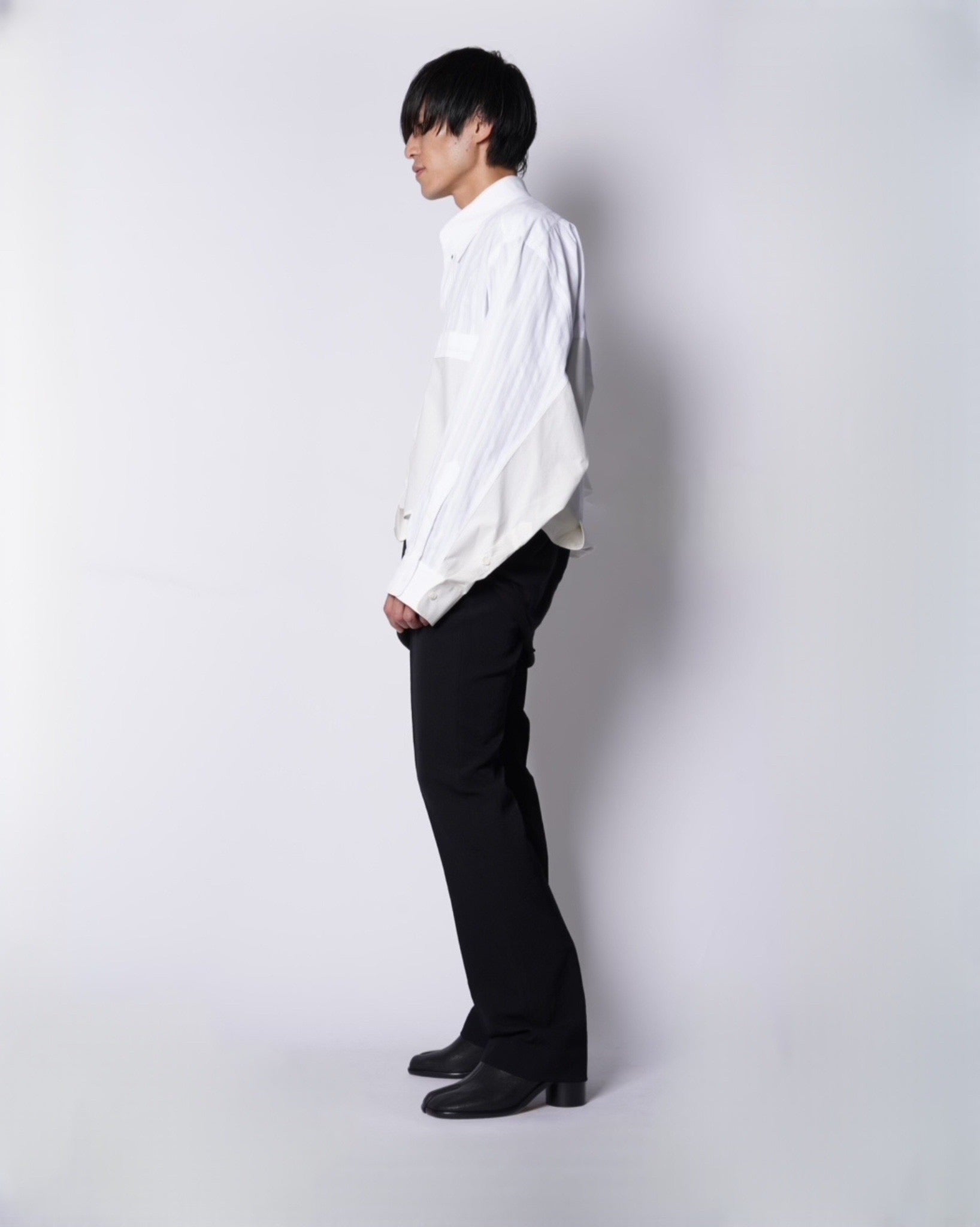 ・異なる素材のシャツを上下でドッキングした、マルタンマルジェラ期のメゾンマルジェラを彷彿とさせる、ユニークな再構築デザイン。