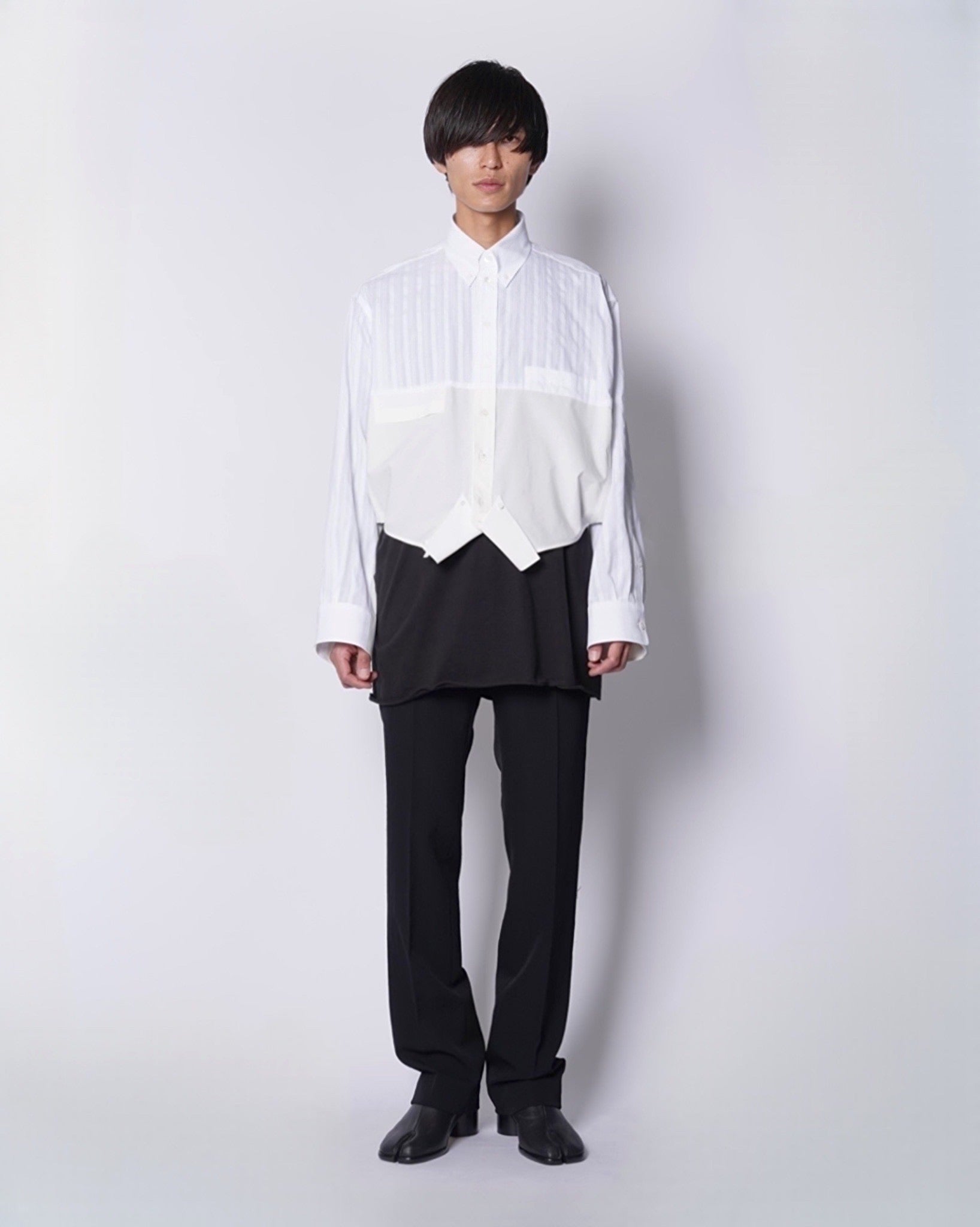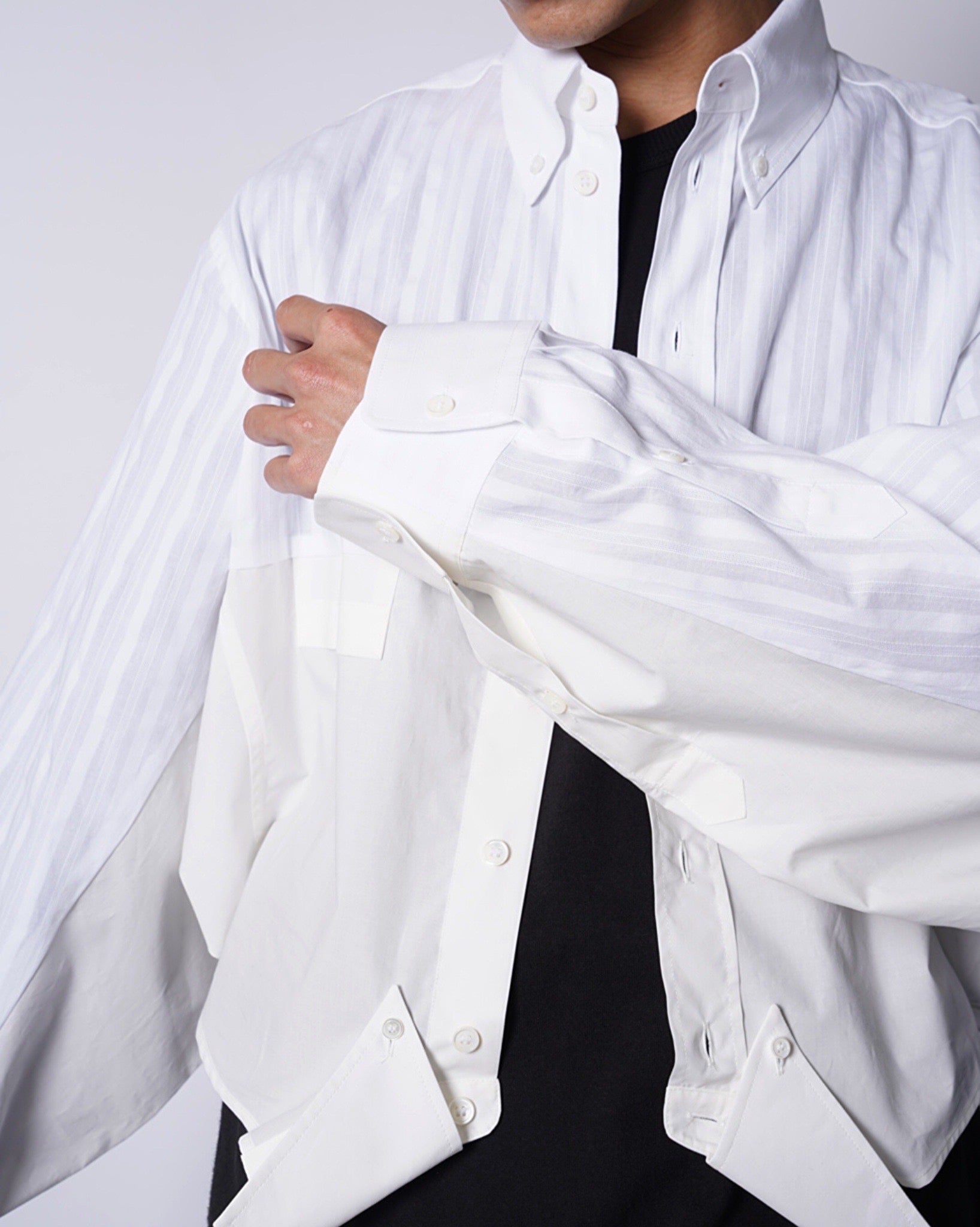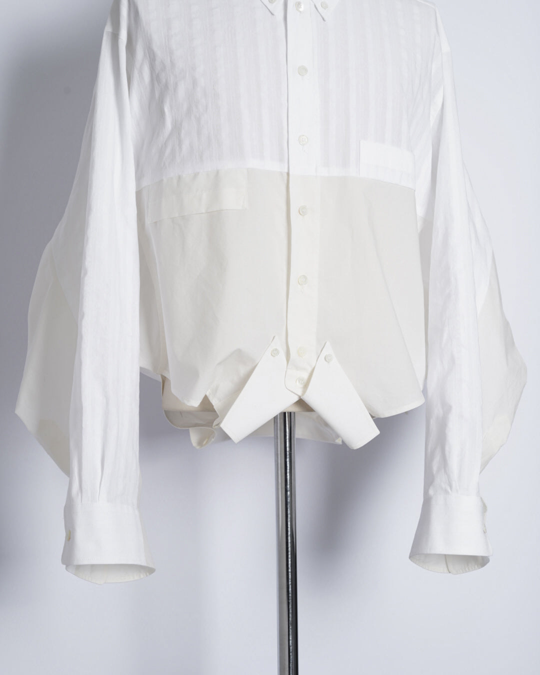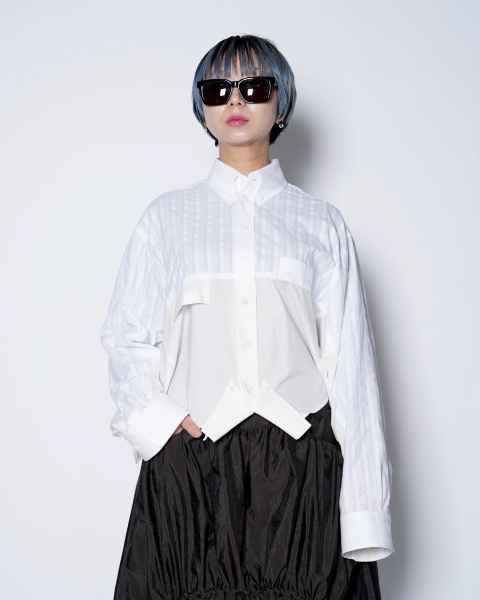 ・異なる素材のシャツを上下でドッキングした、マルタンマルジェラ期のメゾンマルジェラを彷彿とさせる、ユニークな再構築デザイン。