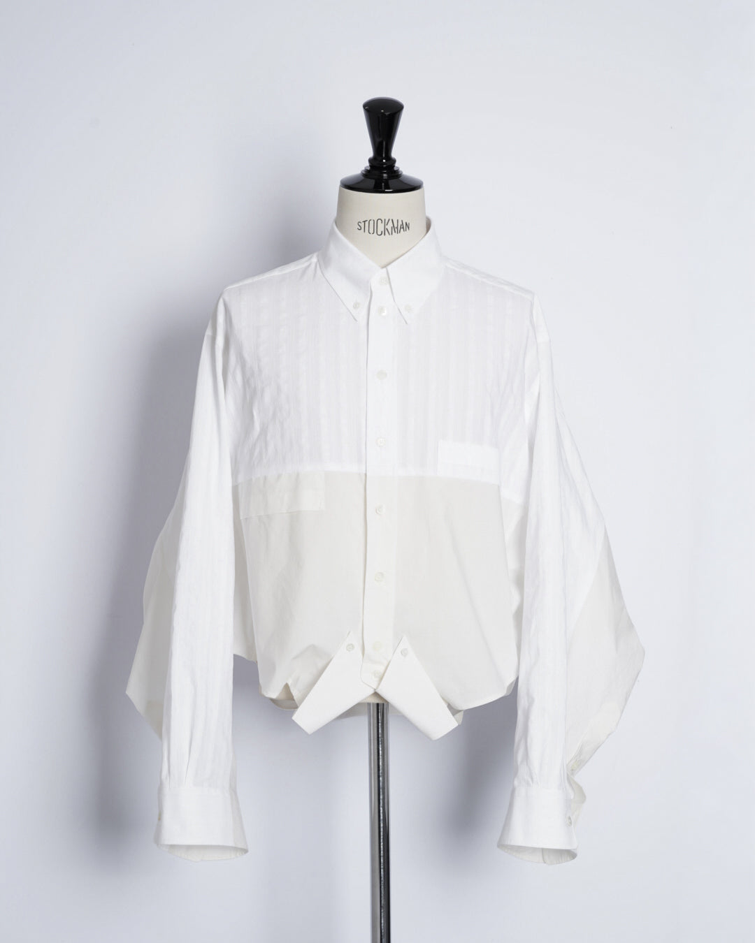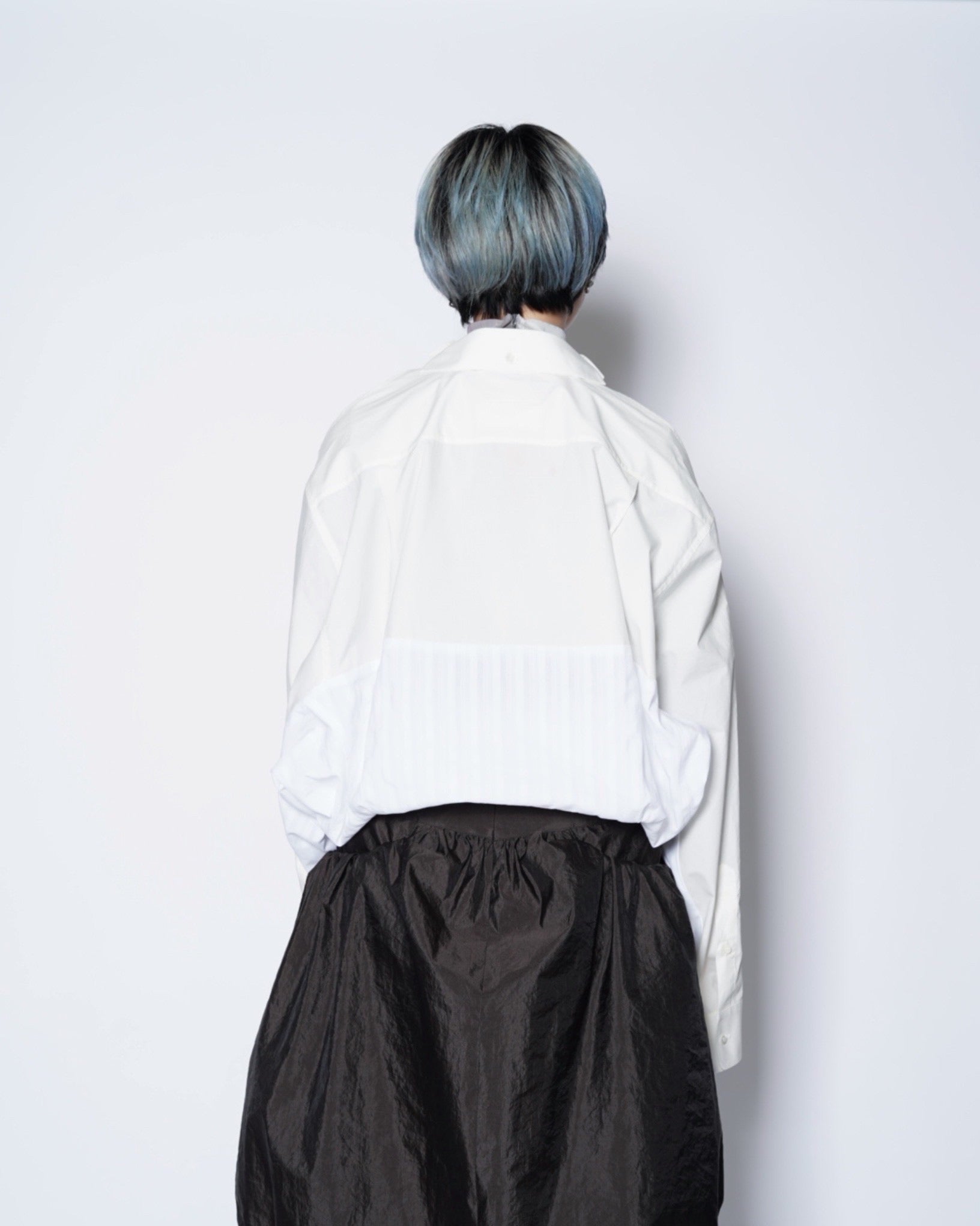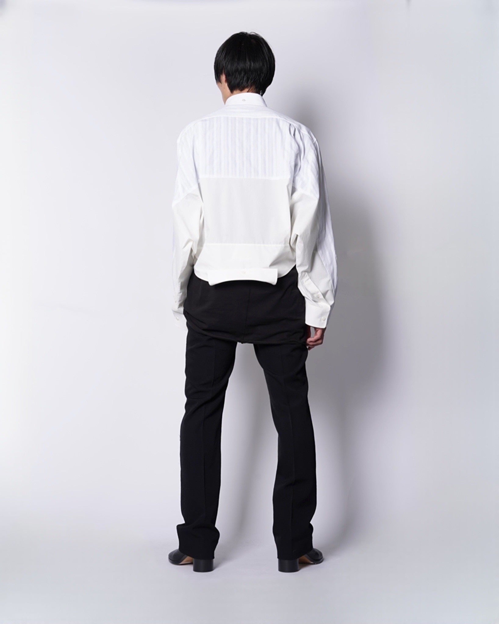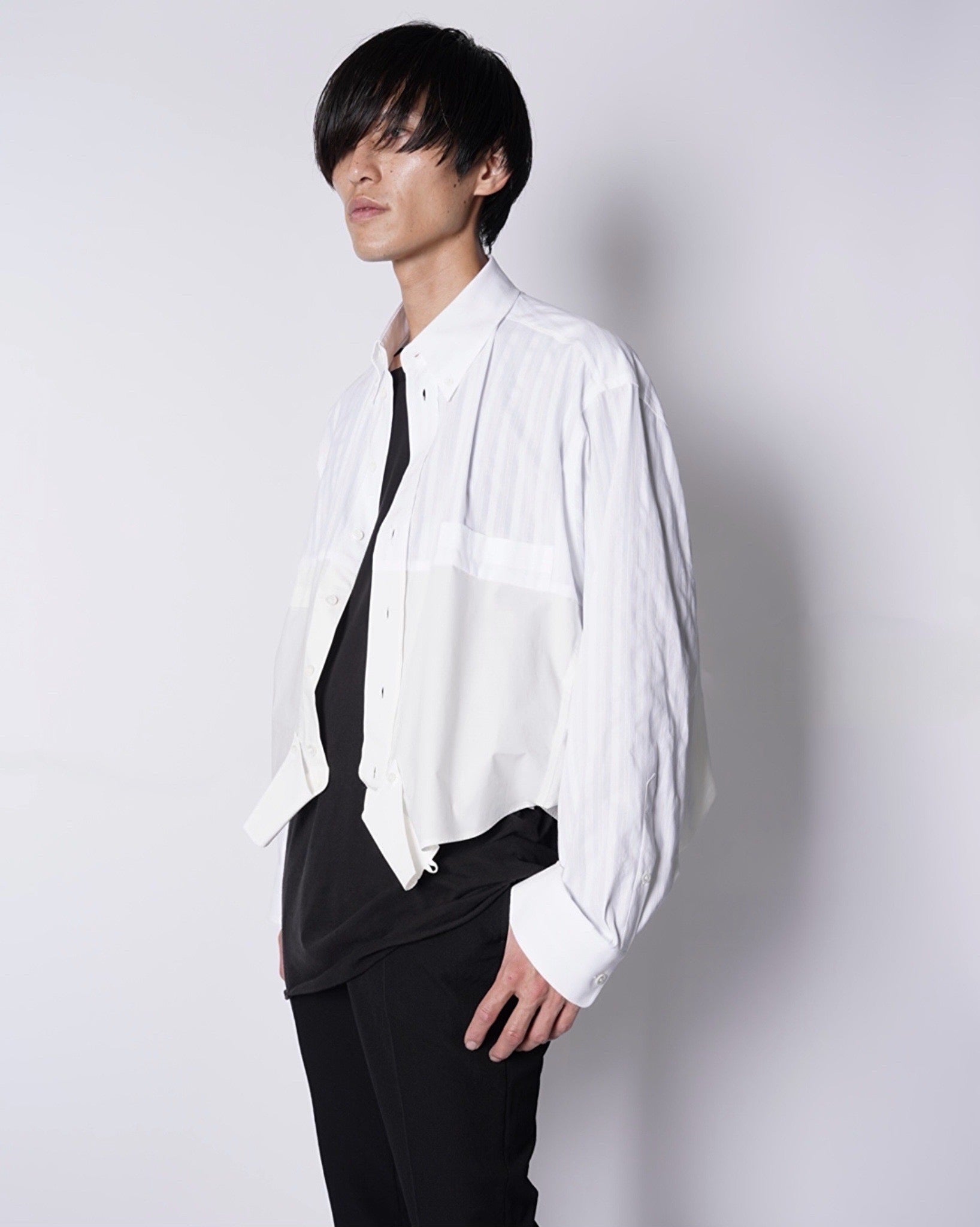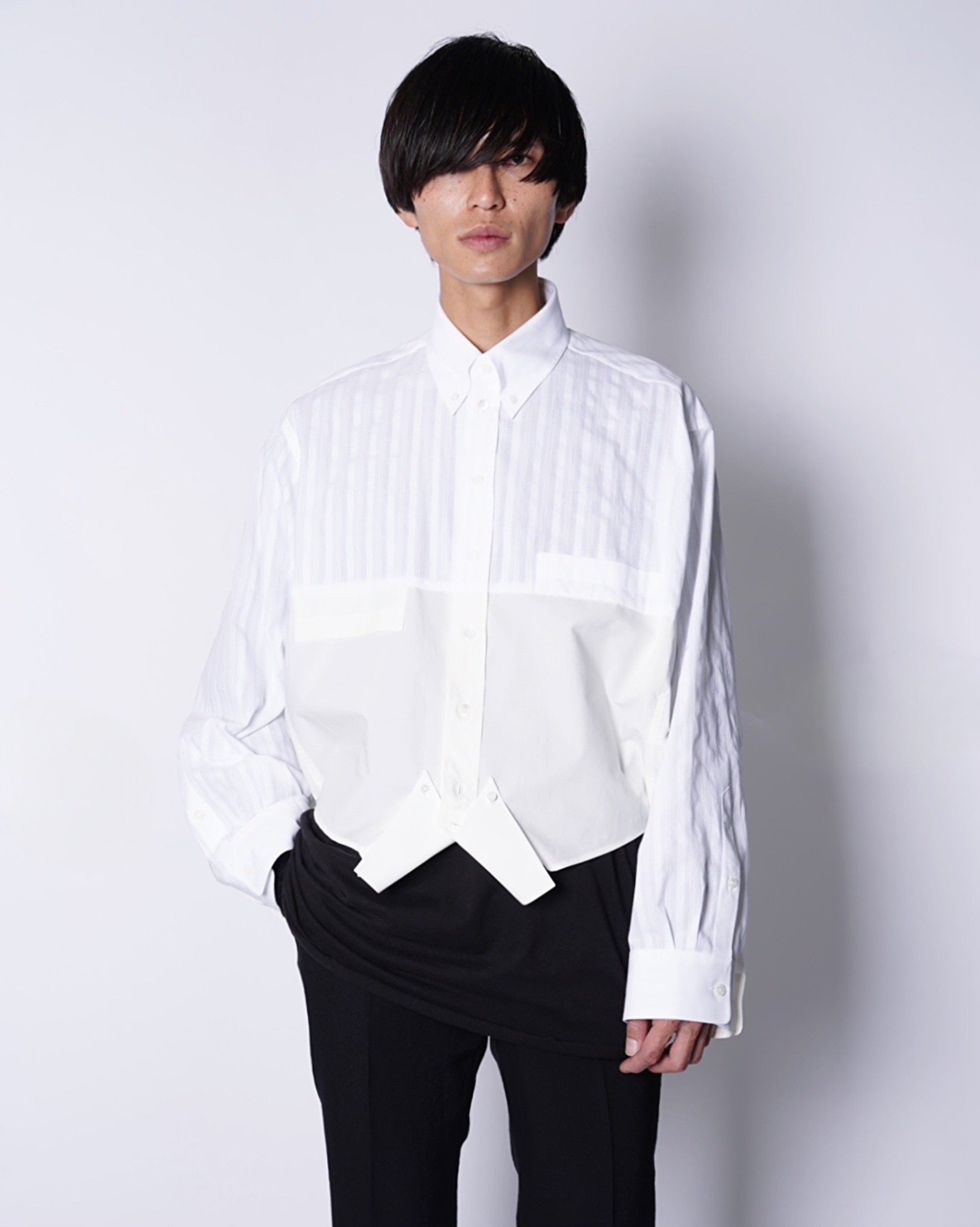 ・異なる素材のシャツを上下でドッキングした、マルタンマルジェラ期のメゾンマルジェラを彷彿とさせる、ユニークな再構築デザイン。