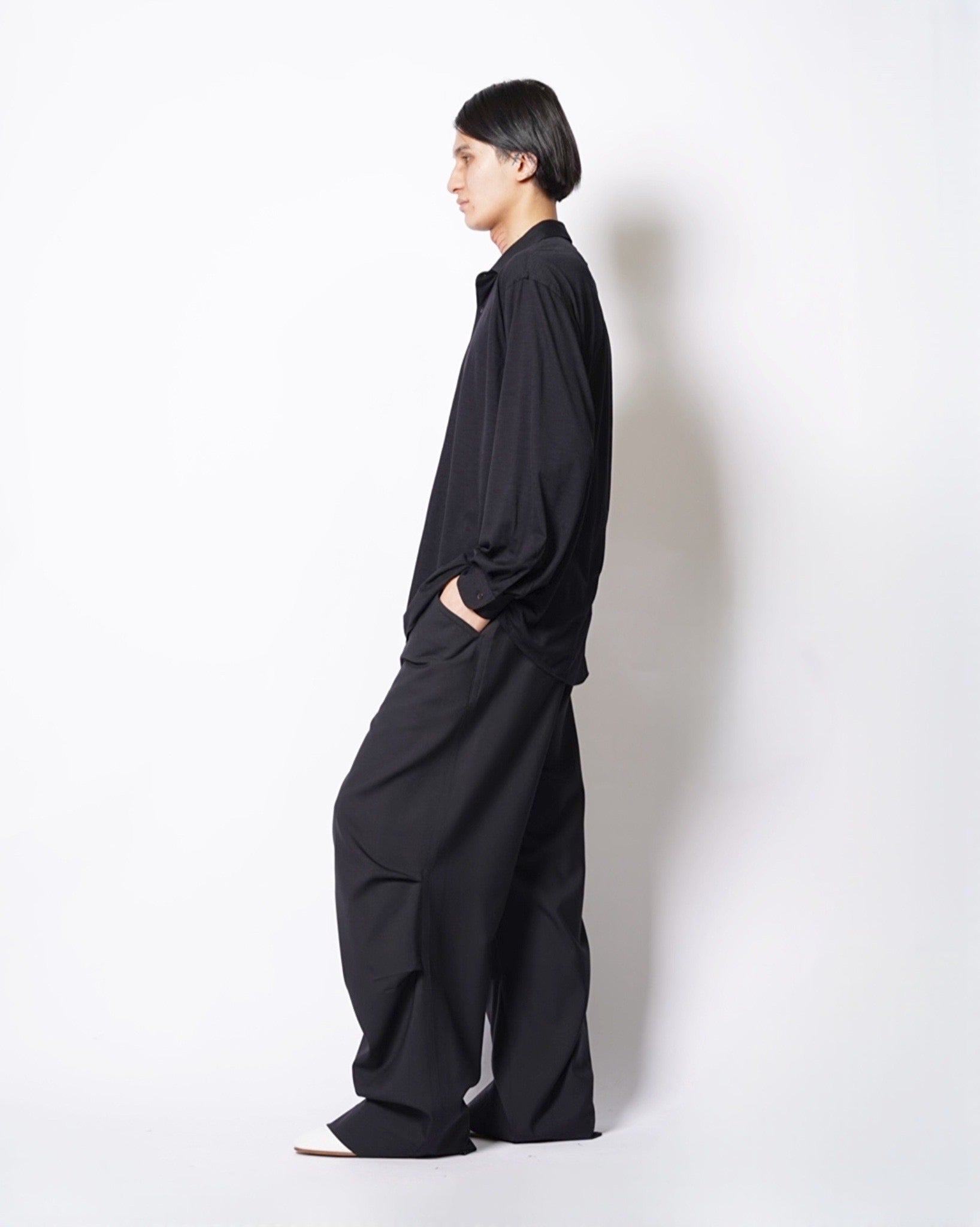 ・裏前立てでプレーンなフロントとなっており、ドレーピーな素材感がフルに活きます。
