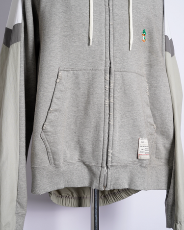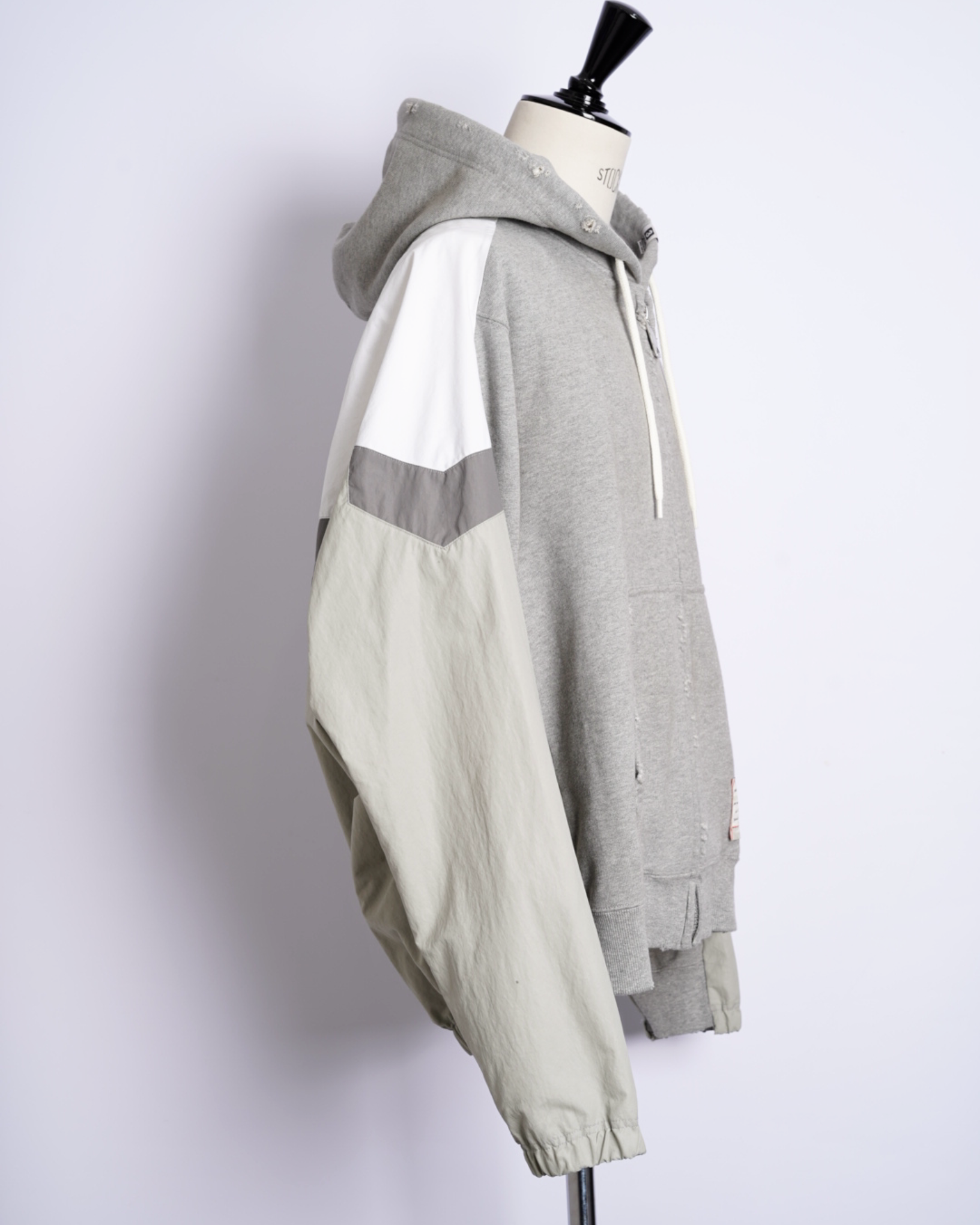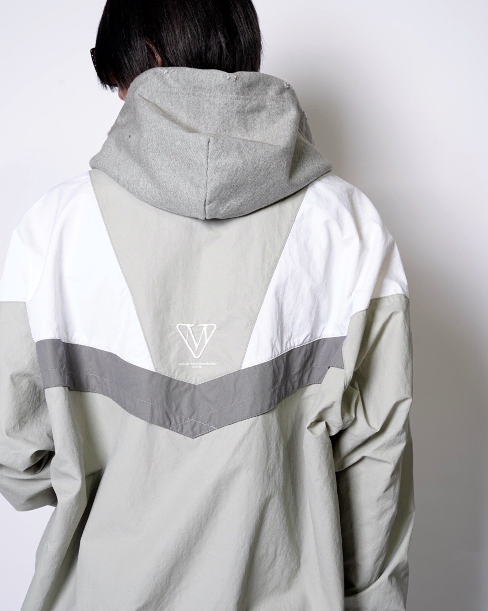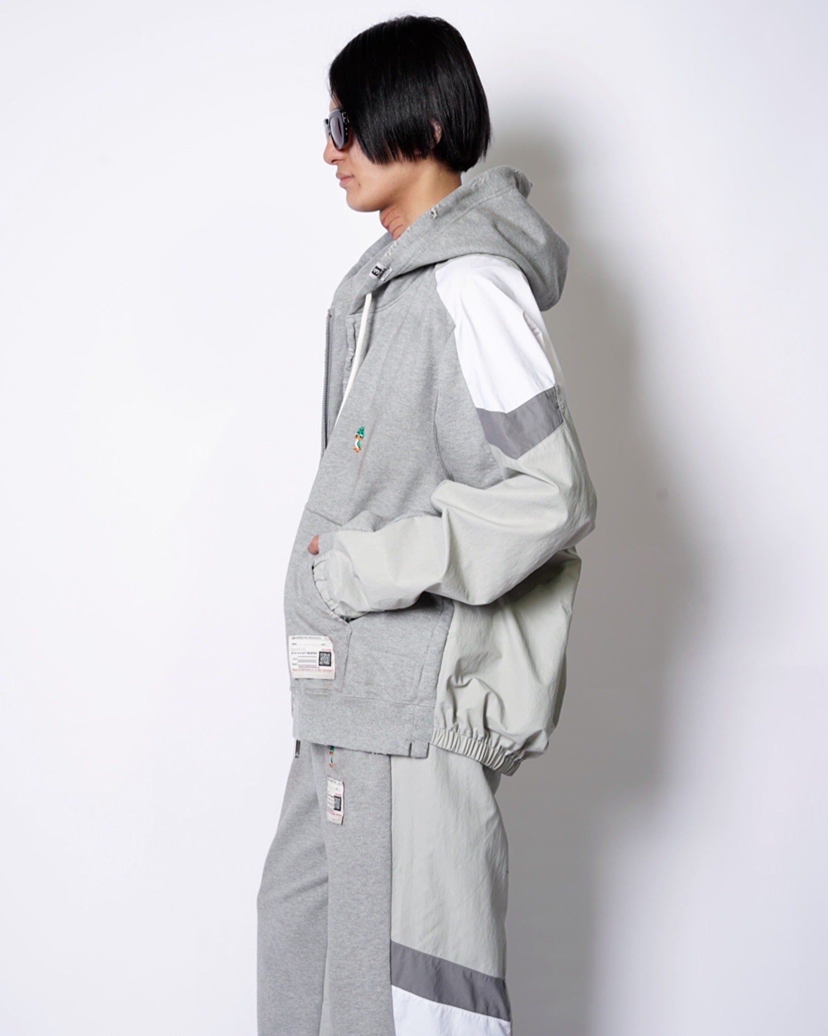 ・フーディーとトラックジャケットをハーフでドッキングした、ミハラヤスヒロらしいユニークで大胆なデザイン。
