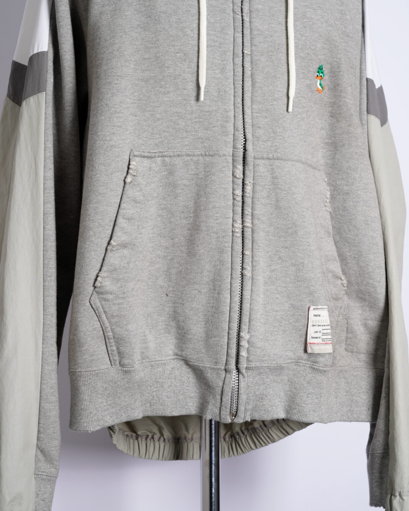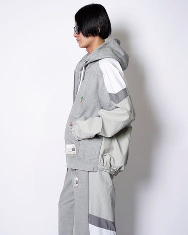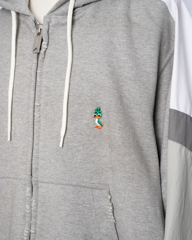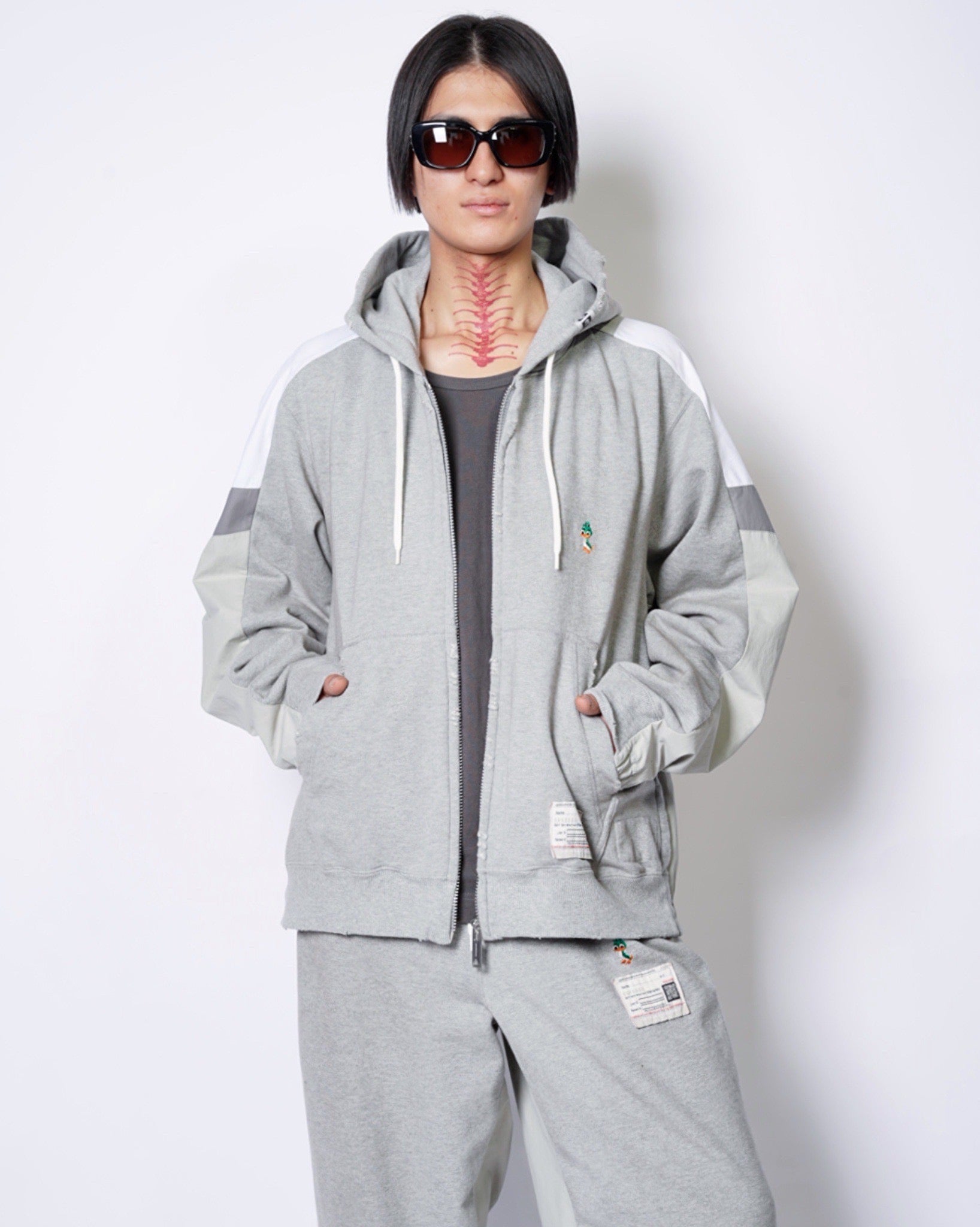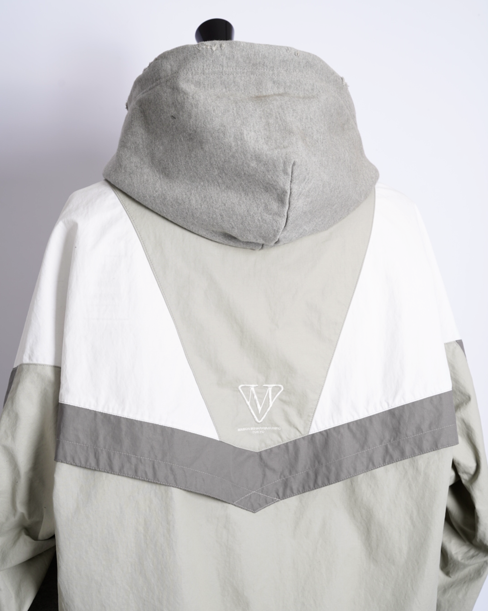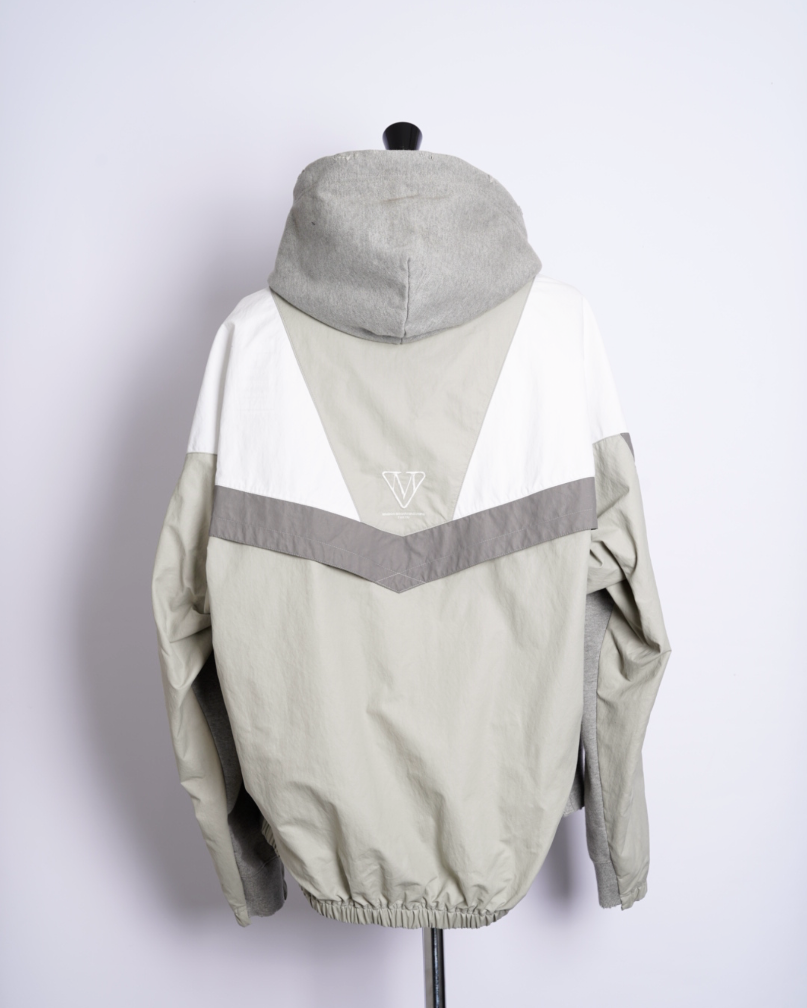 ・フーディーとトラックジャケットをハーフでドッキングした、ミハラヤスヒロらしいユニークで大胆なデザイン。