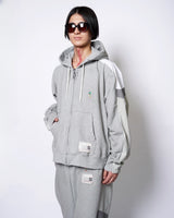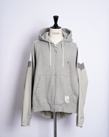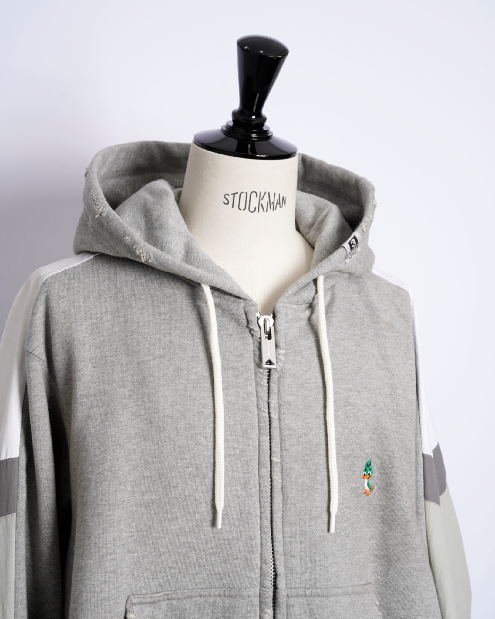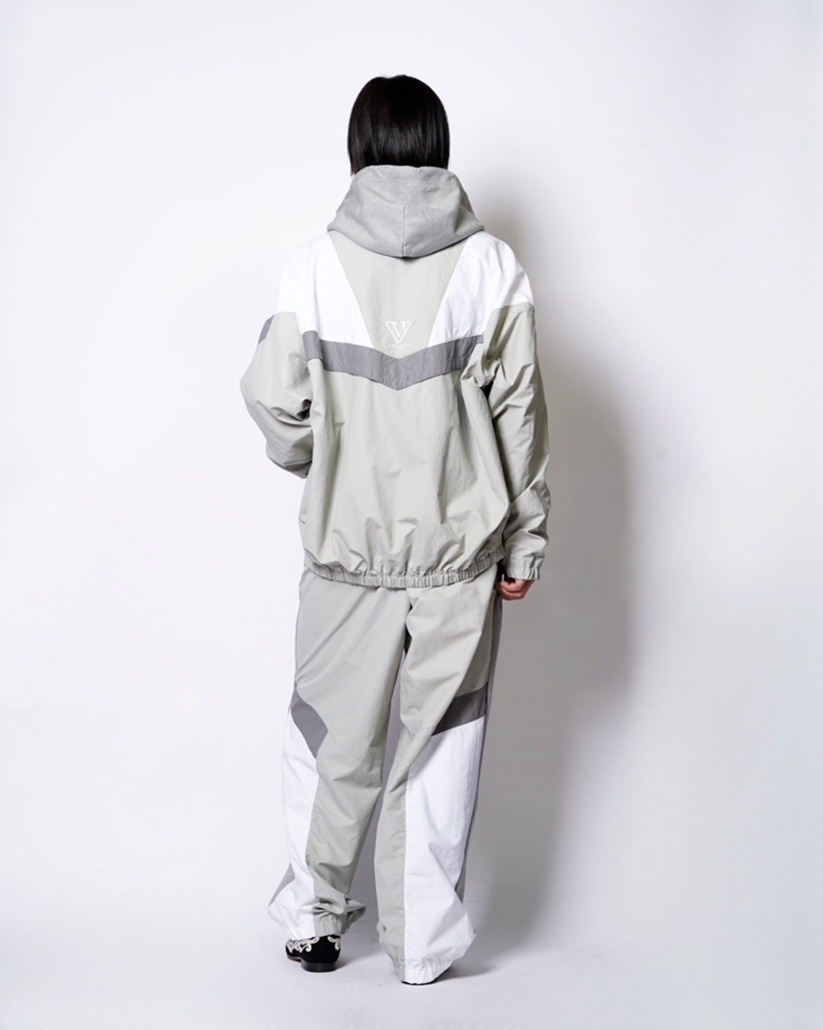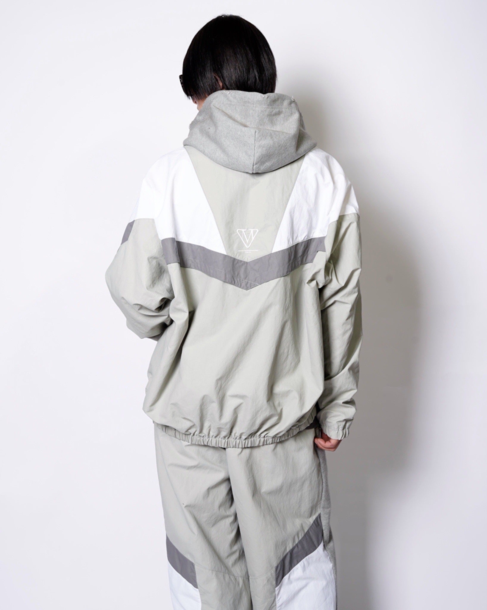 ・フーディーとトラックジャケットをハーフでドッキングした、ミハラヤスヒロらしいユニークで大胆なデザイン。