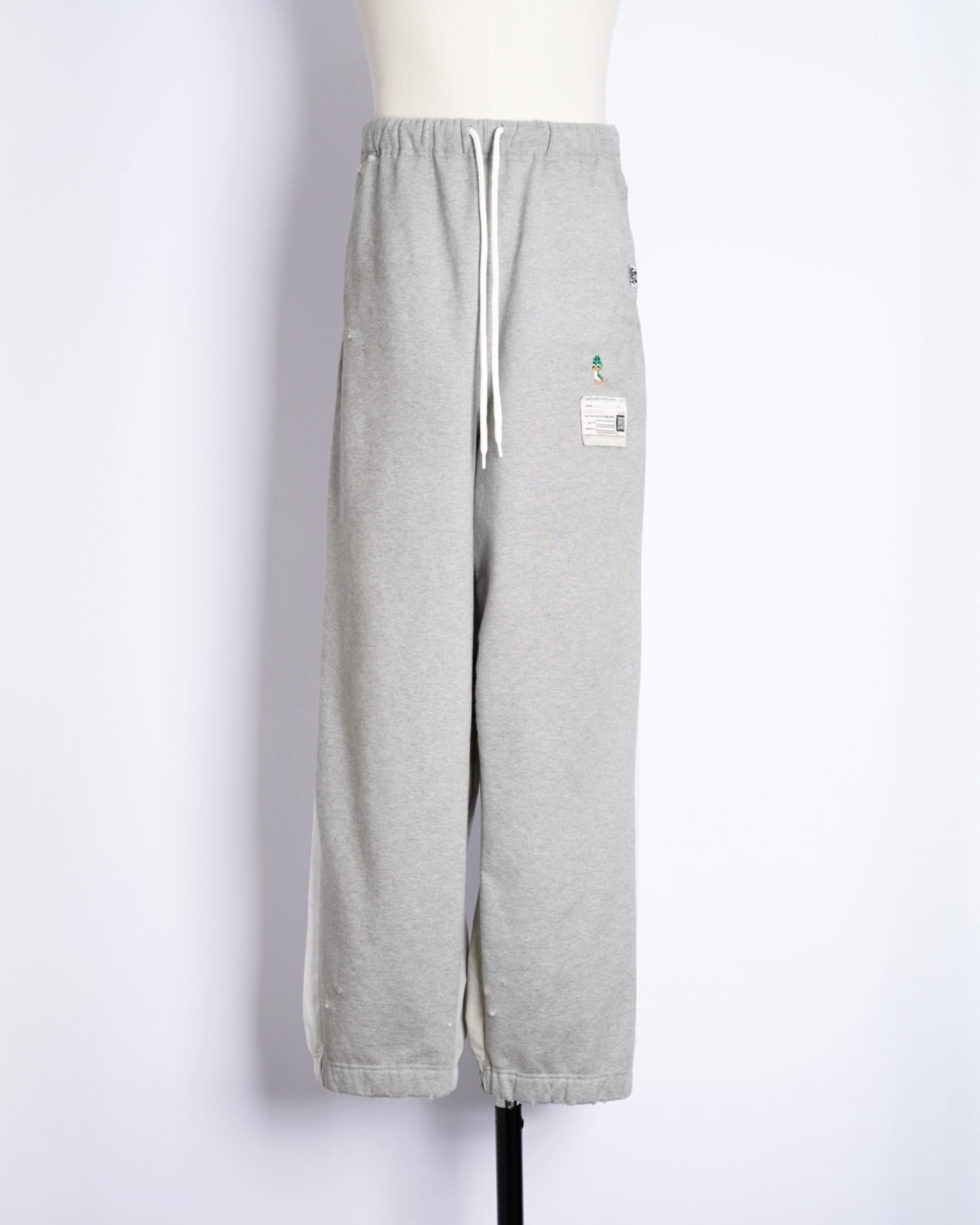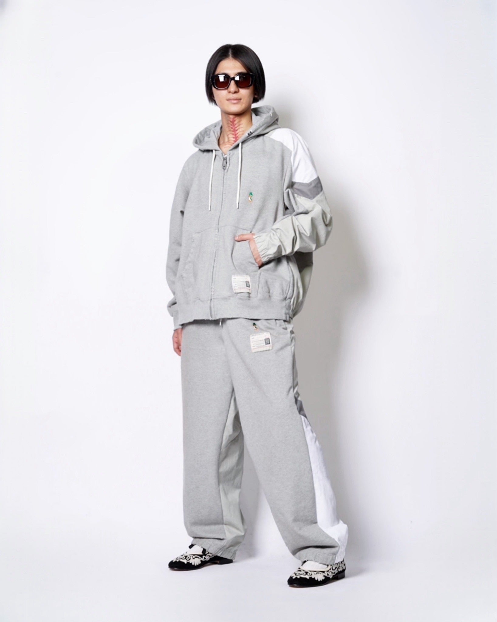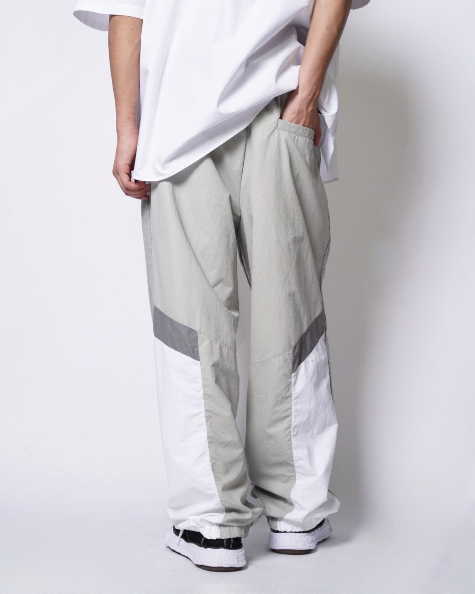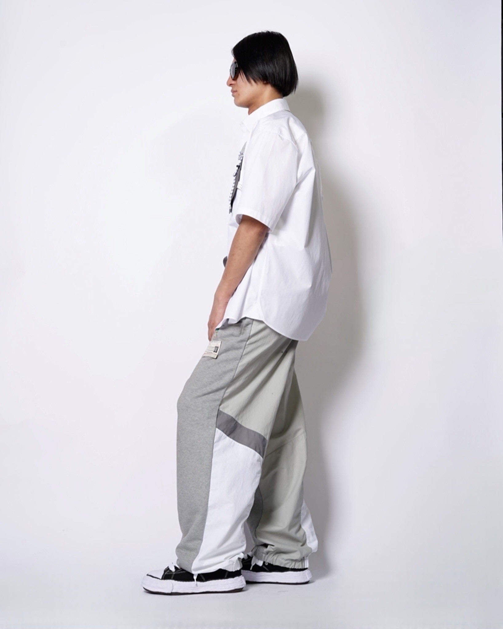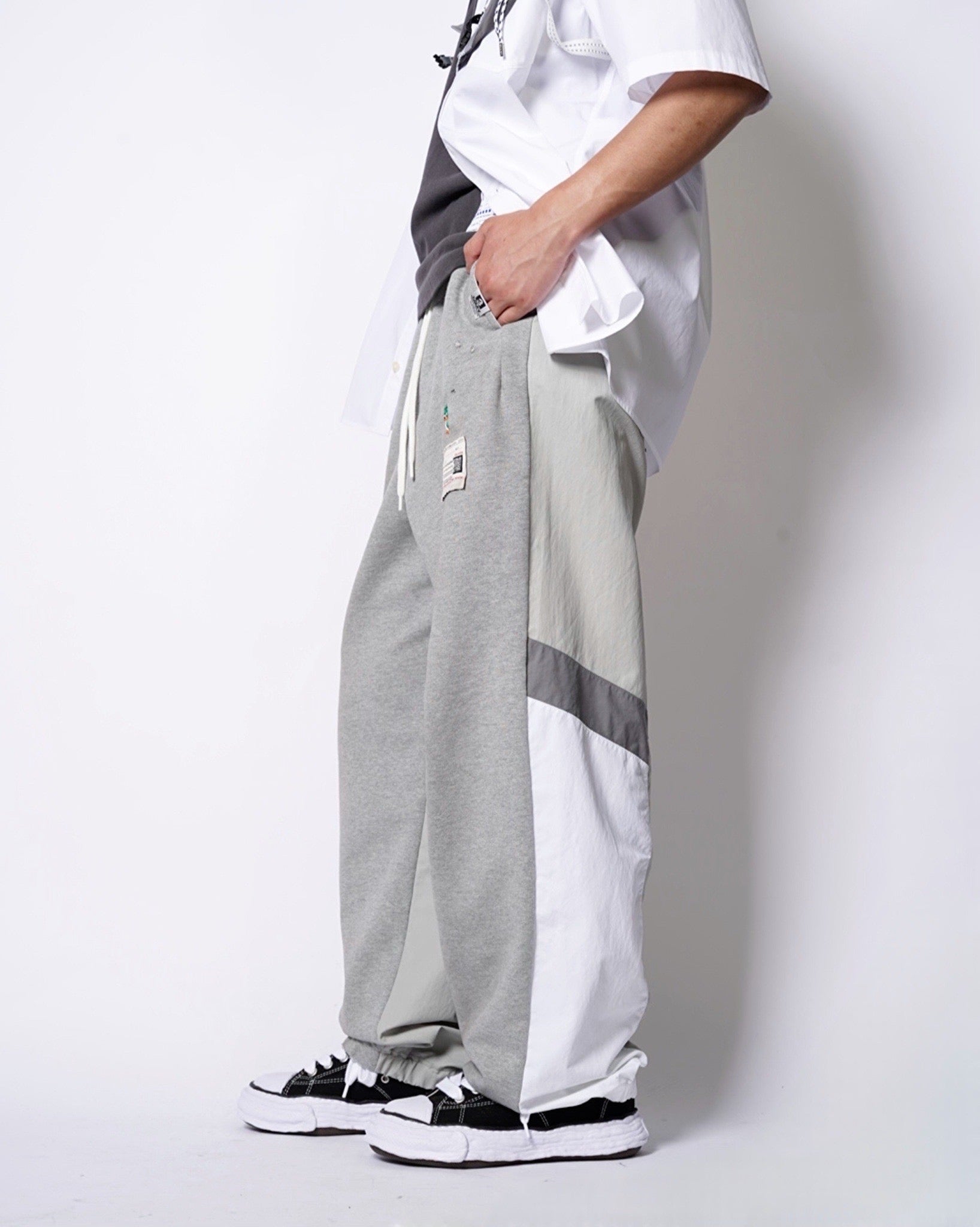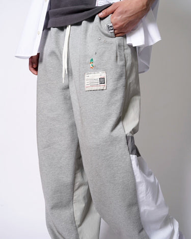 ・スウェットパンツとトラックジャケットをハーフでドッキングした、ミハラヤスヒロらしいユニークで大胆なデザイン。