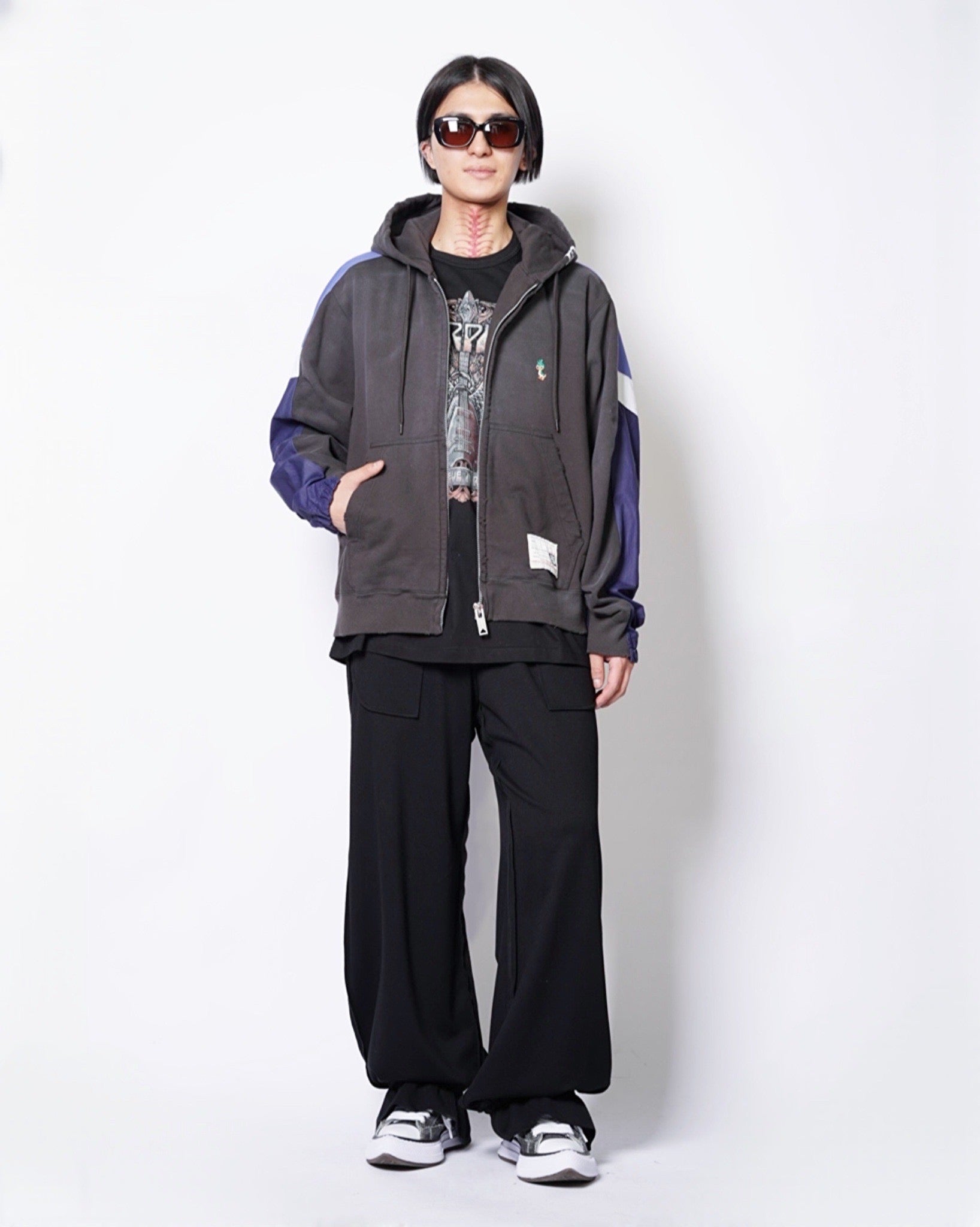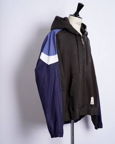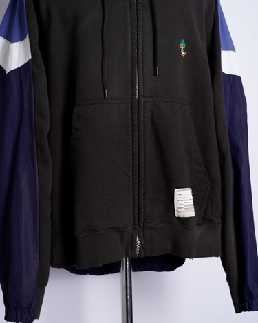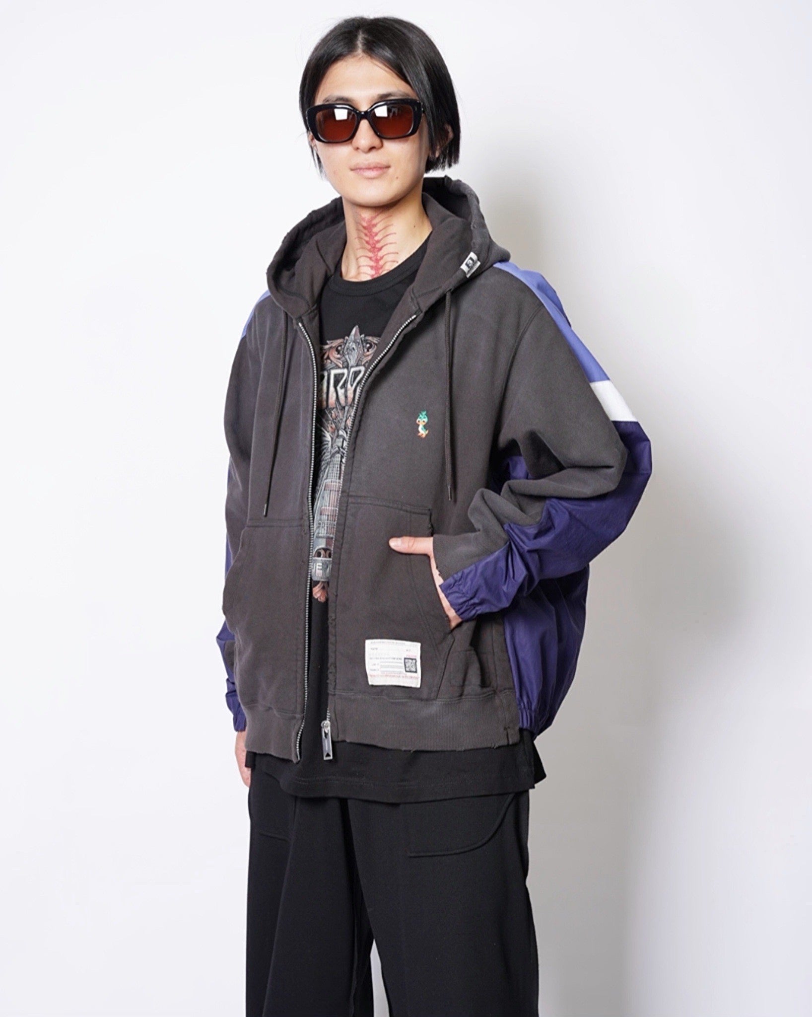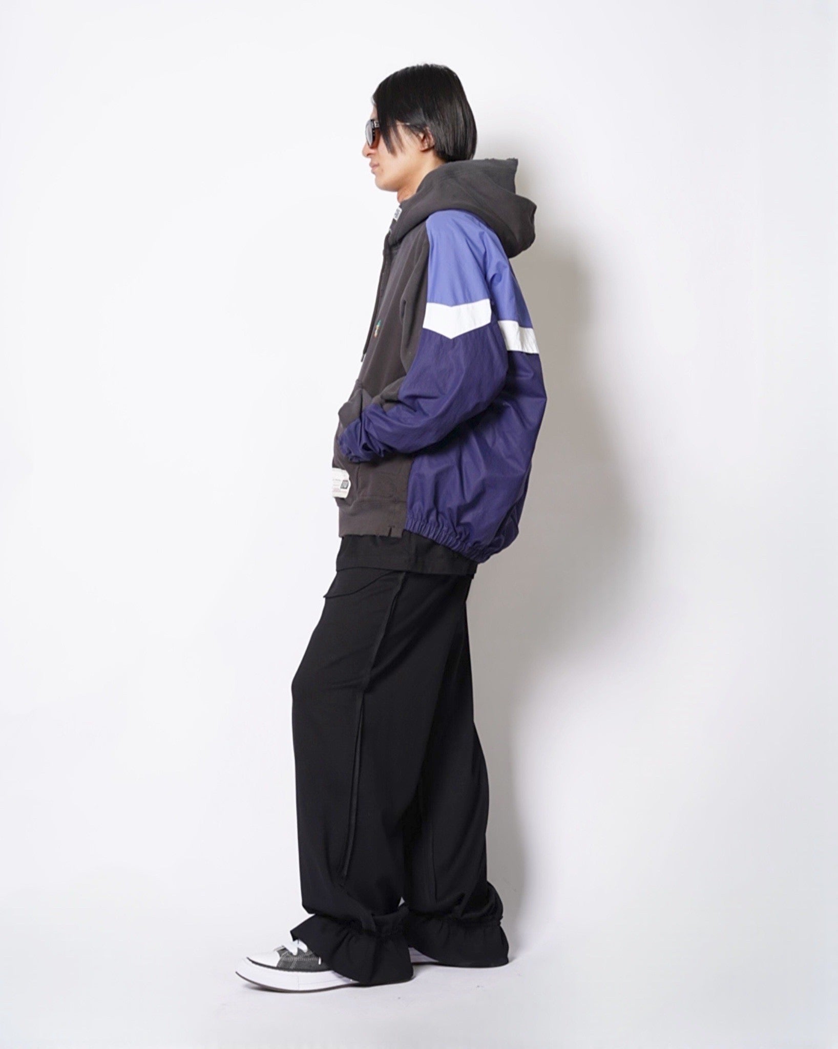 ・フーディーとトラックジャケットをハーフでドッキングした、ミハラヤスヒロらしいユニークで大胆なデザイン。