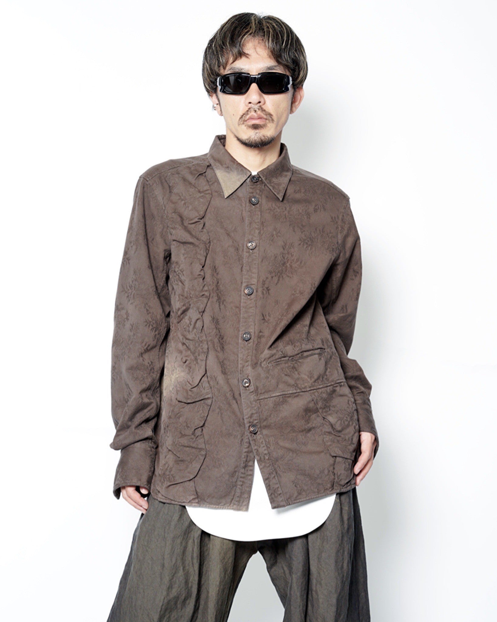 ・フロント両サイドの波打つ生地のドッキングも特徴的で、ジャガードの色柄も合わさり見るほどに引き込まれる表情を生み出しています。