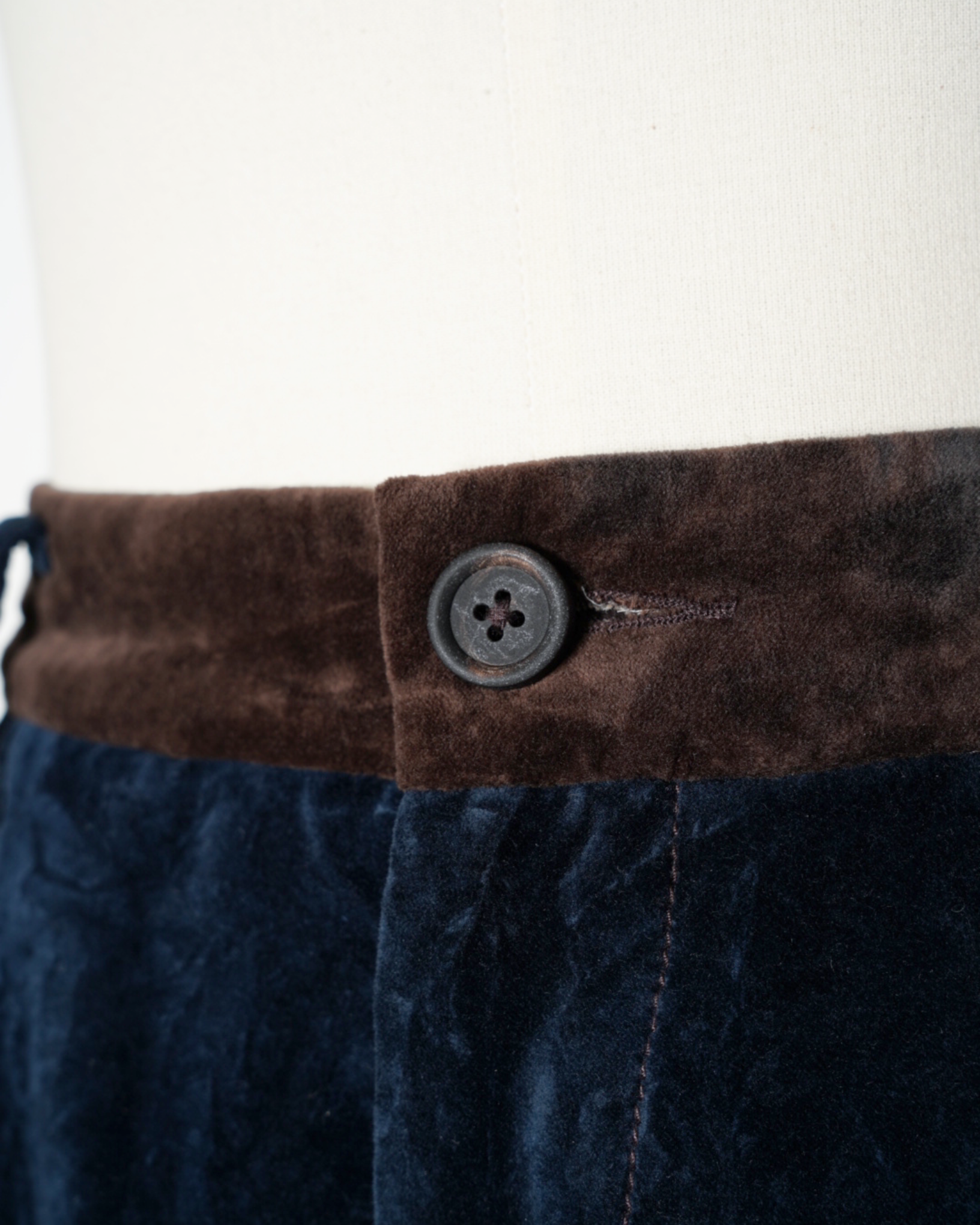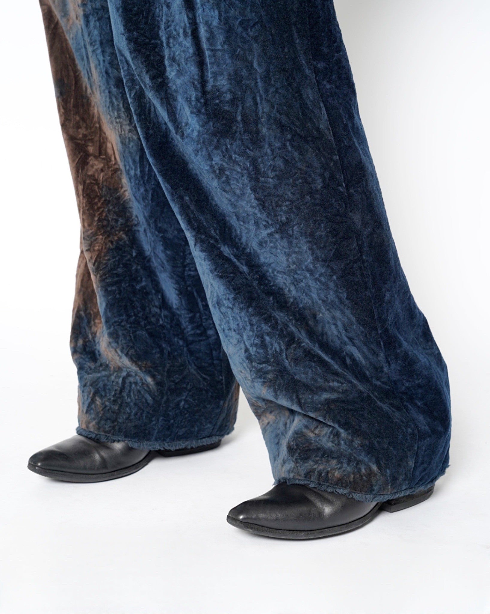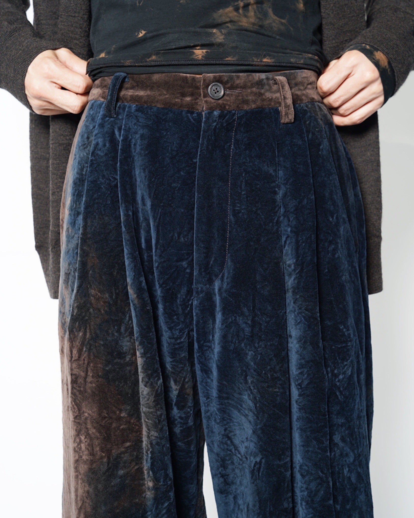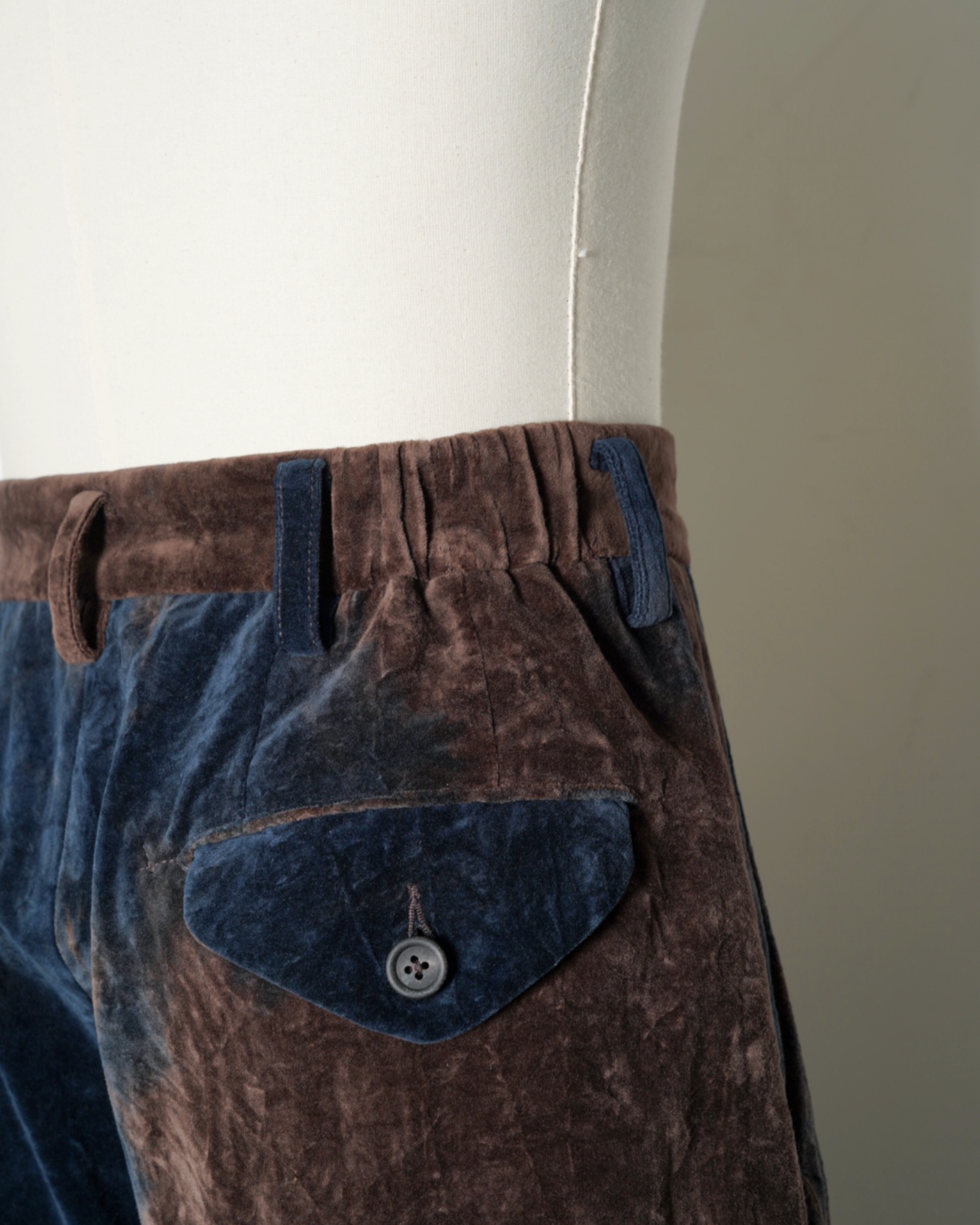・ブルーとブラウンのダブルダイのベルベット素材がデザインの肝となっており、陰影豊かなシワ感やまばらな色の混ざり合いが、美しくも力強い奥行きをもたらしています。