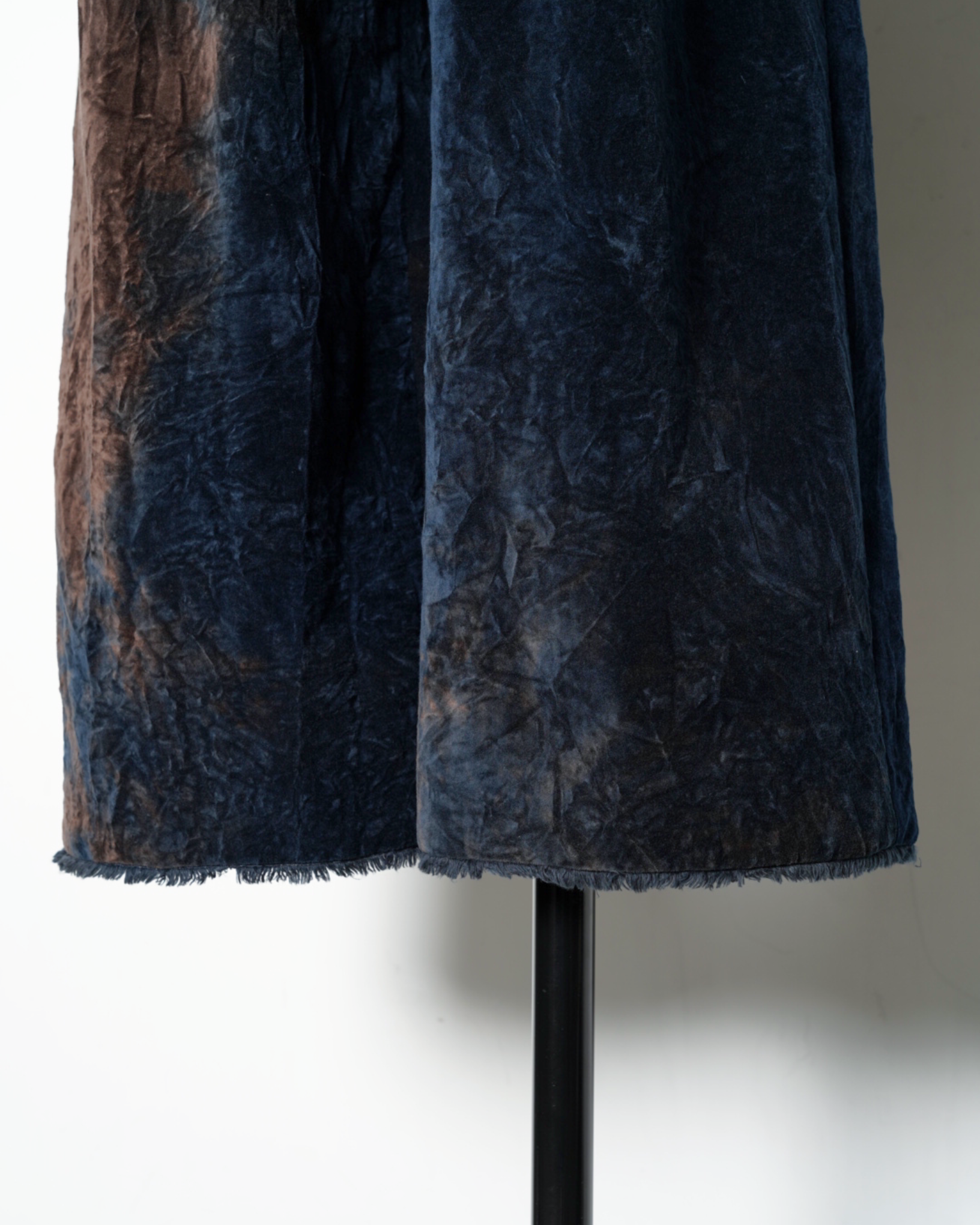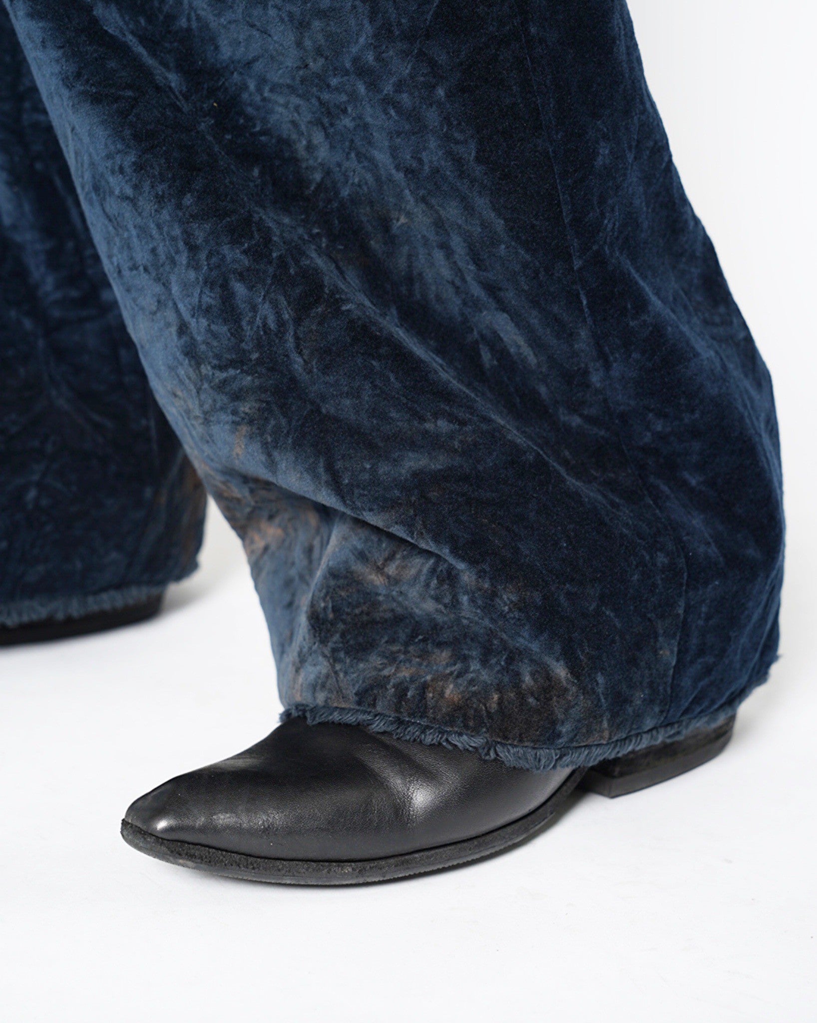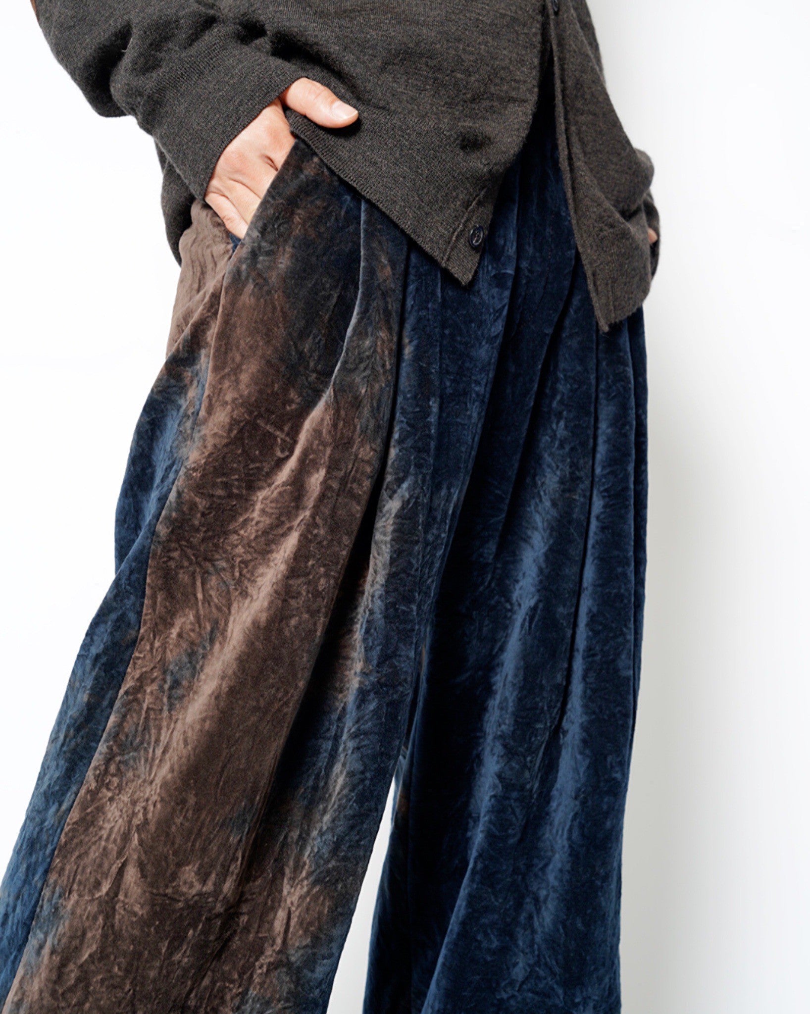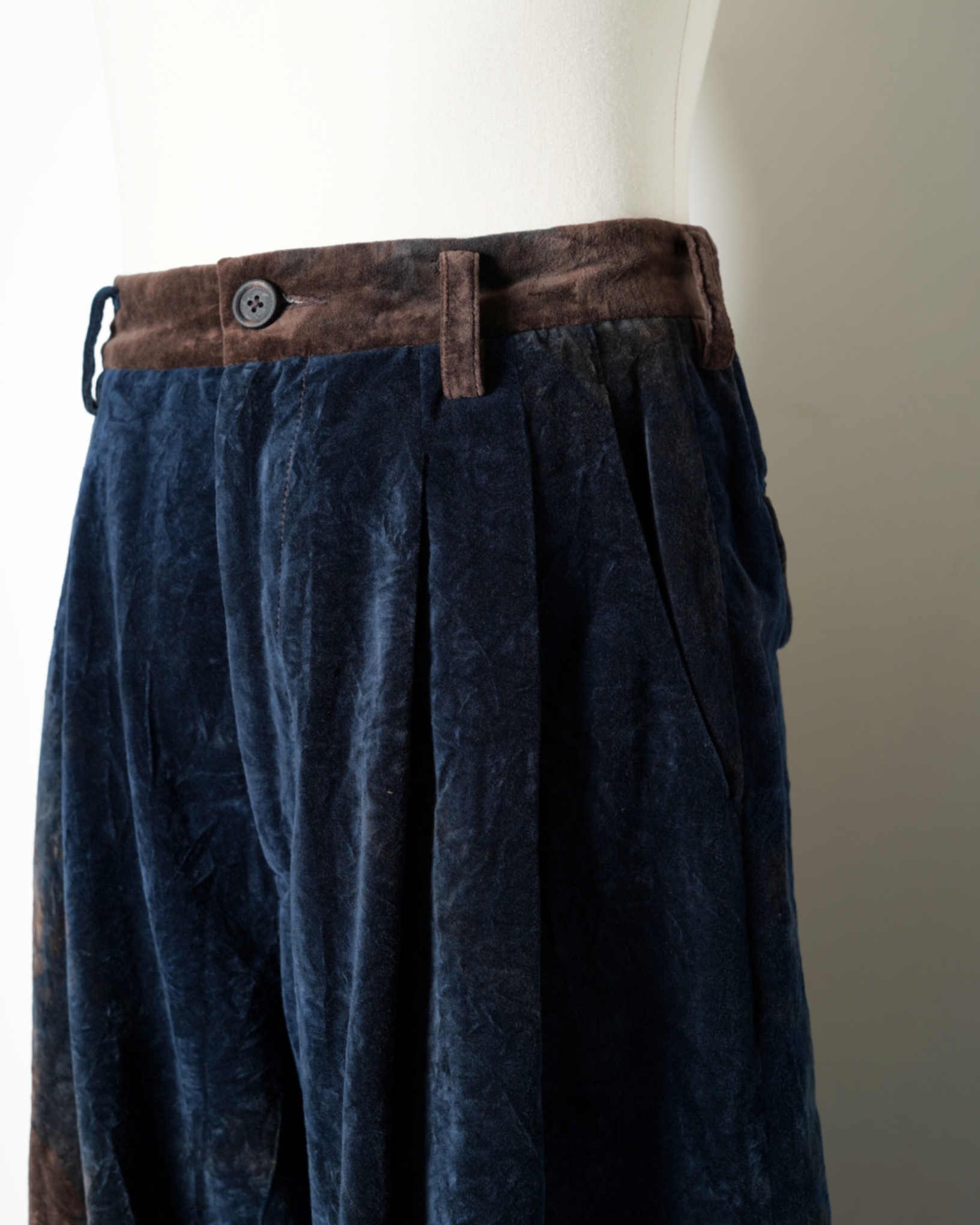 ・ブルーとブラウンのダブルダイのベルベット素材がデザインの肝となっており、陰影豊かなシワ感やまばらな色の混ざり合いが、美しくも力強い奥行きをもたらしています。