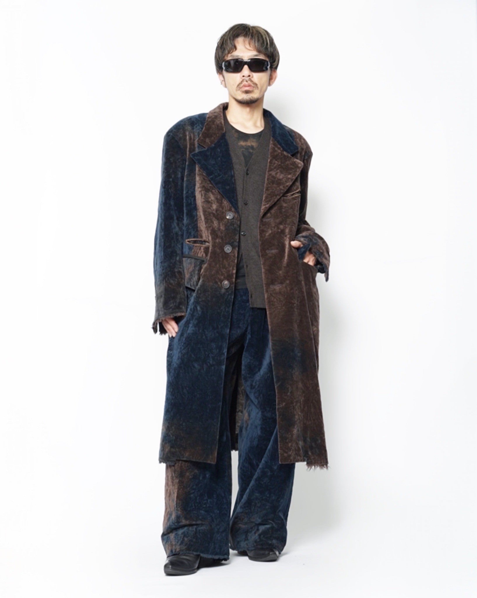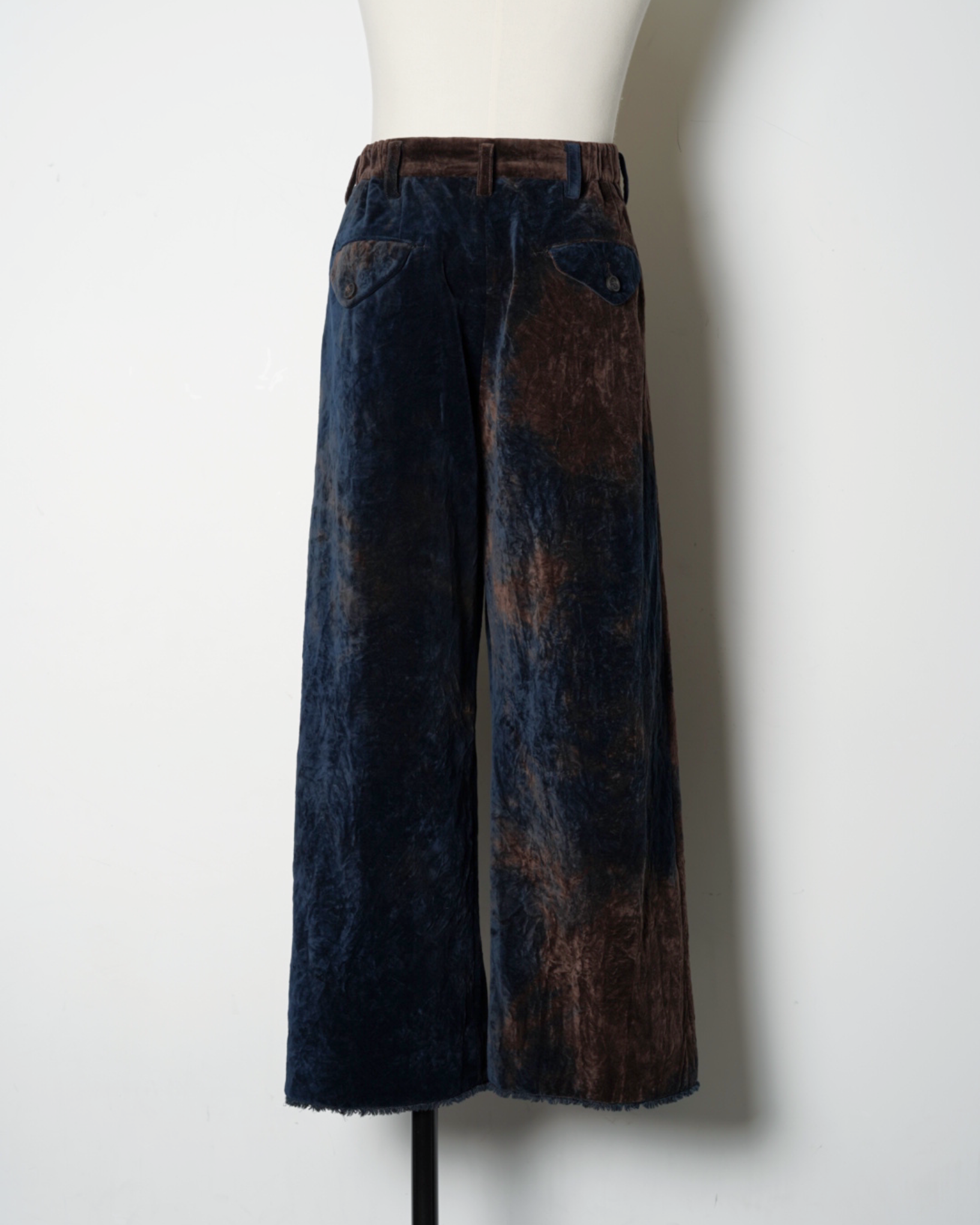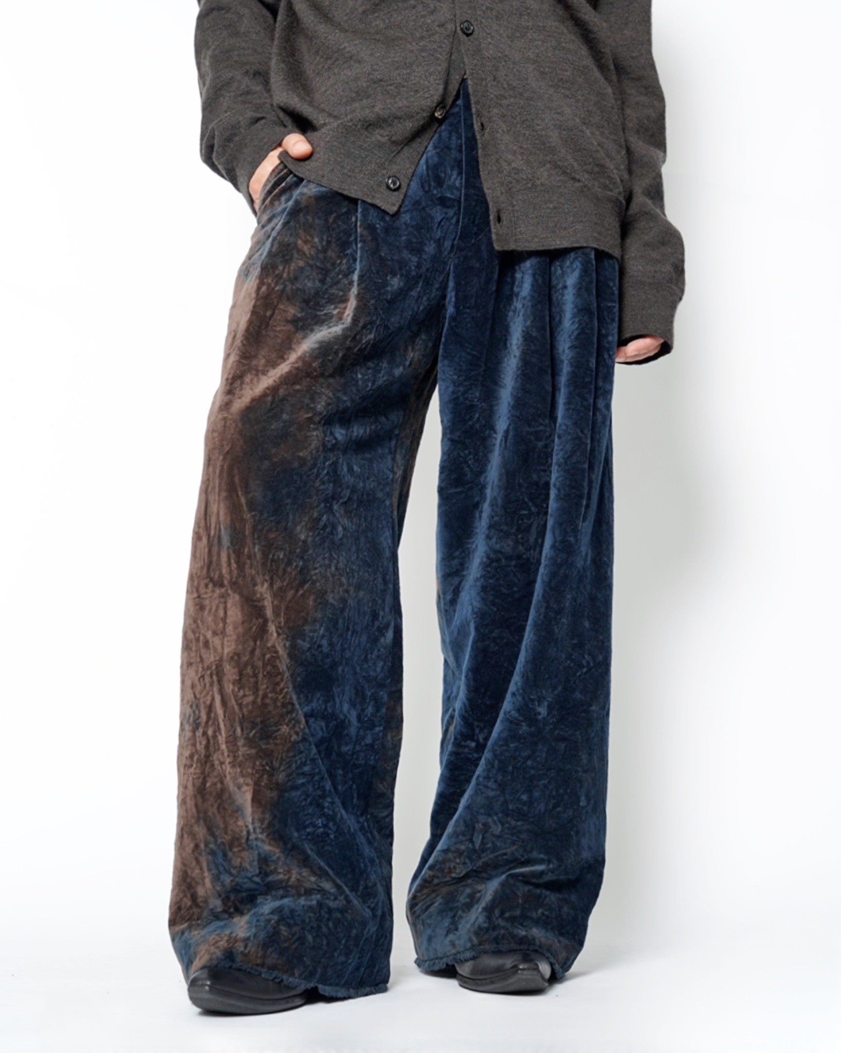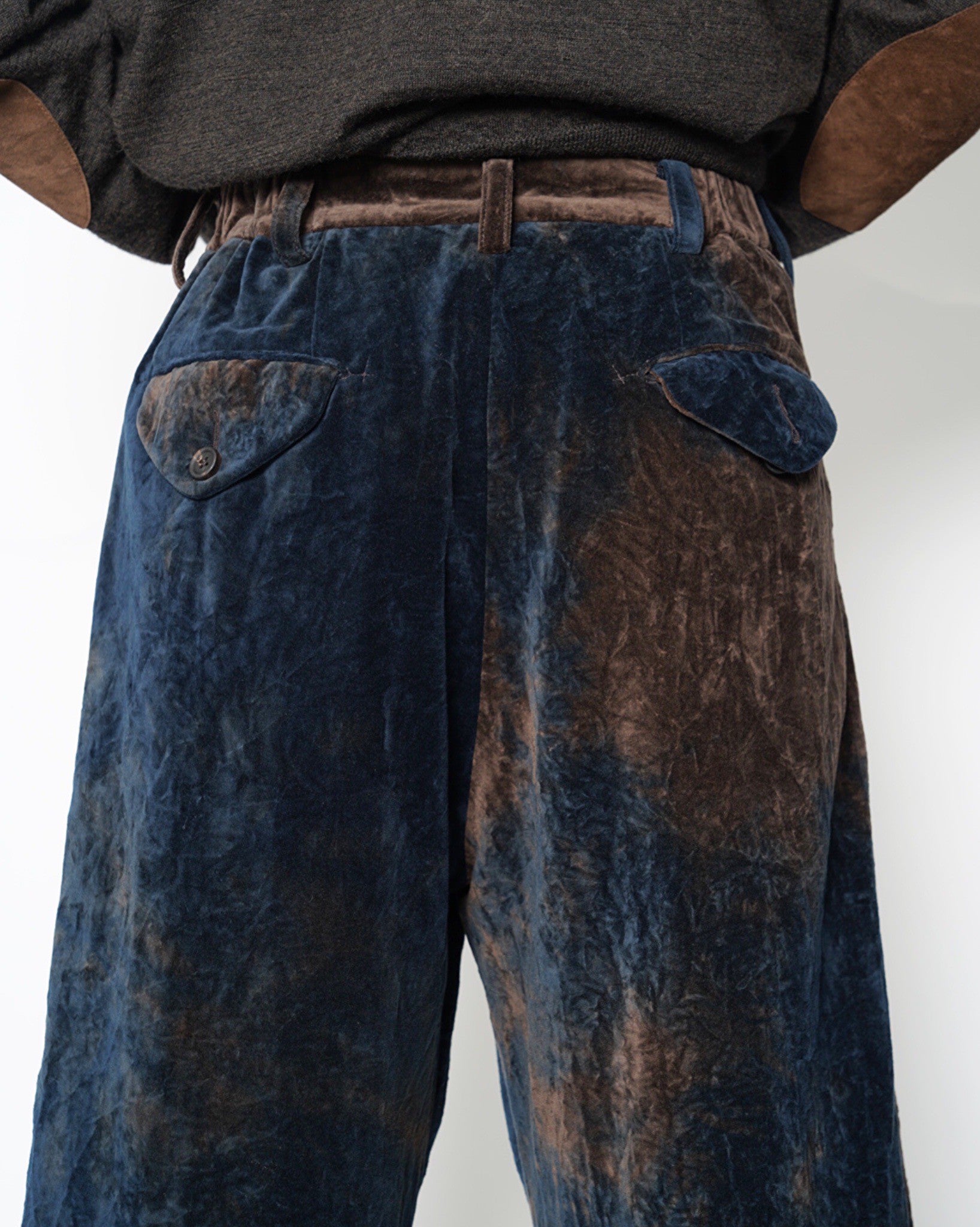 ・ブルーとブラウンのダブルダイのベルベット素材がデザインの肝となっており、陰影豊かなシワ感やまばらな色の混ざり合いが、美しくも力強い奥行きをもたらしています。
