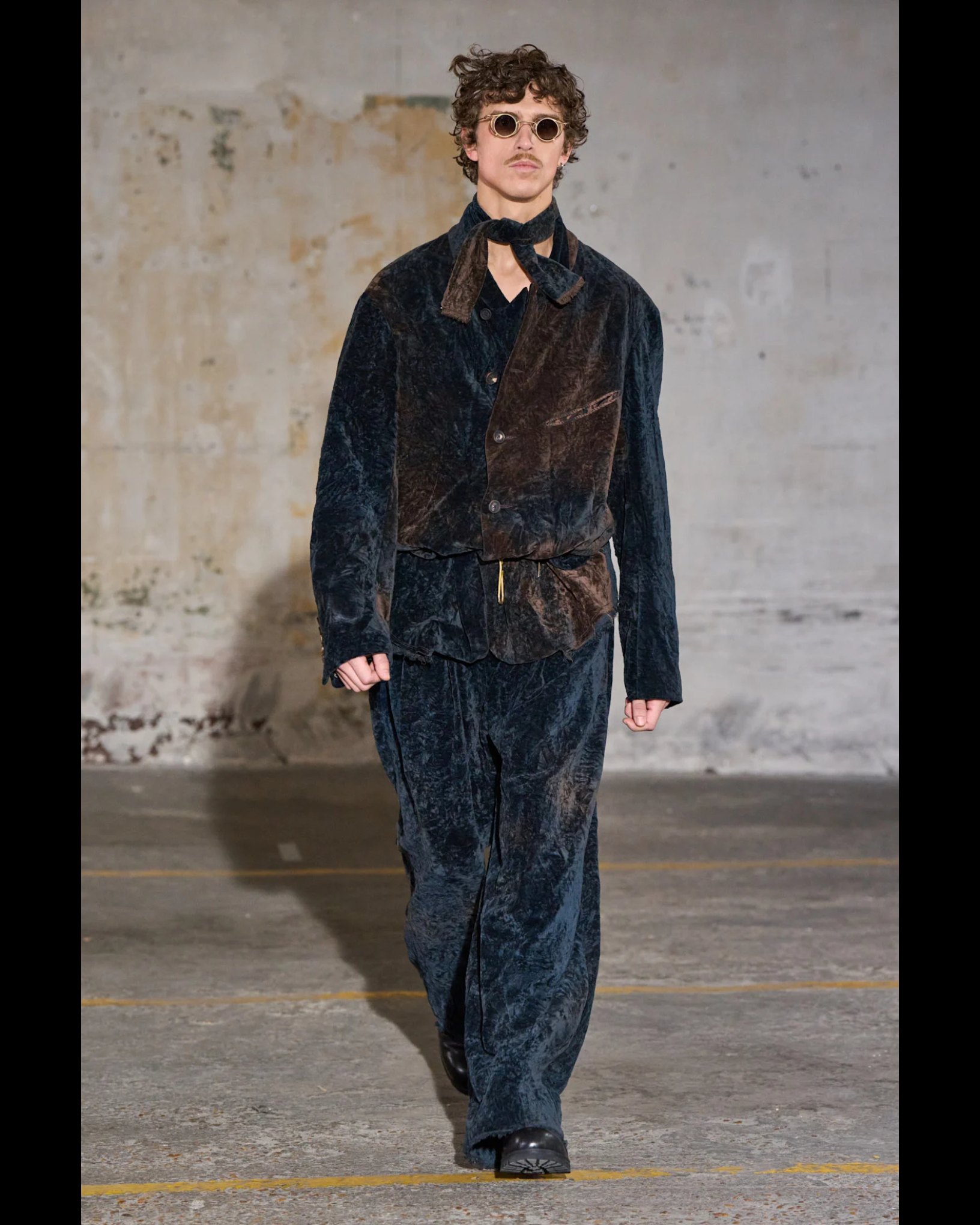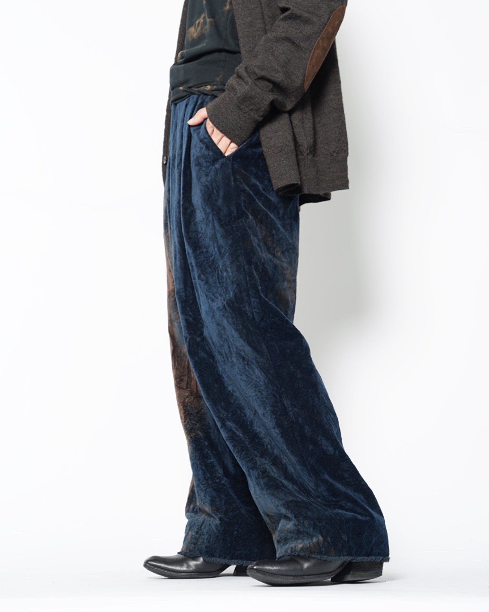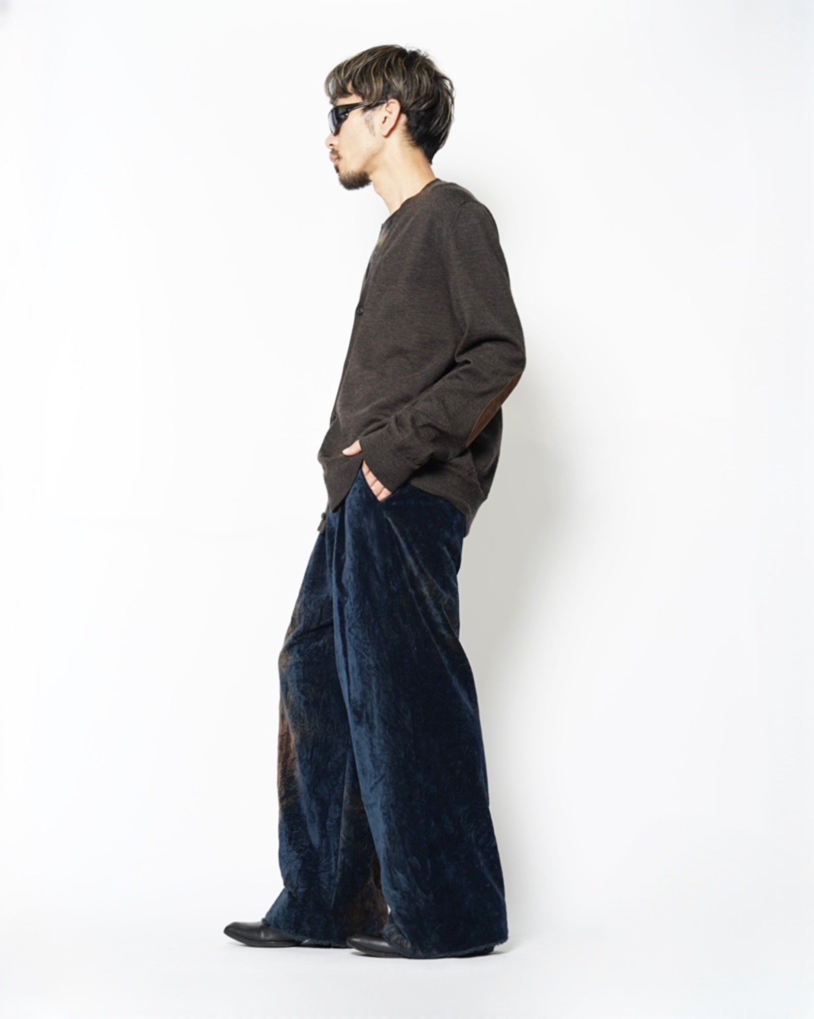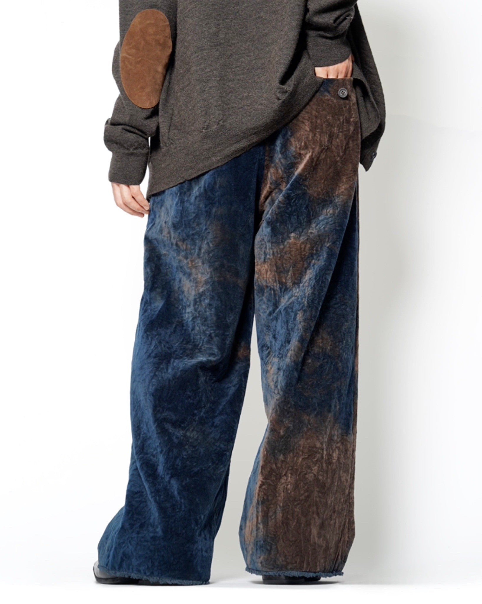 ・ブルーとブラウンのダブルダイのベルベット素材がデザインの肝となっており、陰影豊かなシワ感やまばらな色の混ざり合いが、美しくも力強い奥行きをもたらしています。