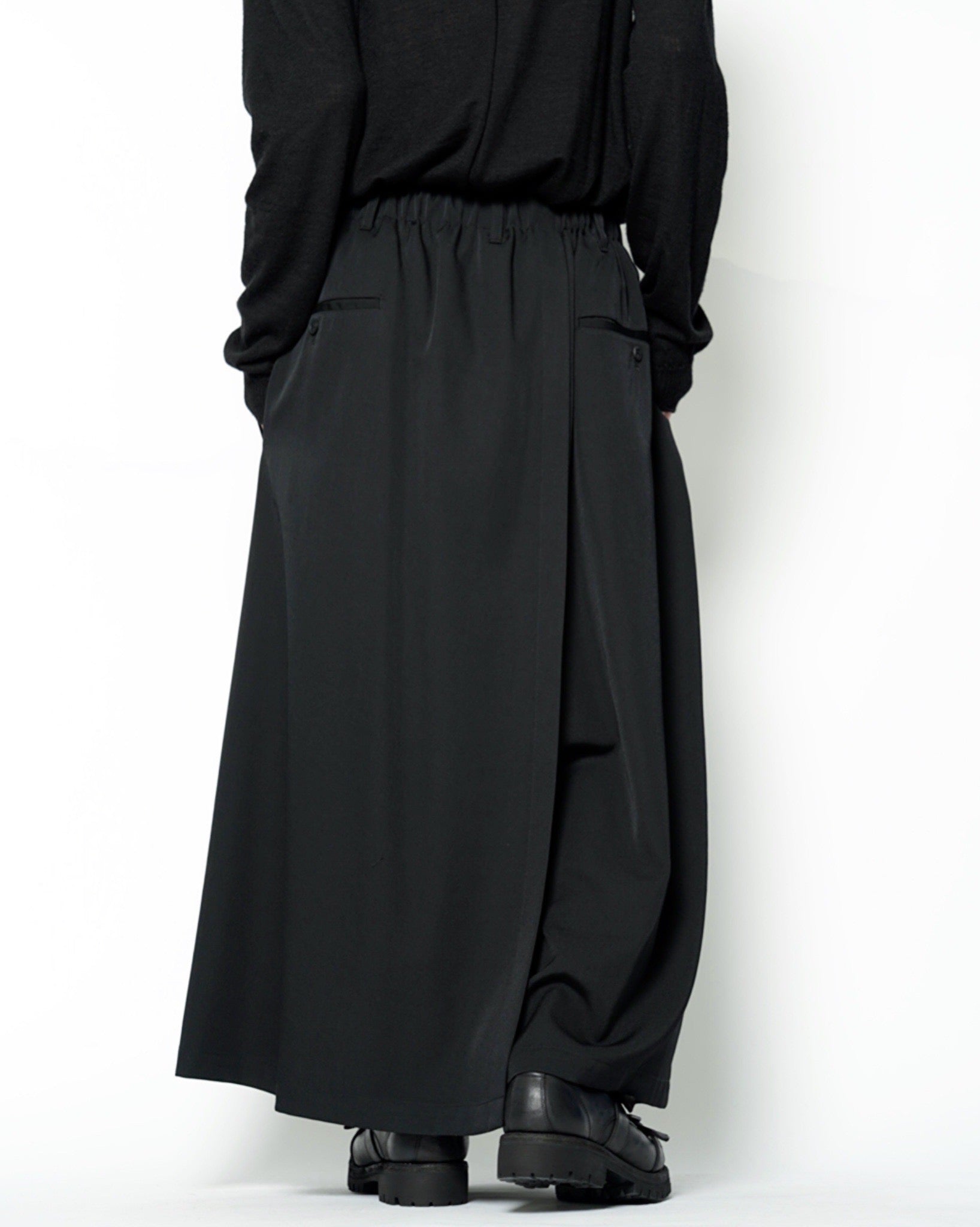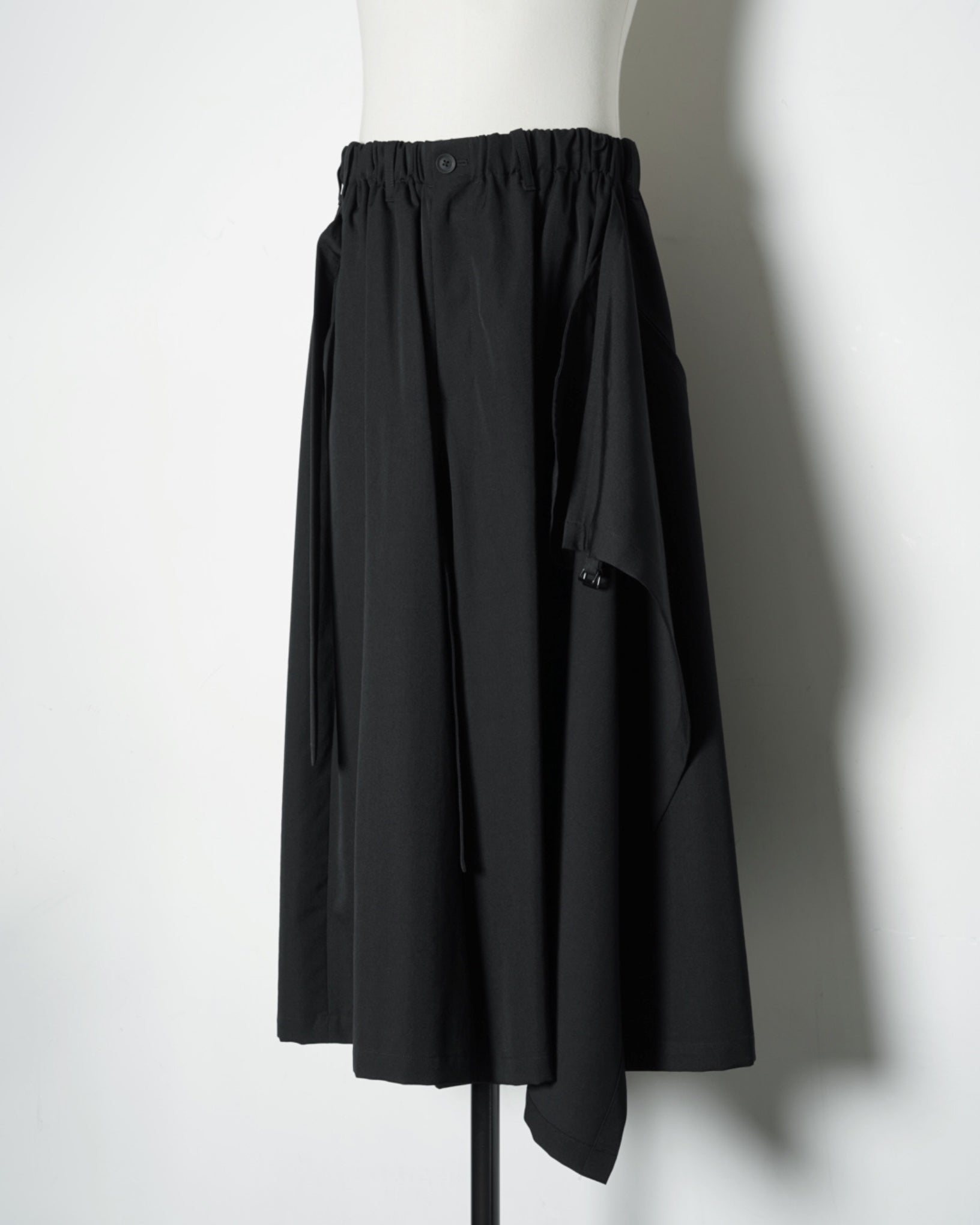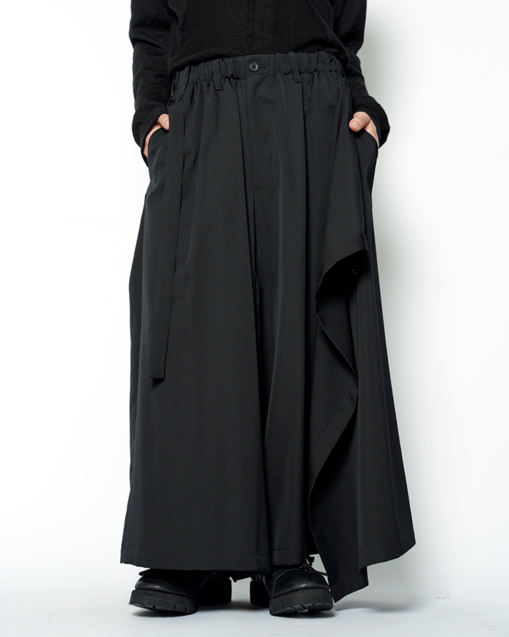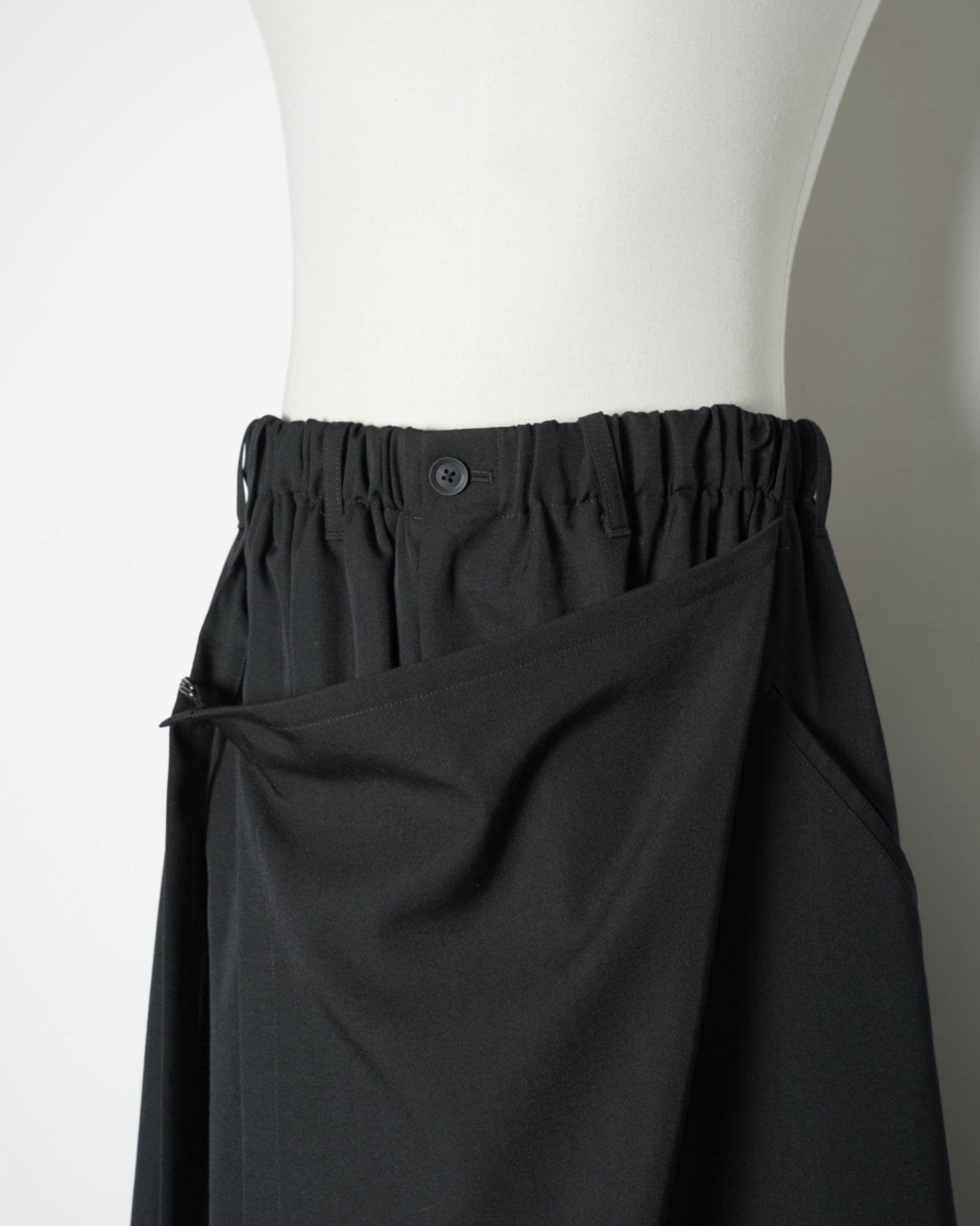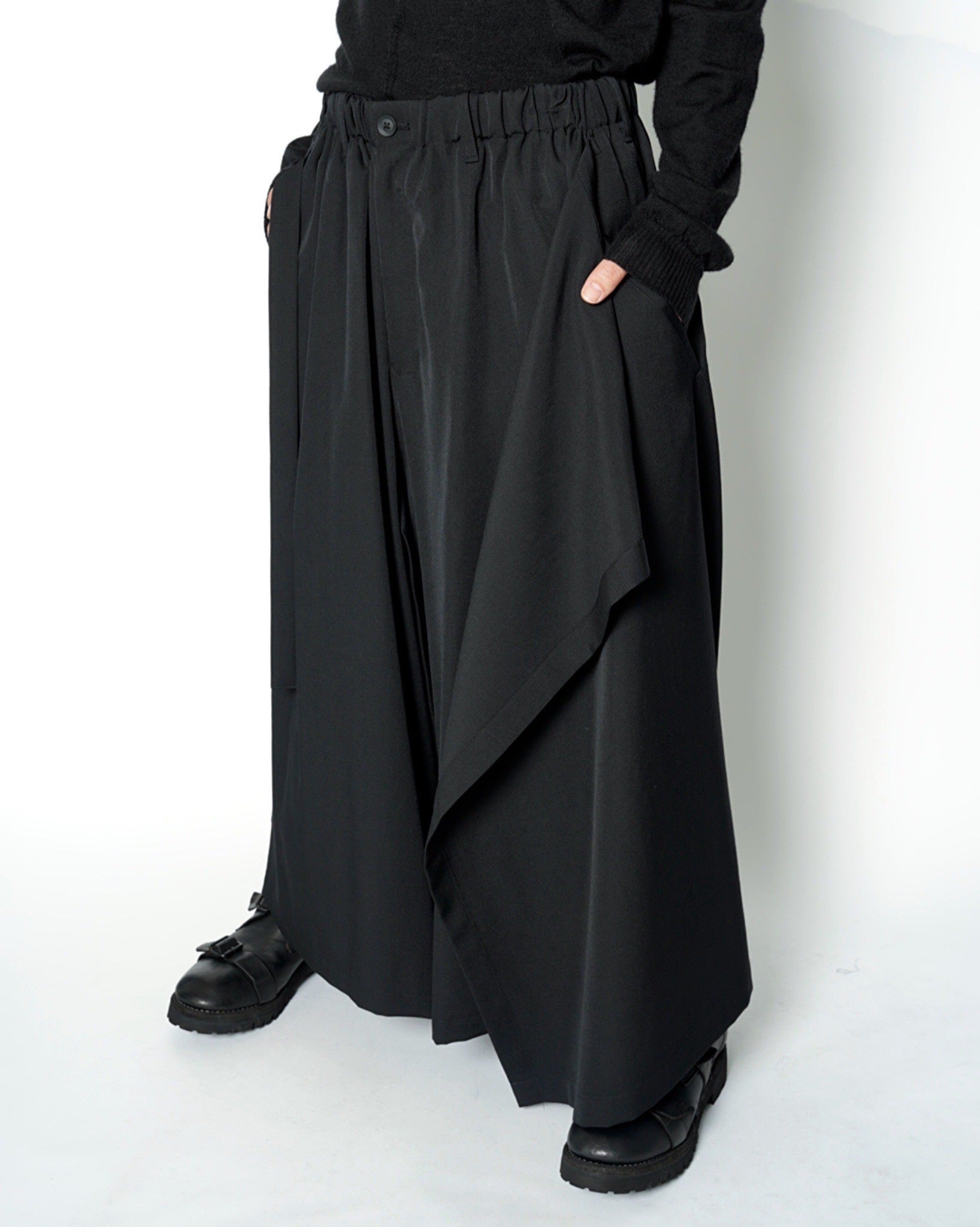 ・ドレーピーな表情がラップパーツとワイドなシルエットにより複雑なデザインを作り出しており、穿くだけでスタイリングの主役となる存在感に溢れています。