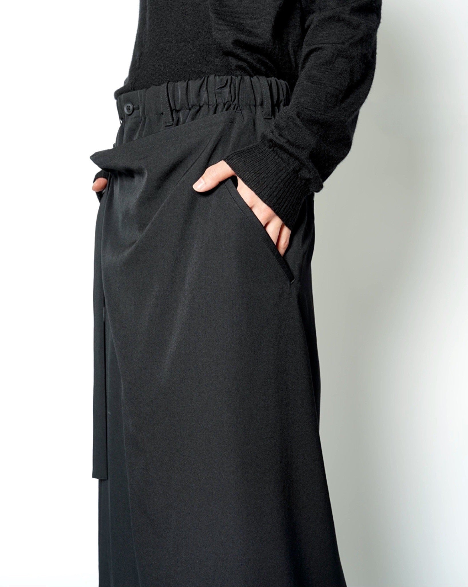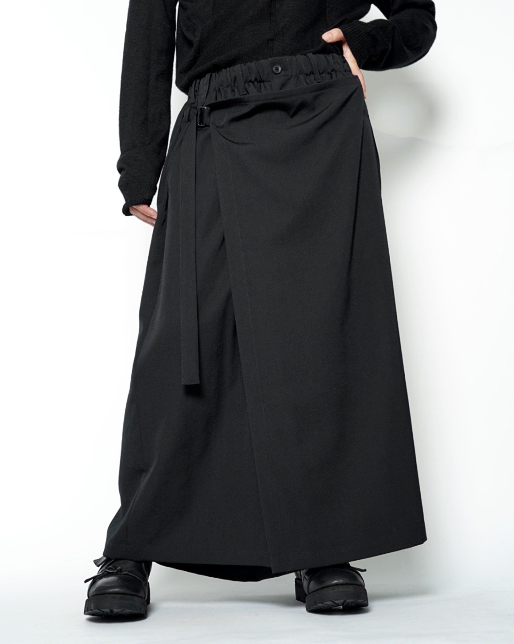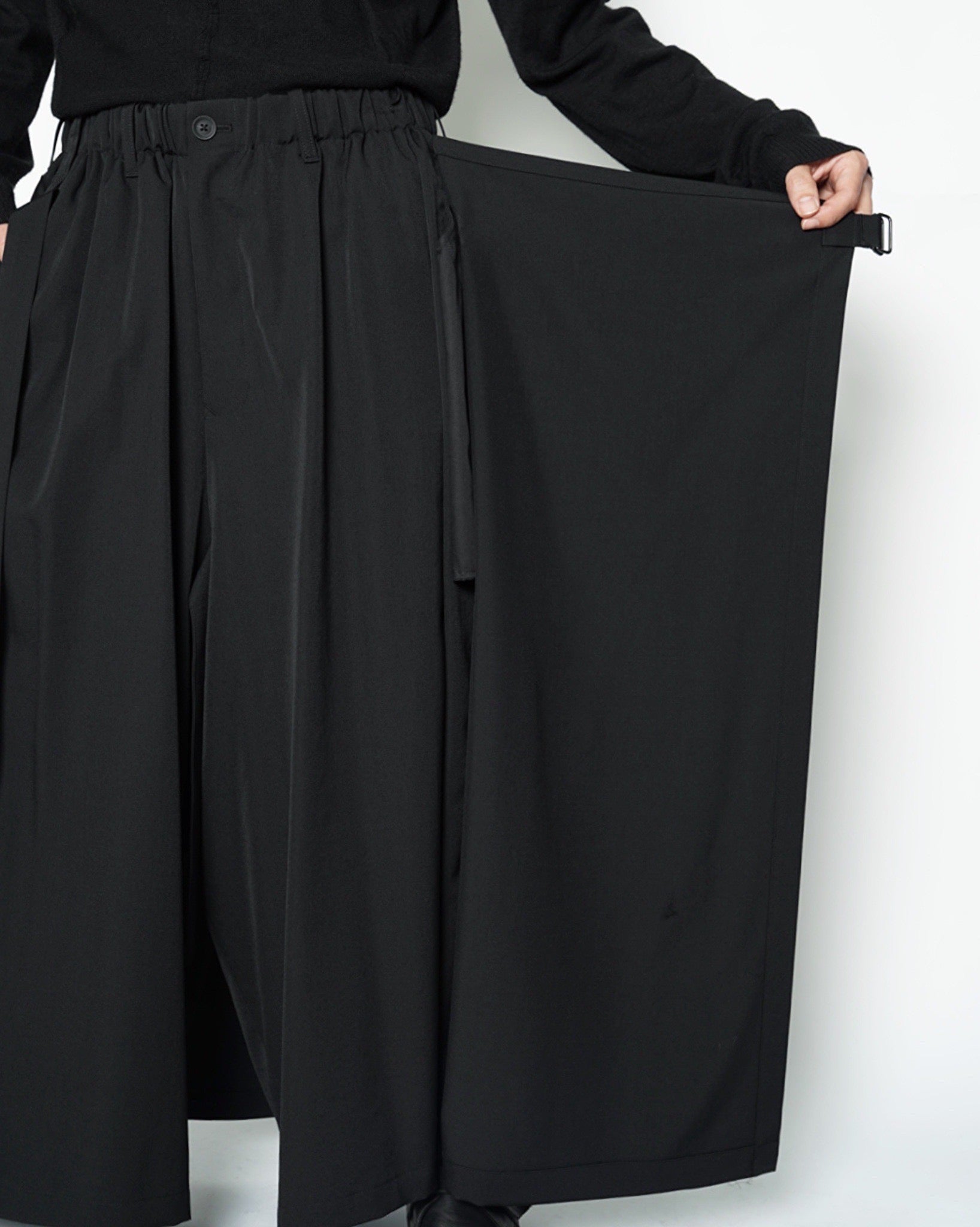 ・短めのレングスとラップが合わさることで、袴のようなシルエットに。