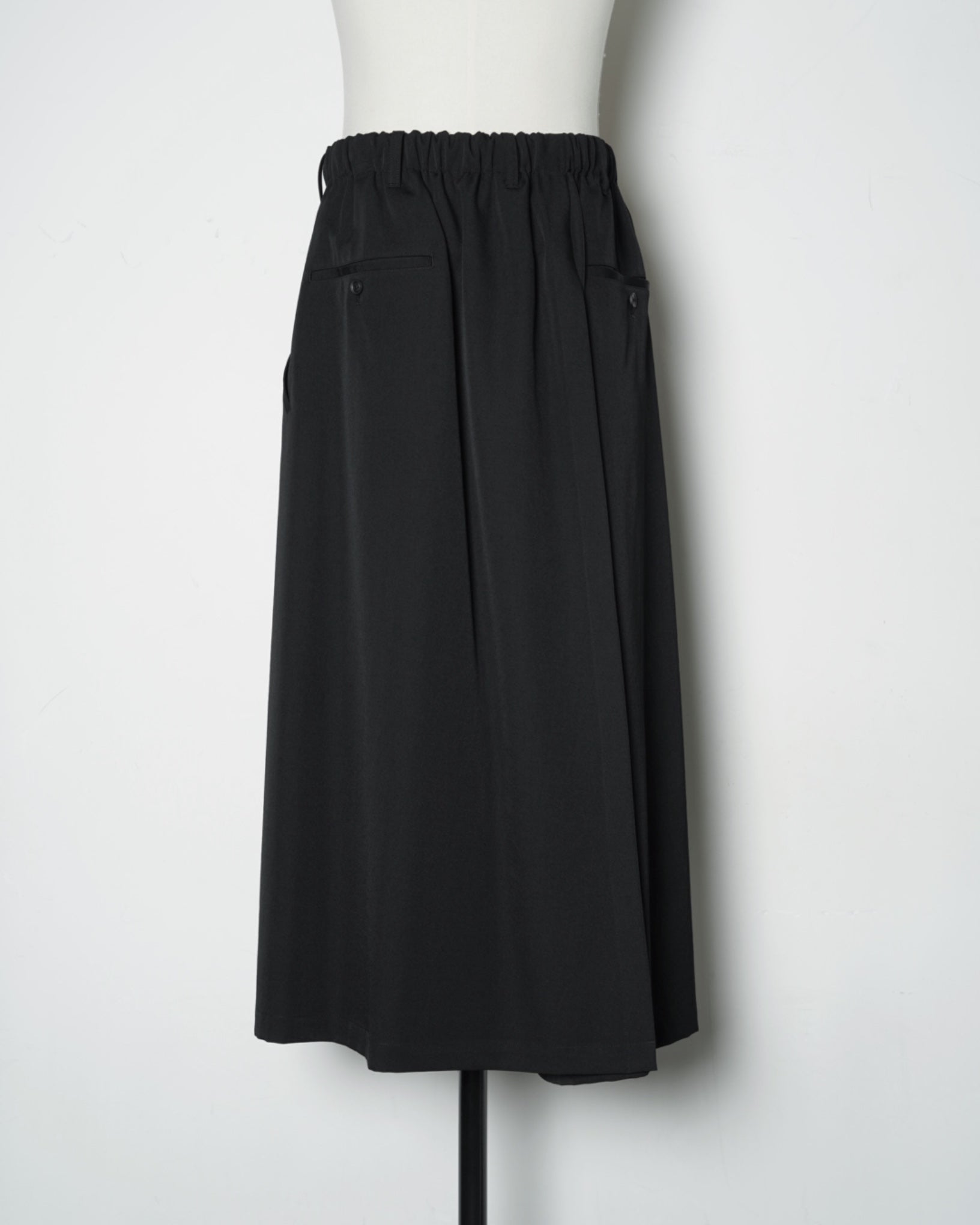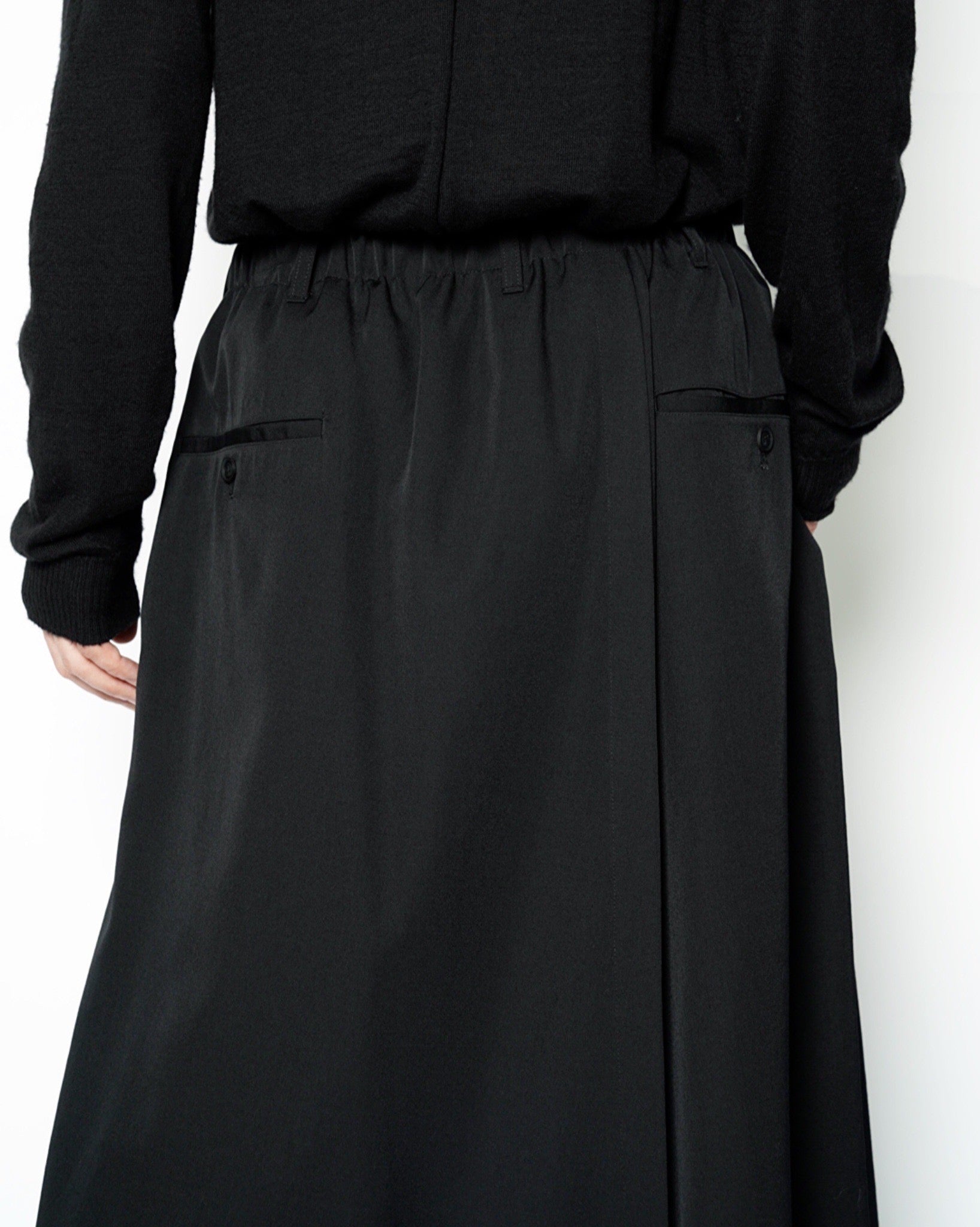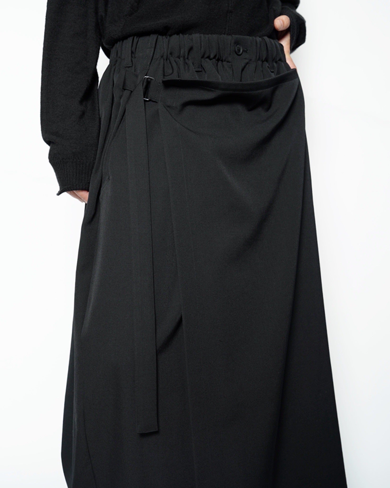 ・短めのレングスとラップが合わさることで、袴のようなシルエットに。