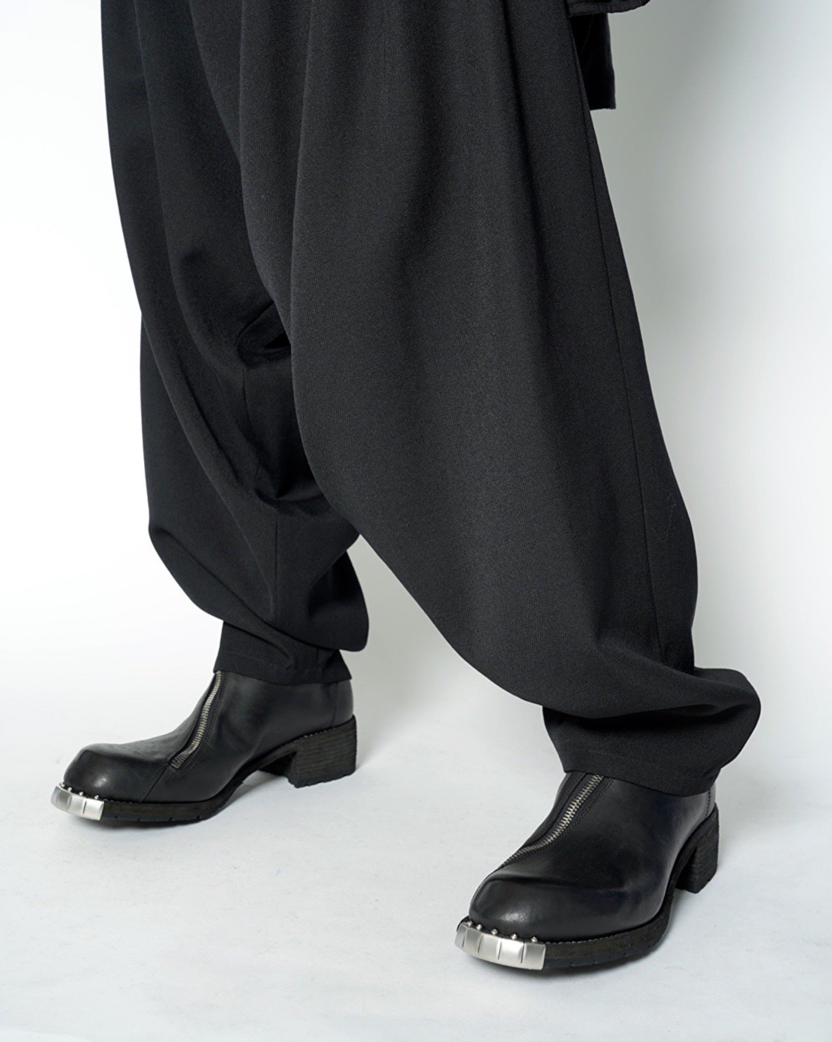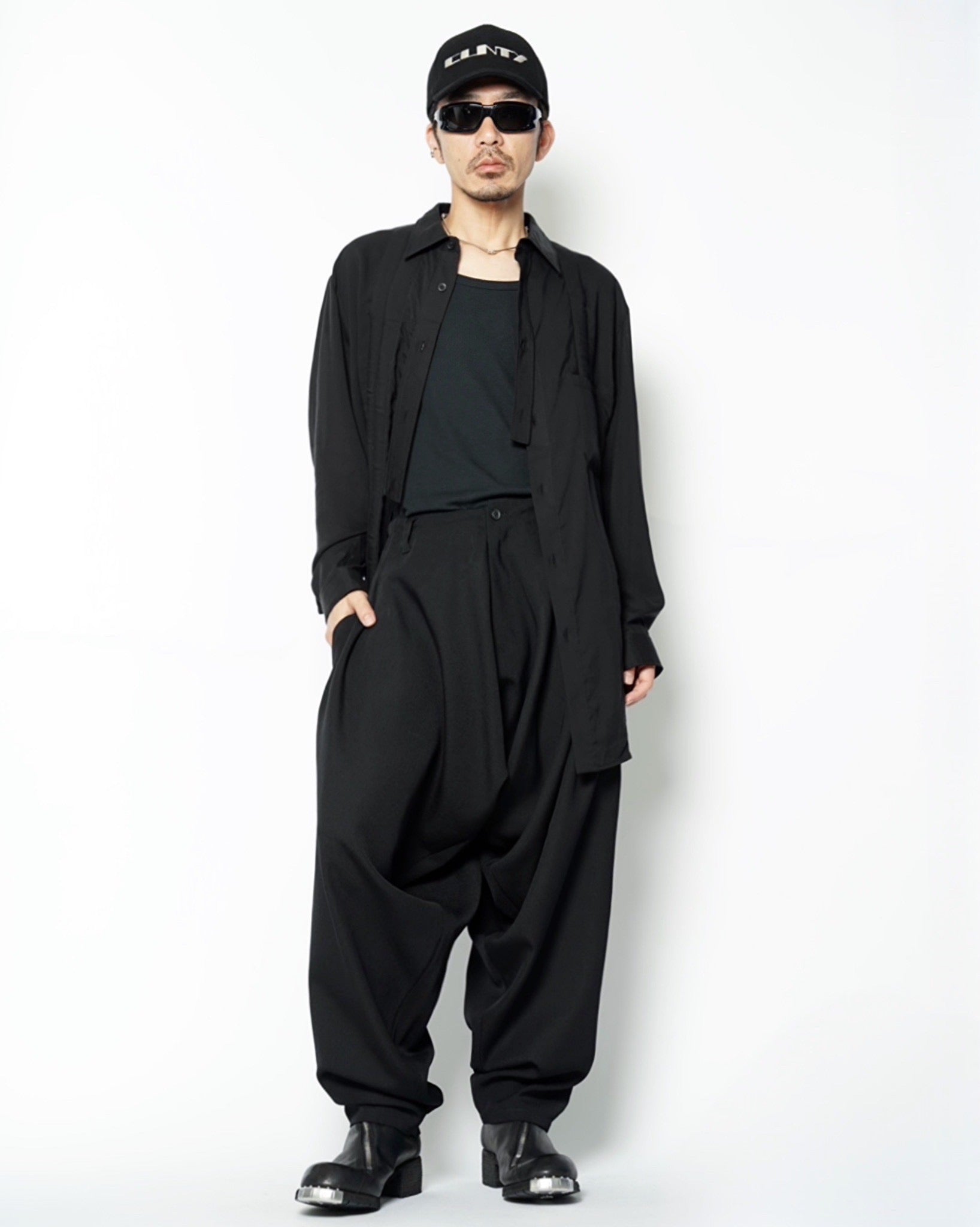 ・深い股上でサルエルのようにドロップしたフォルムも特徴で、強い存在感がありながらもこなれたリラックス感を漂わせています。