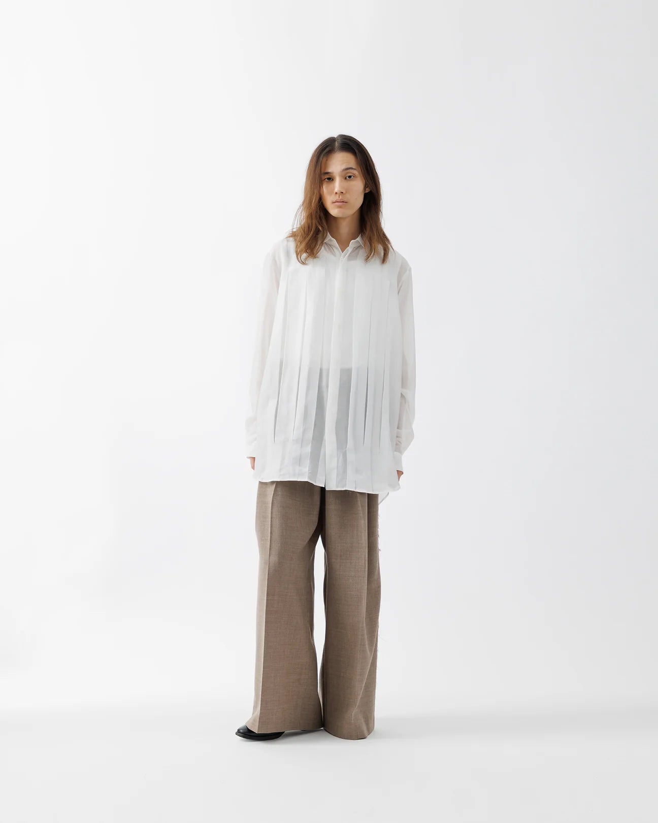 通常のフォーマルシャツのタックを数倍に拡大し、クラシックな佇まいにアーティスティックなエッジを効かせています。