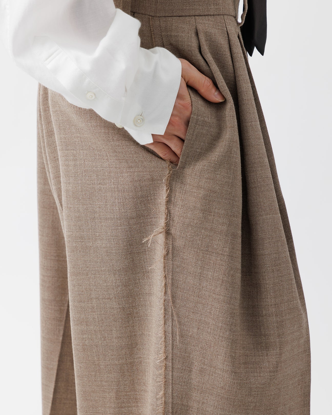 フロントのクリースラインから脇にかけて流れるように施された3本のタックが立体的な陰影と洗練されたフォルムを描き、佇まいに深みを添えます。