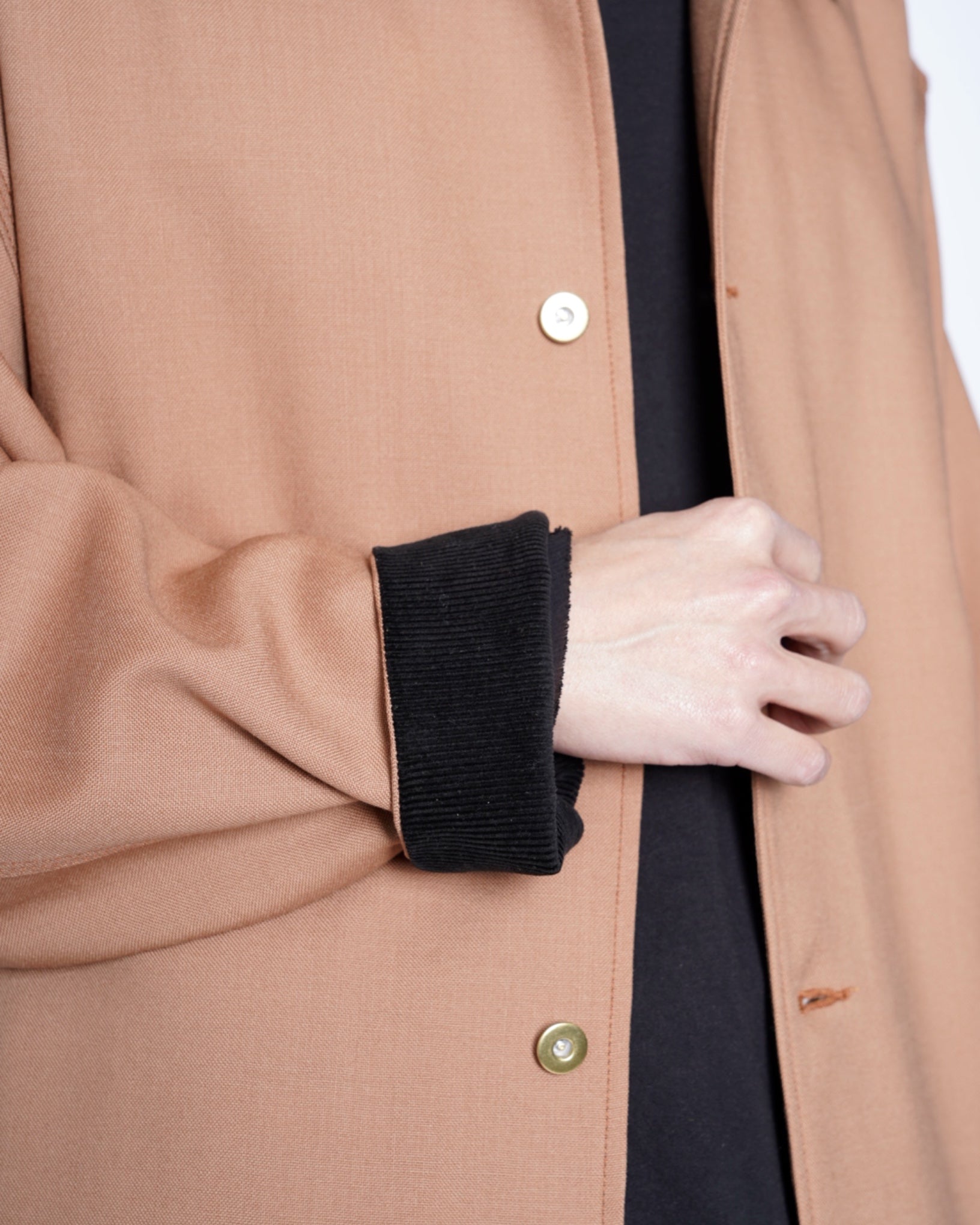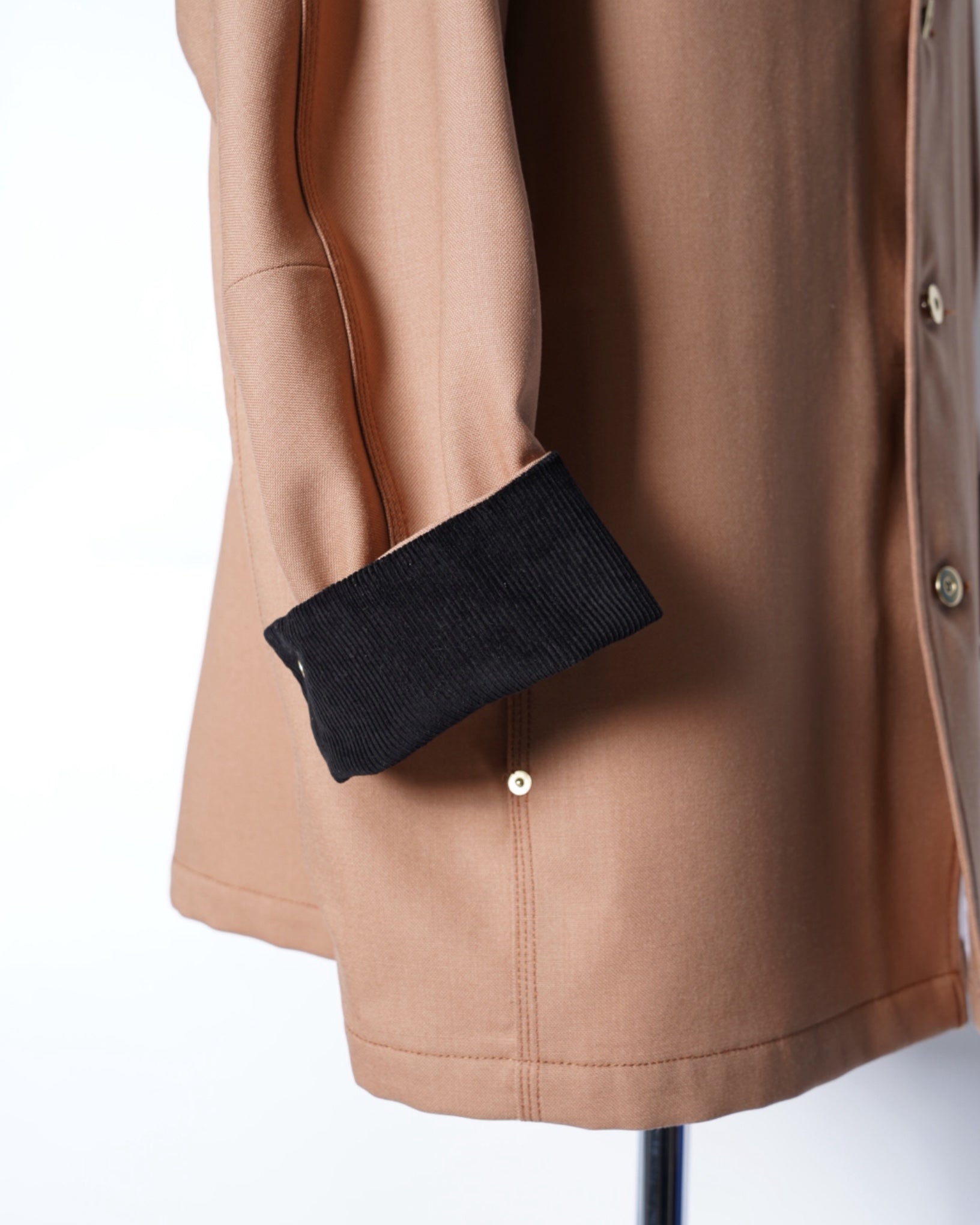 ・ダック素材のような質感、トリプルステッチ、補強のリベット、ドーナツボタン、襟とカフス裏のコーデュロイなどワークジャケットのディテールを踏襲し、リアリティーな仕上がりに。
