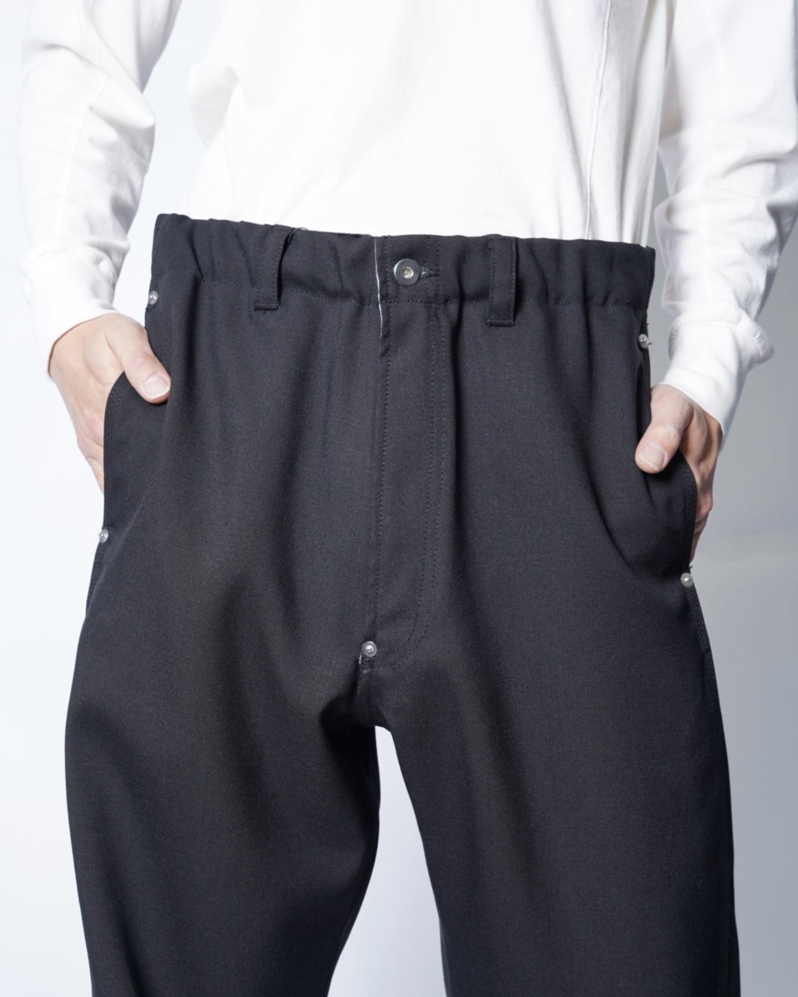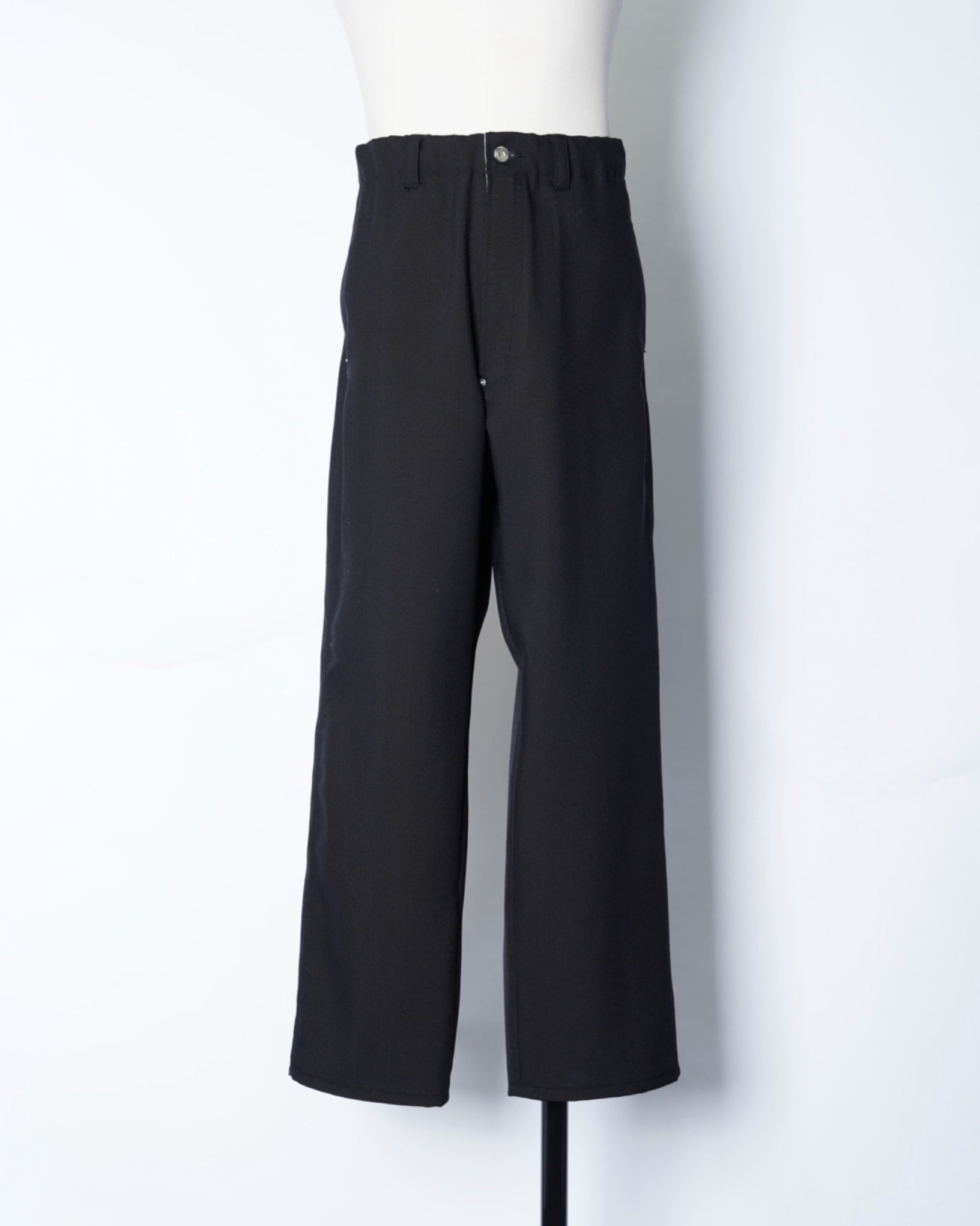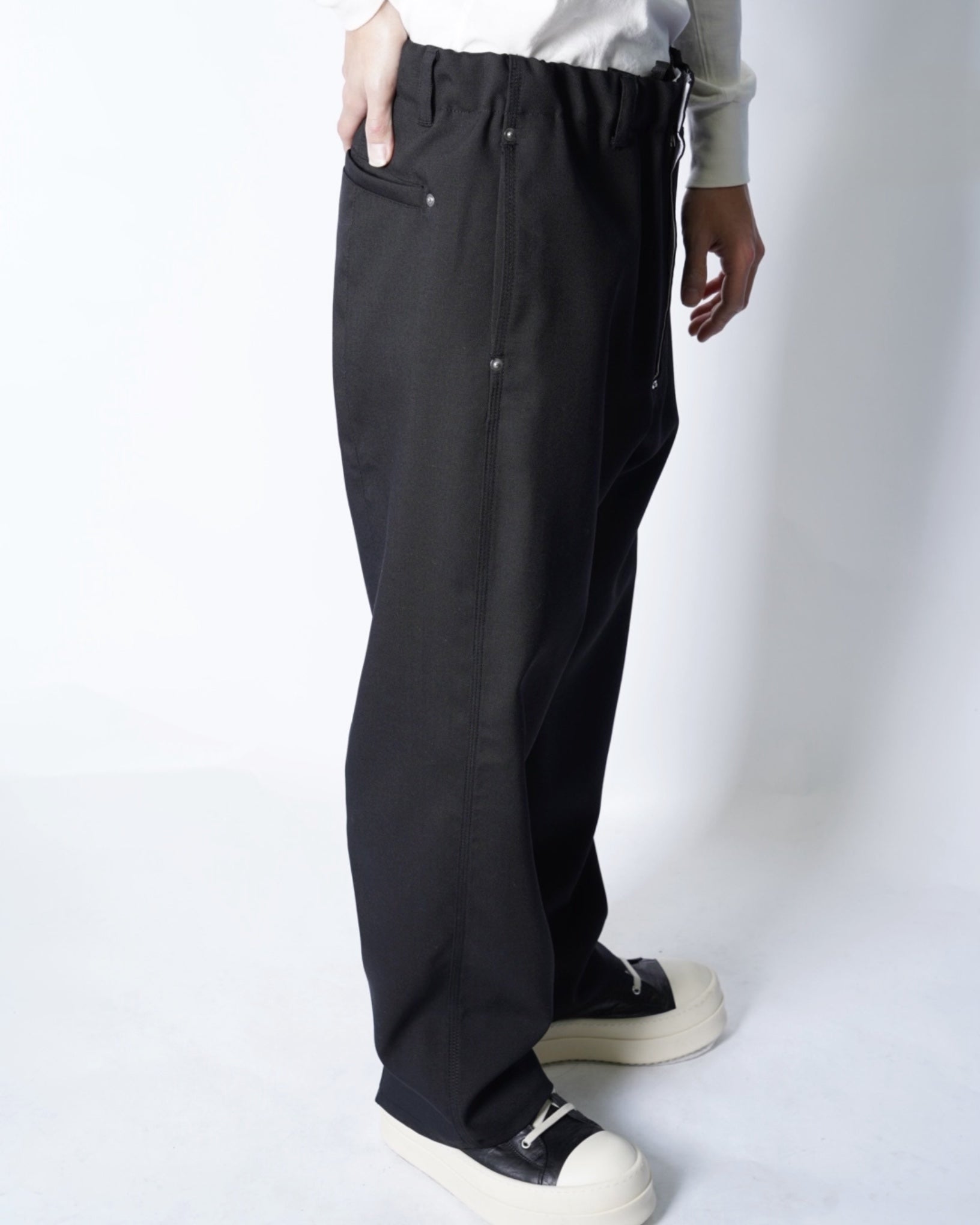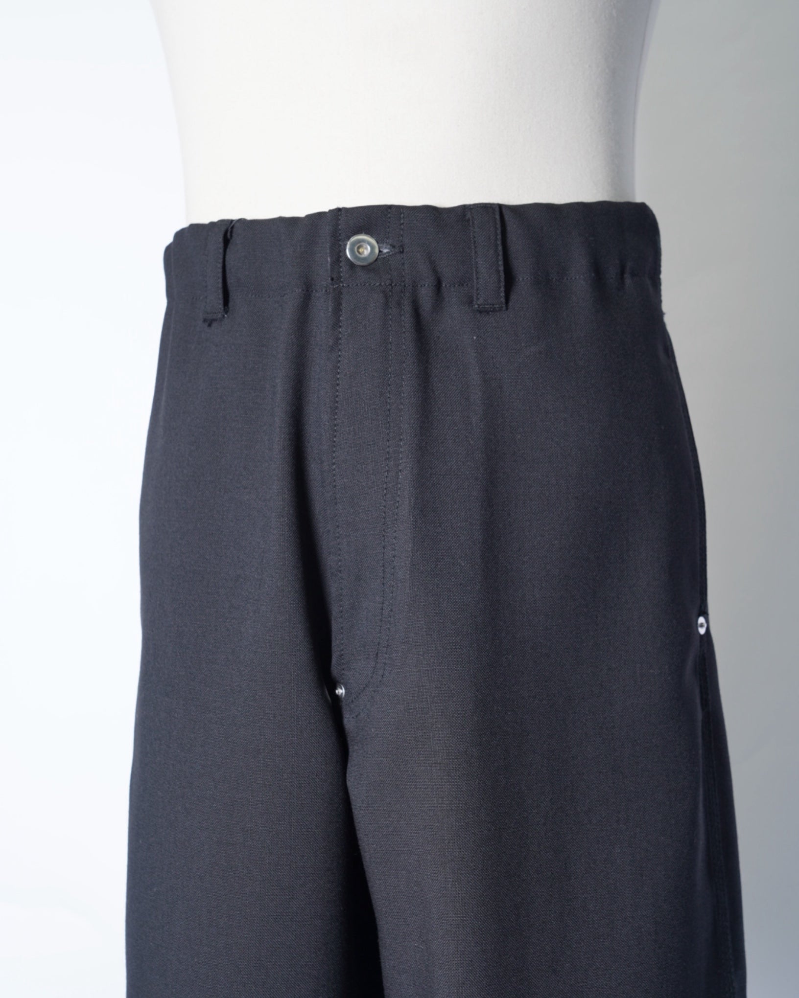 ・ダック素材のような質感、トリプルステッチ、補強のリベット、ドーナツボタンなどワークパンツのディテールを踏襲し、リアリティーな仕上がりに。