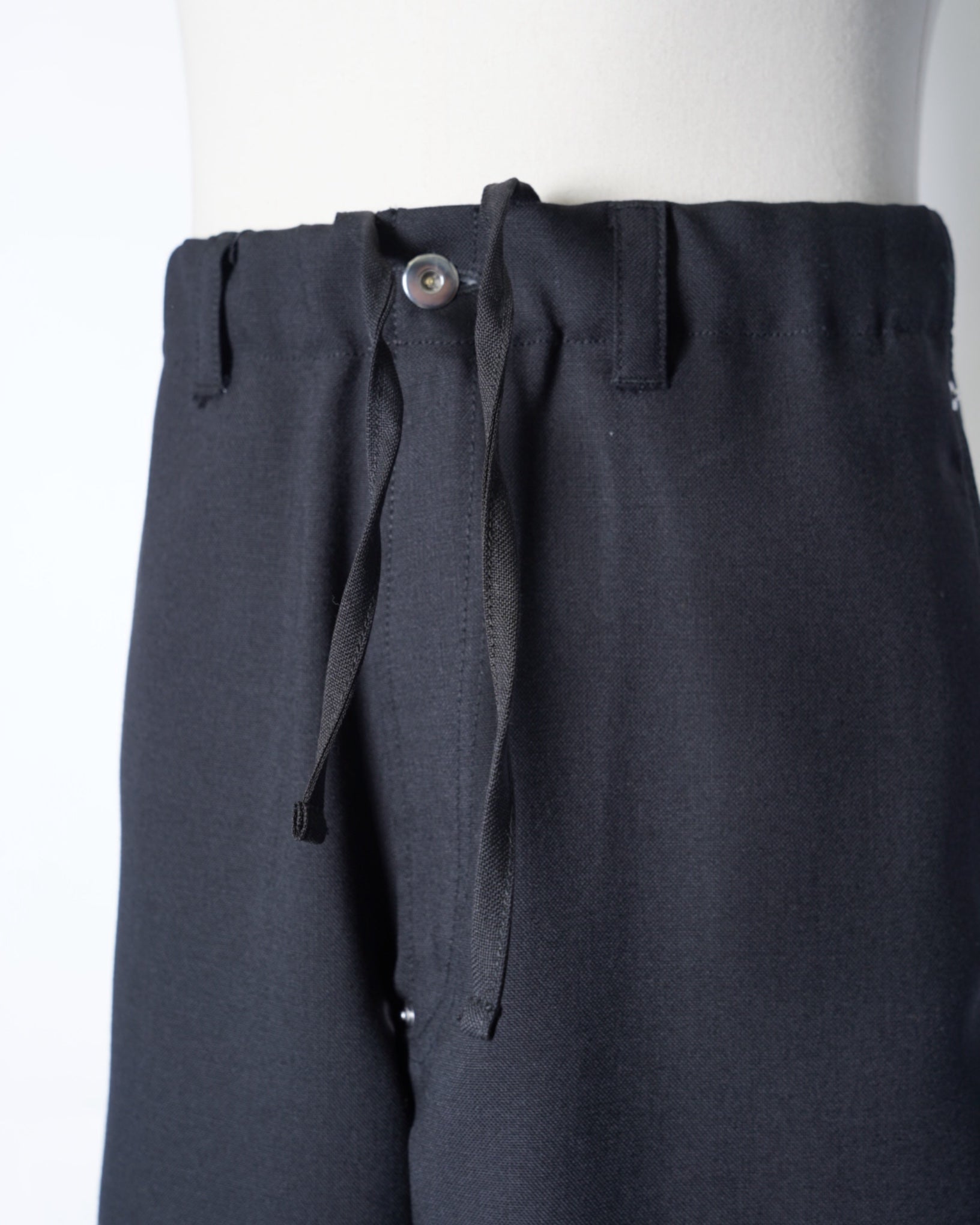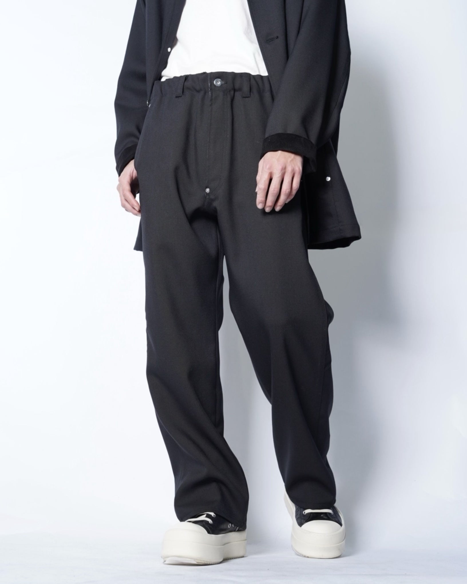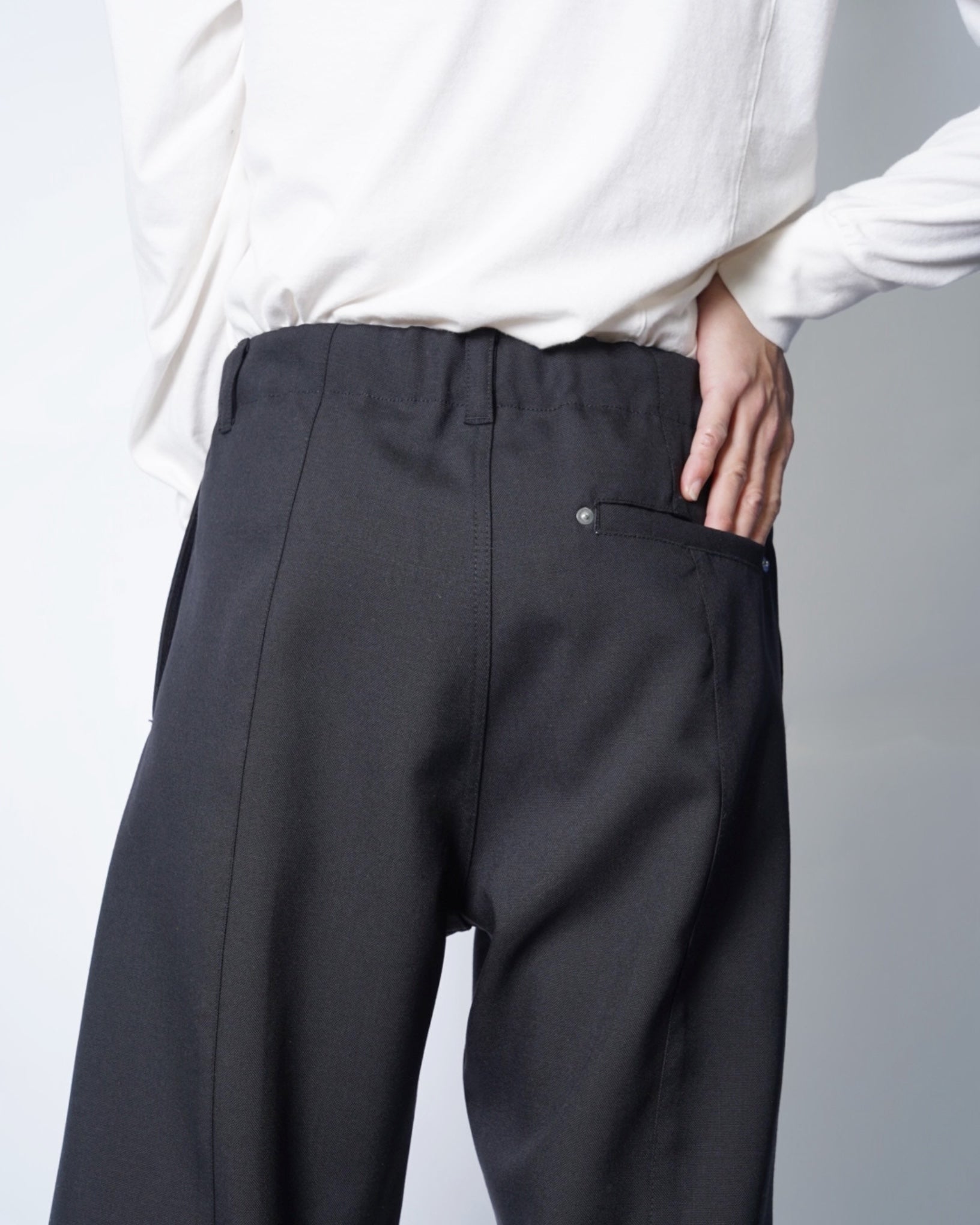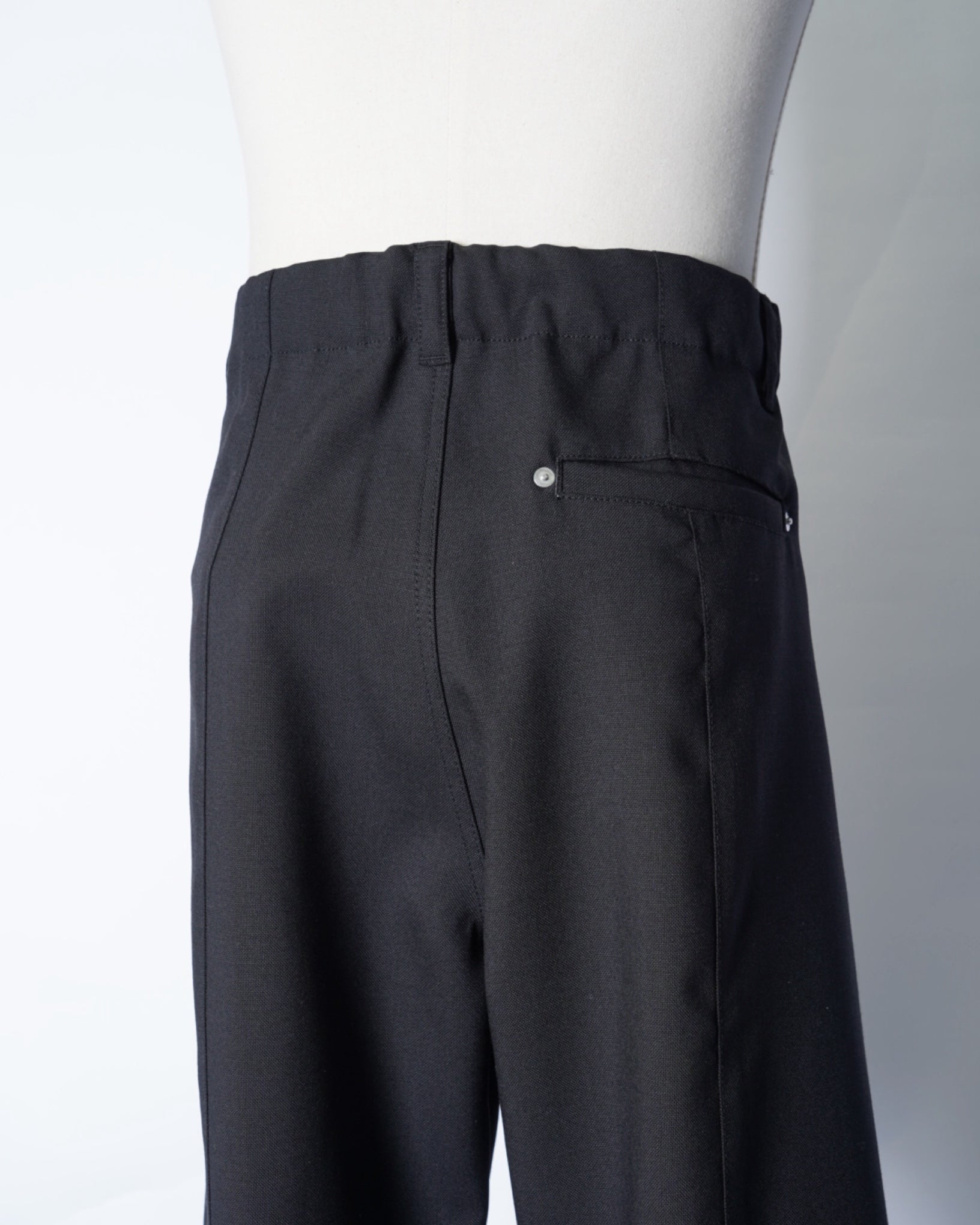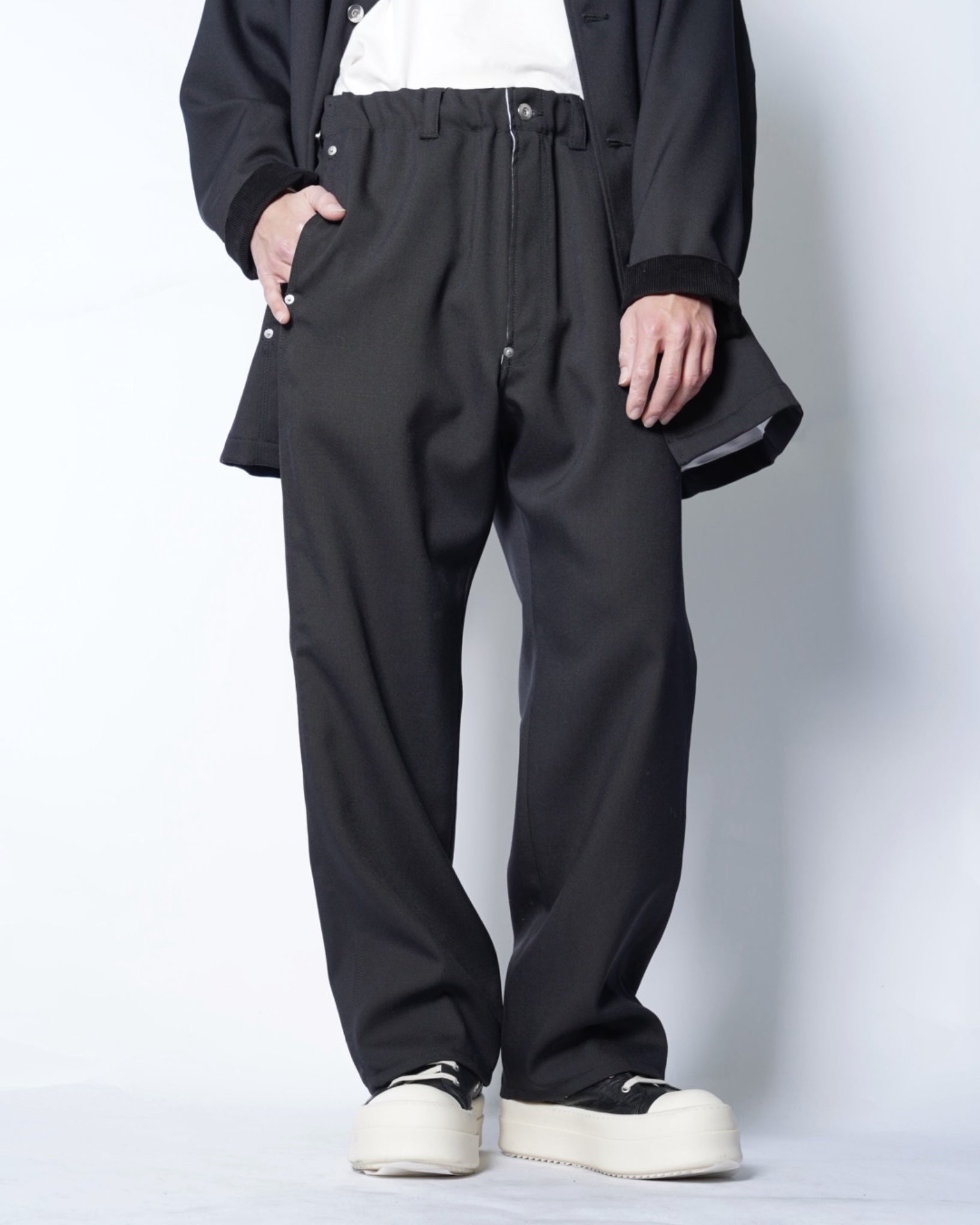 ・立体的な織り目も特徴的で、ワークパンツのダック素材を思わせる質感を表現しています。またドレスライクなウール素材のため品のある仕上がりです。