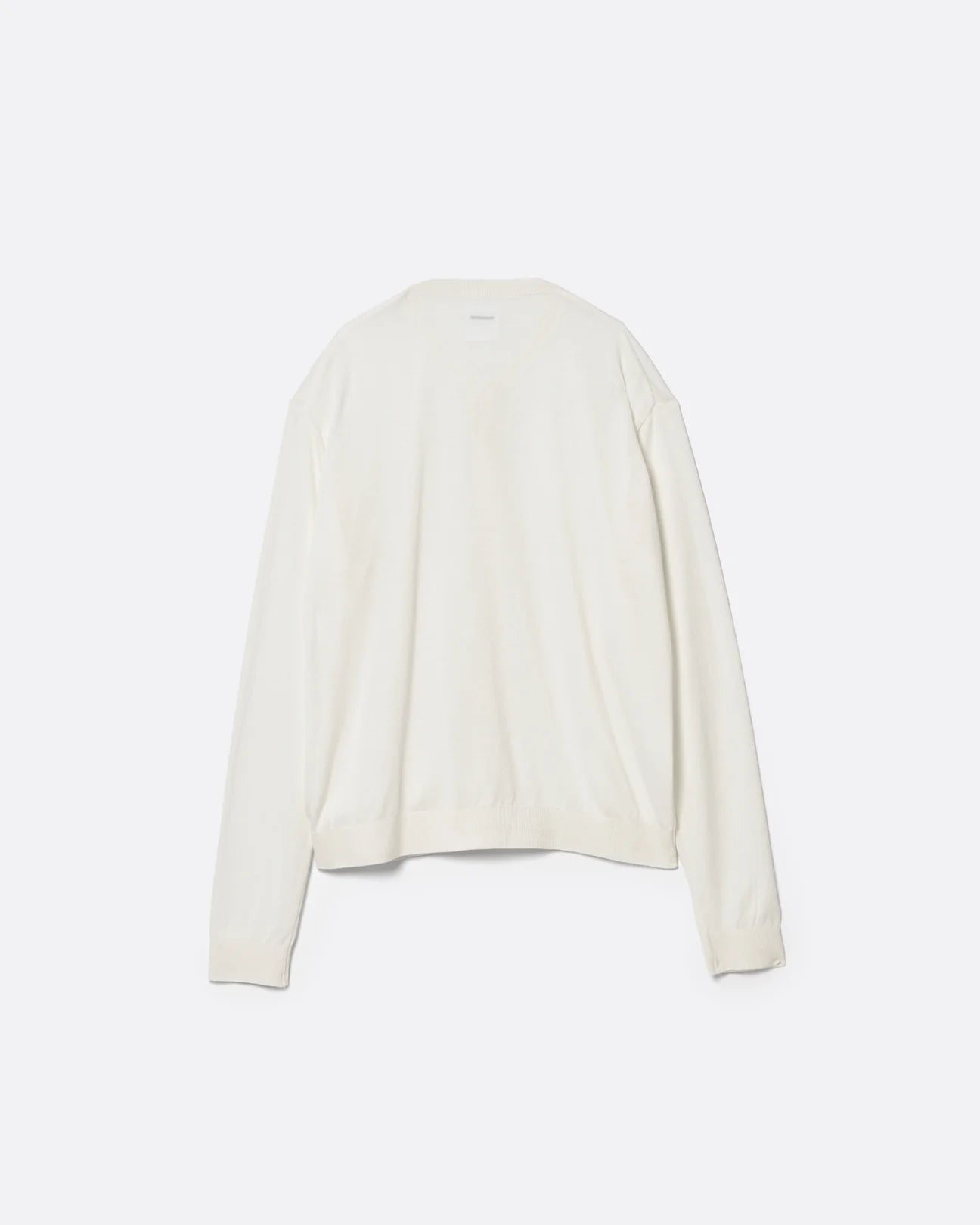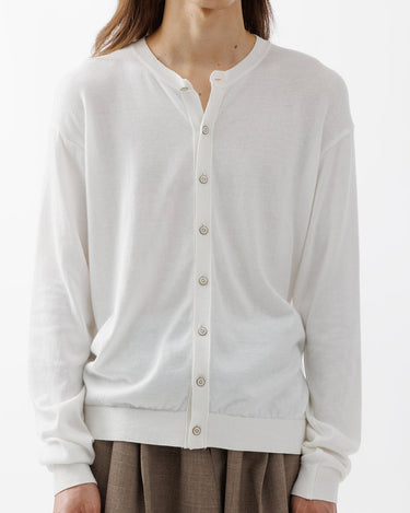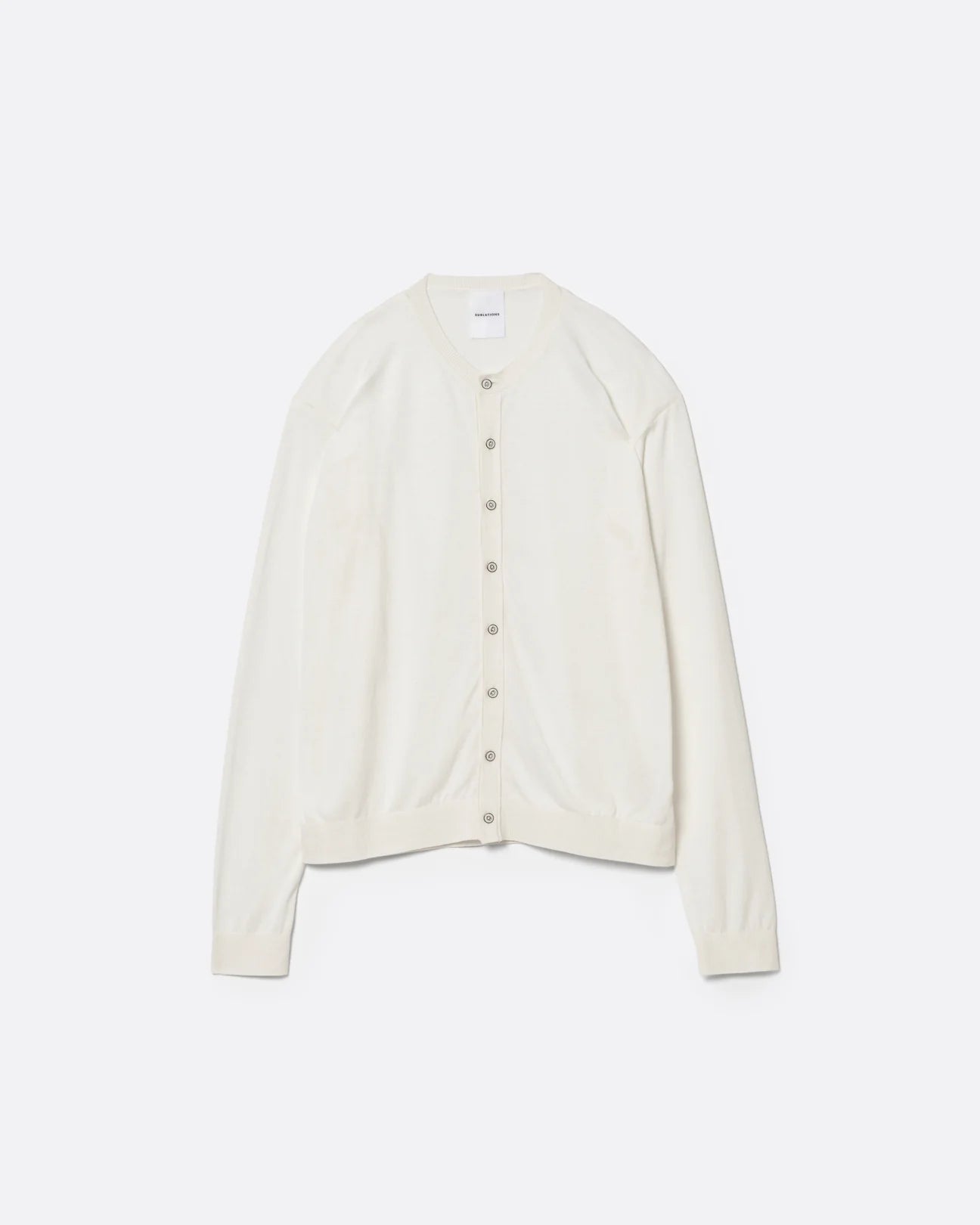 ミニマルなクルーネックを引き立てる、コンパクトシルエットのカーディガン。