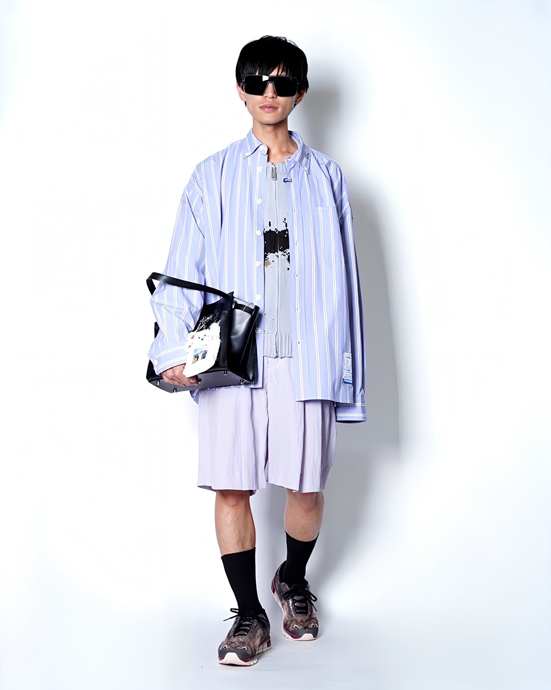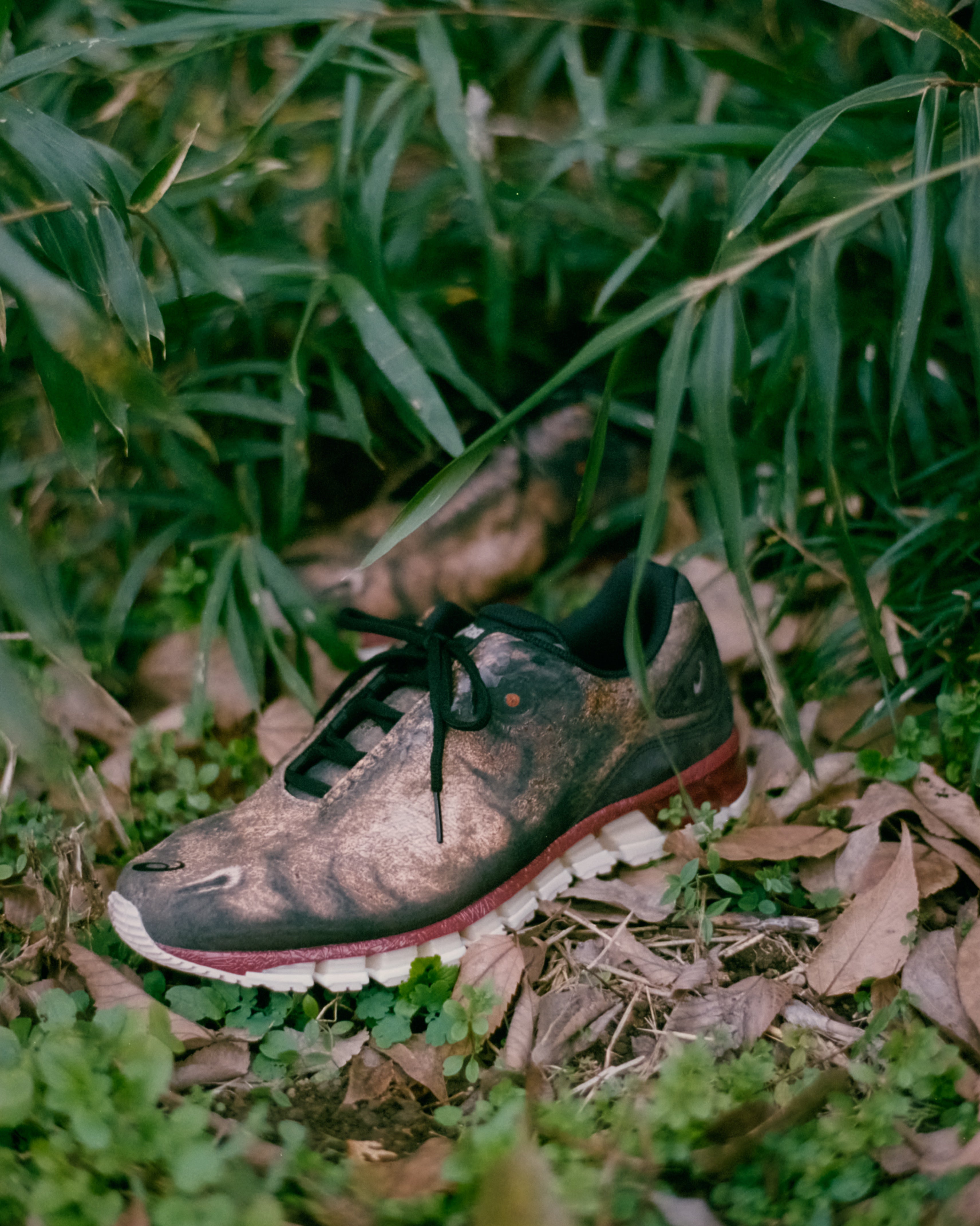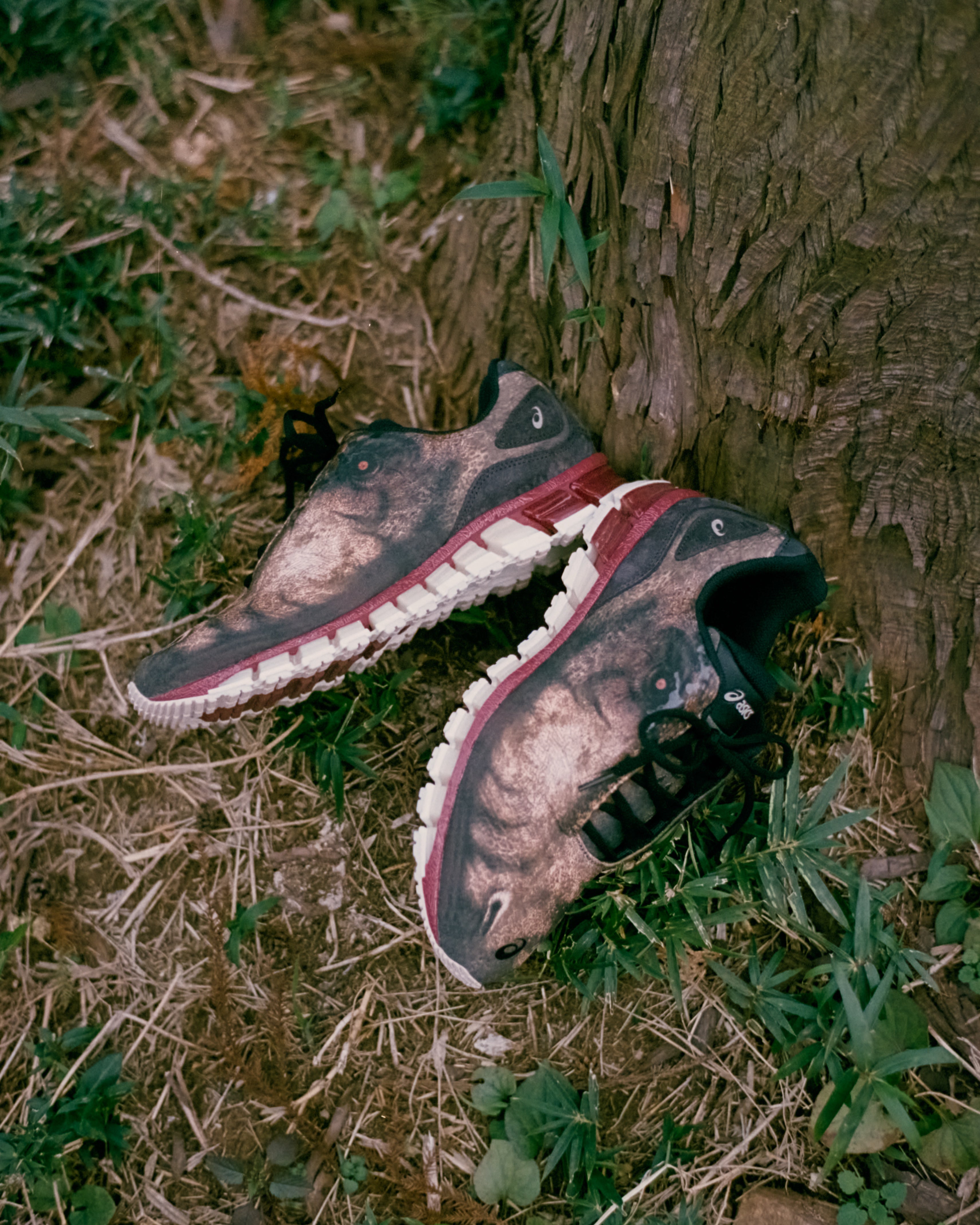 アッパー全体には恐竜の頭部を描いた大胆なグラフィックプリントを配置。
