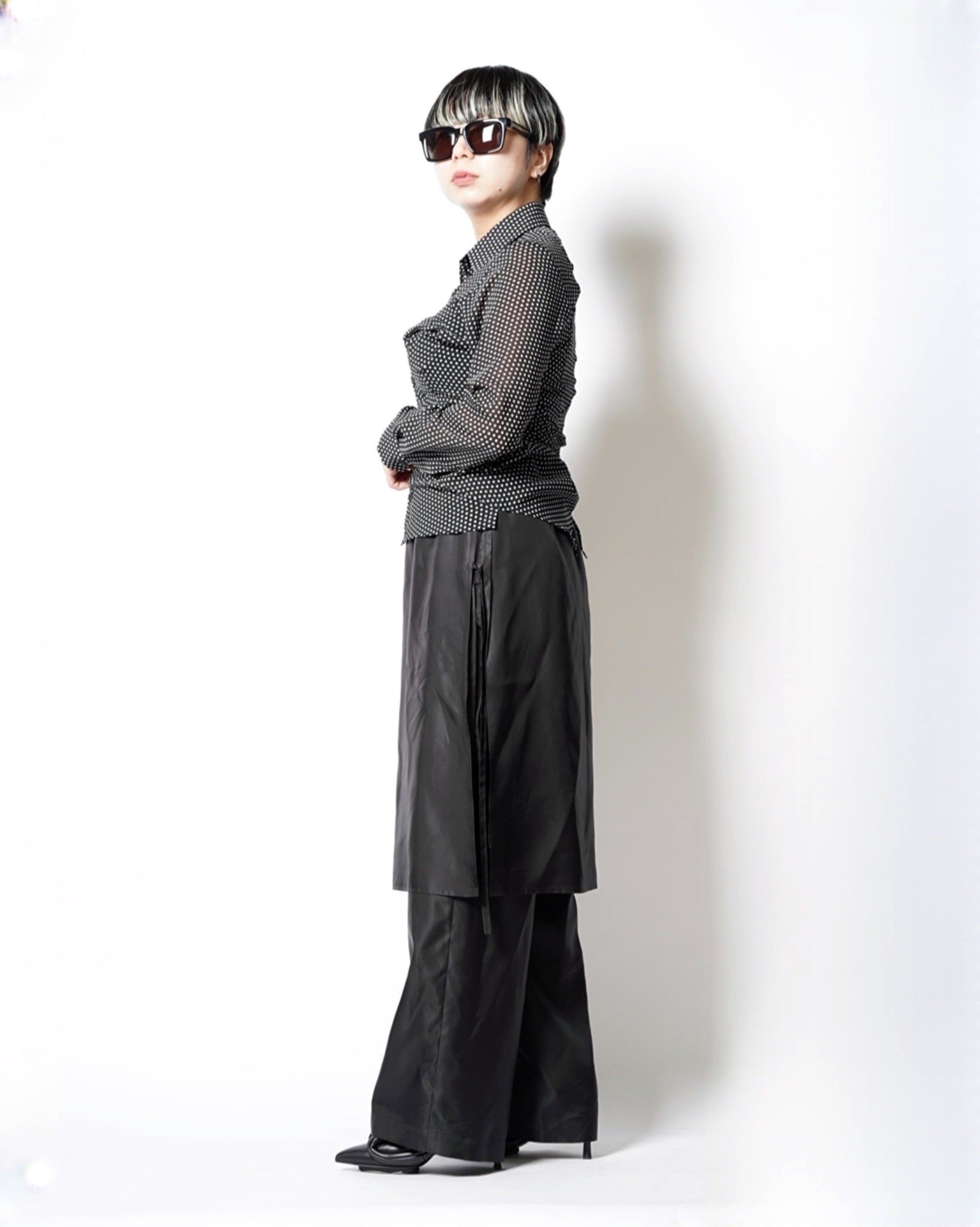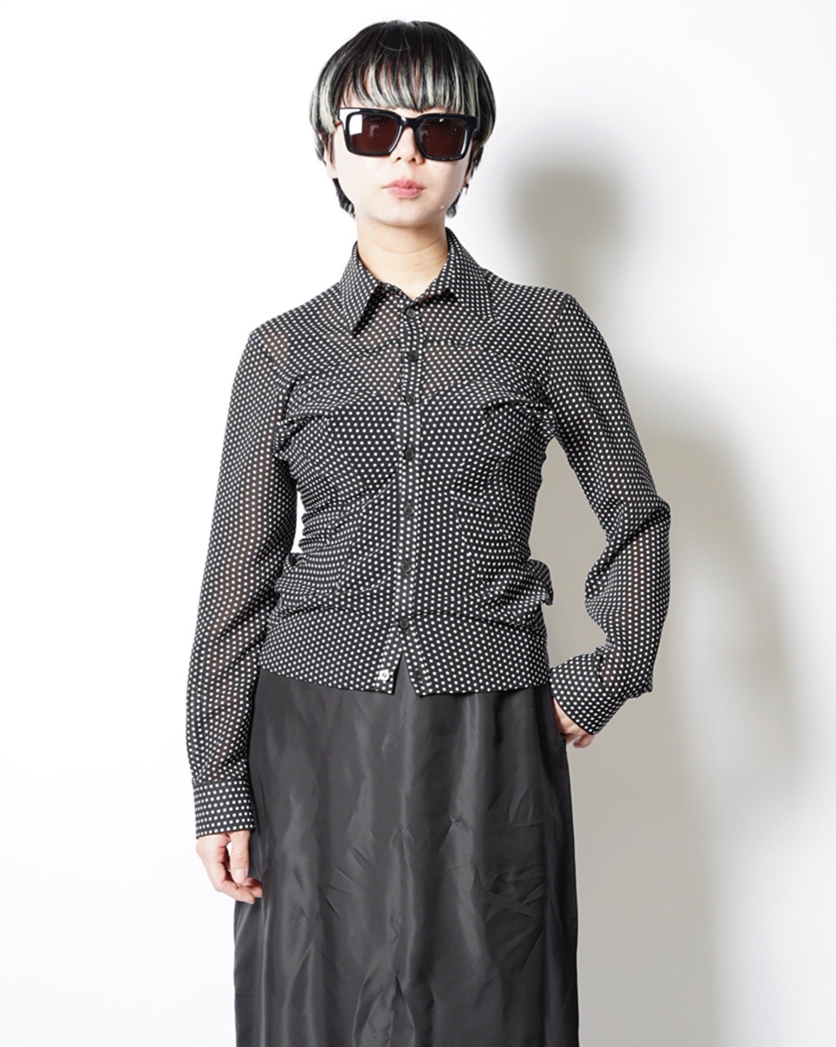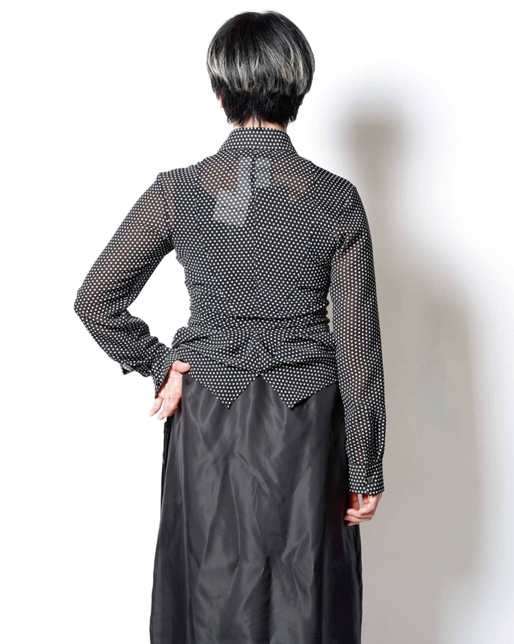 ・細やかなドット柄で、シックなモード感とこなれた愛らしさをバランスよく両立しています。