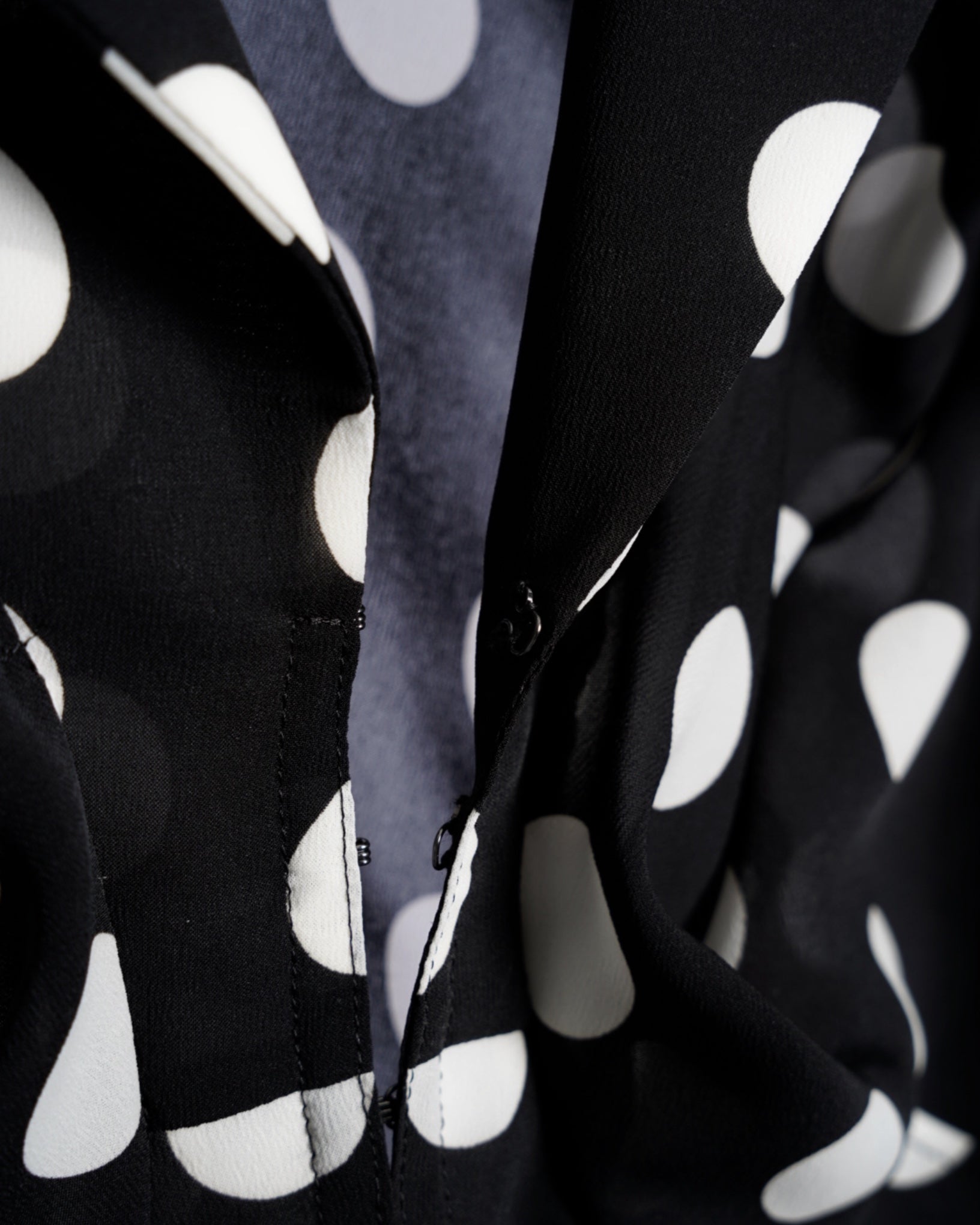 ・フロントは小さなフックで留めるようになっており、よりドット柄が際立ってシックに洗練された印象を強めています。