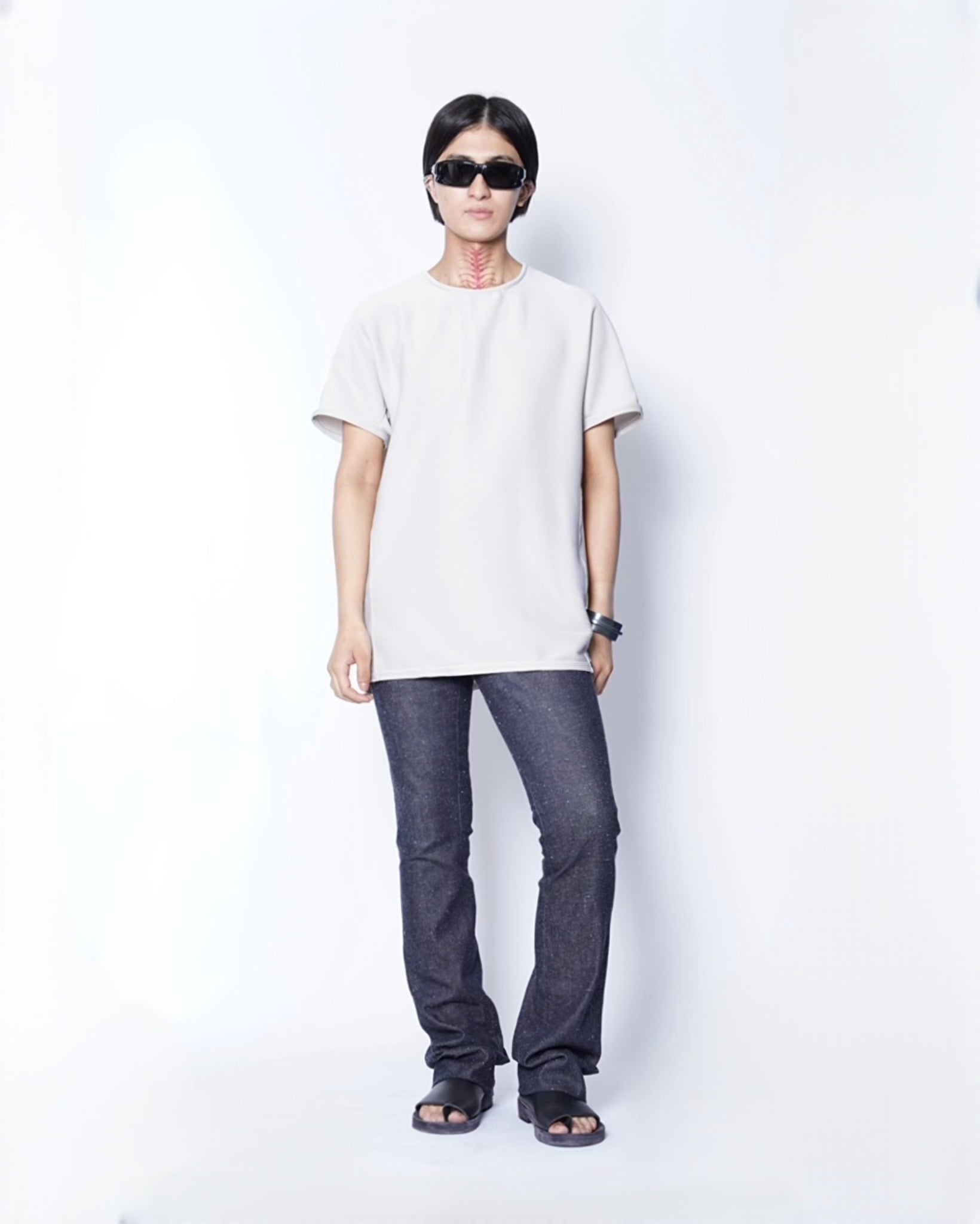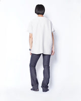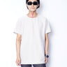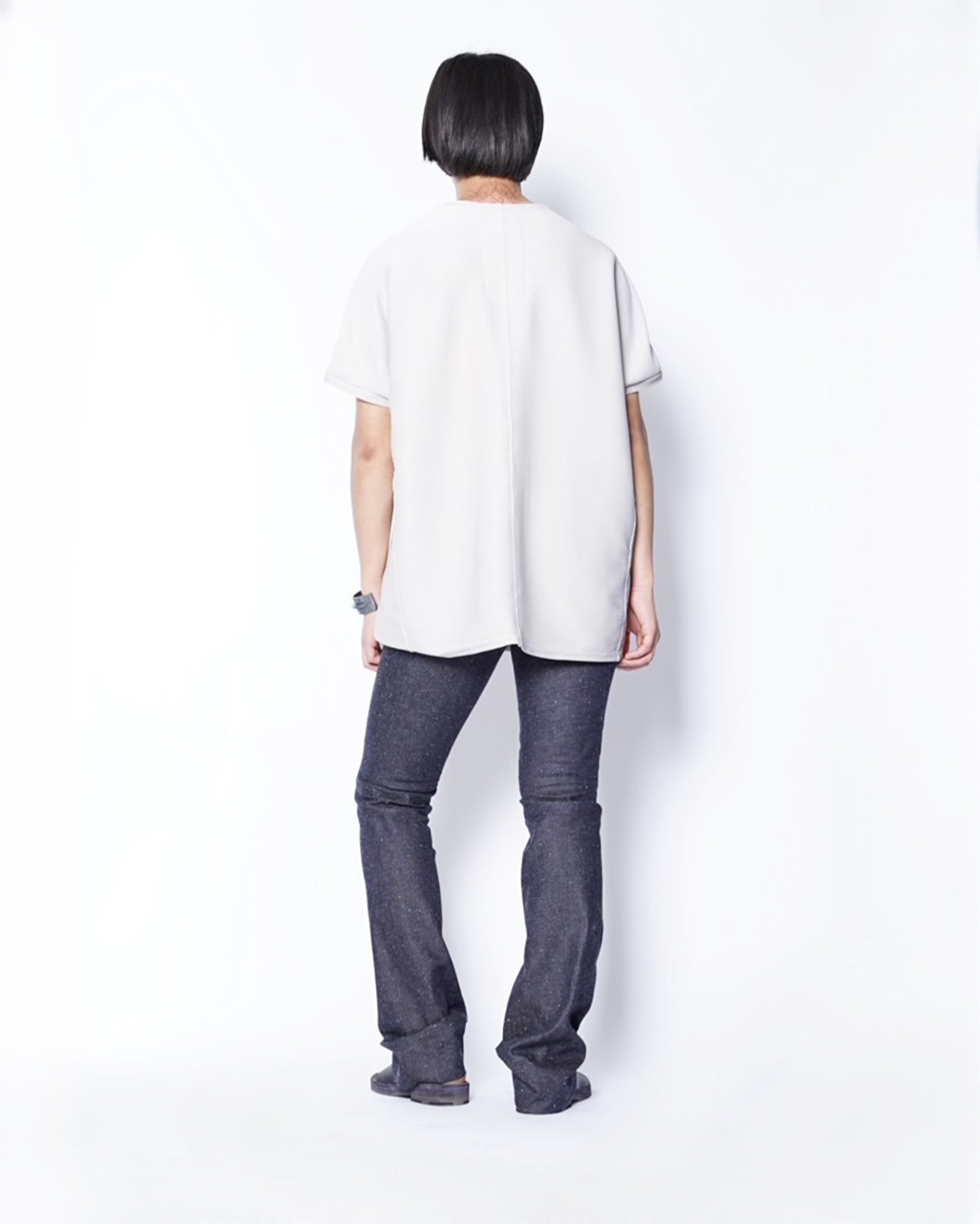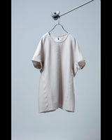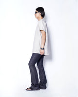 ・prasthanaのカットソー製作における定番的な手法である裏バインディング始末を採用することで、堅牢性能の向上とともに、程よい色気を作り出します。