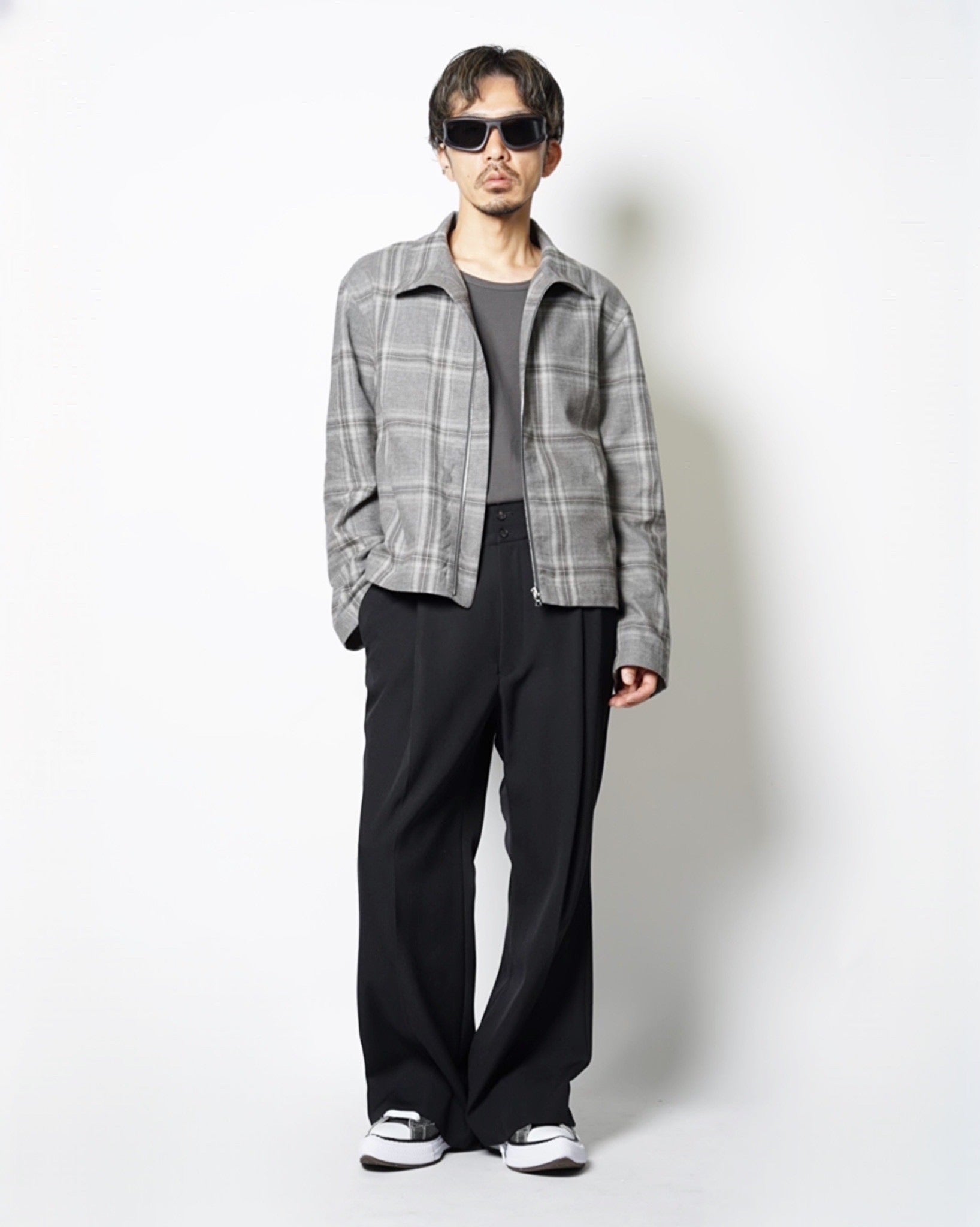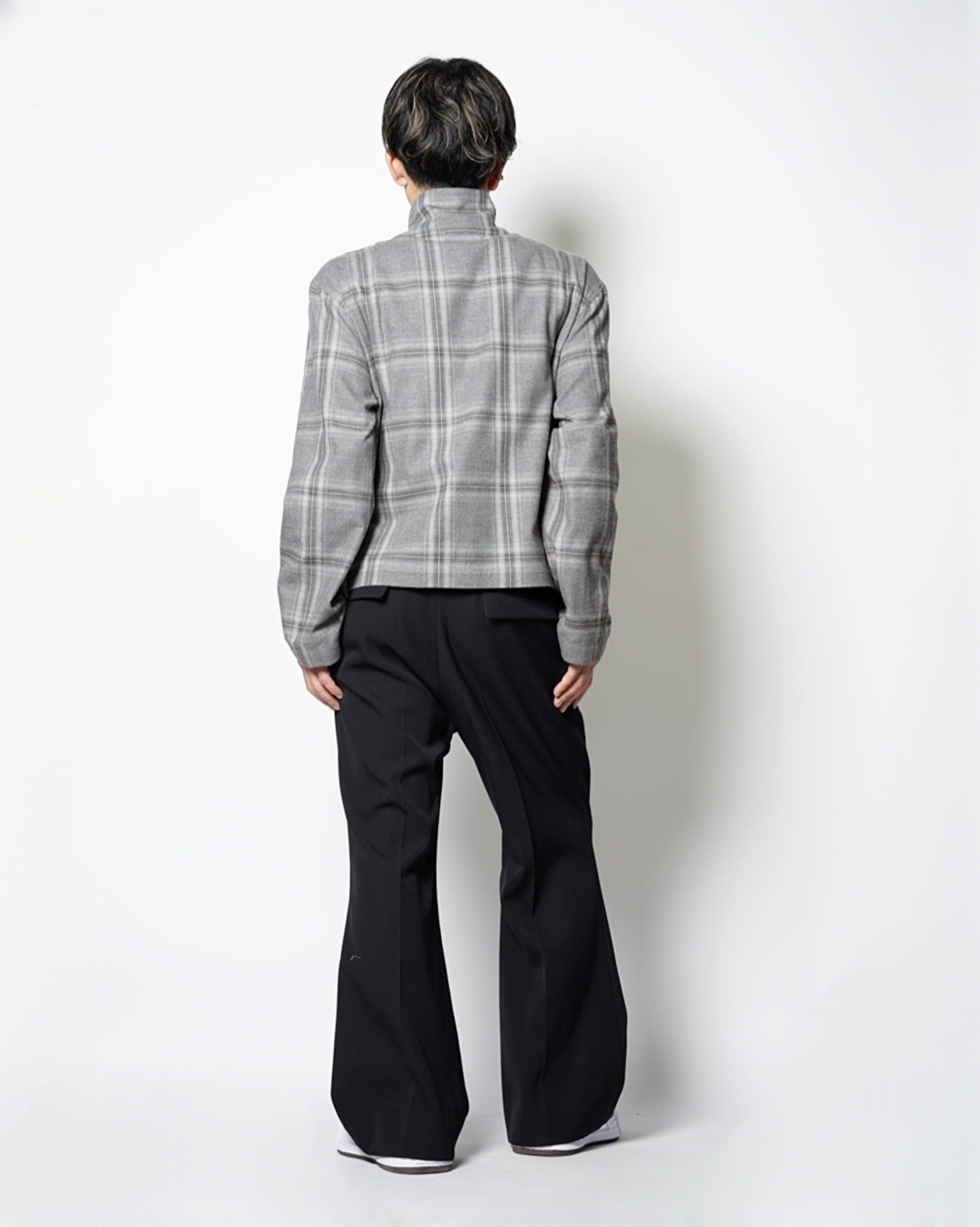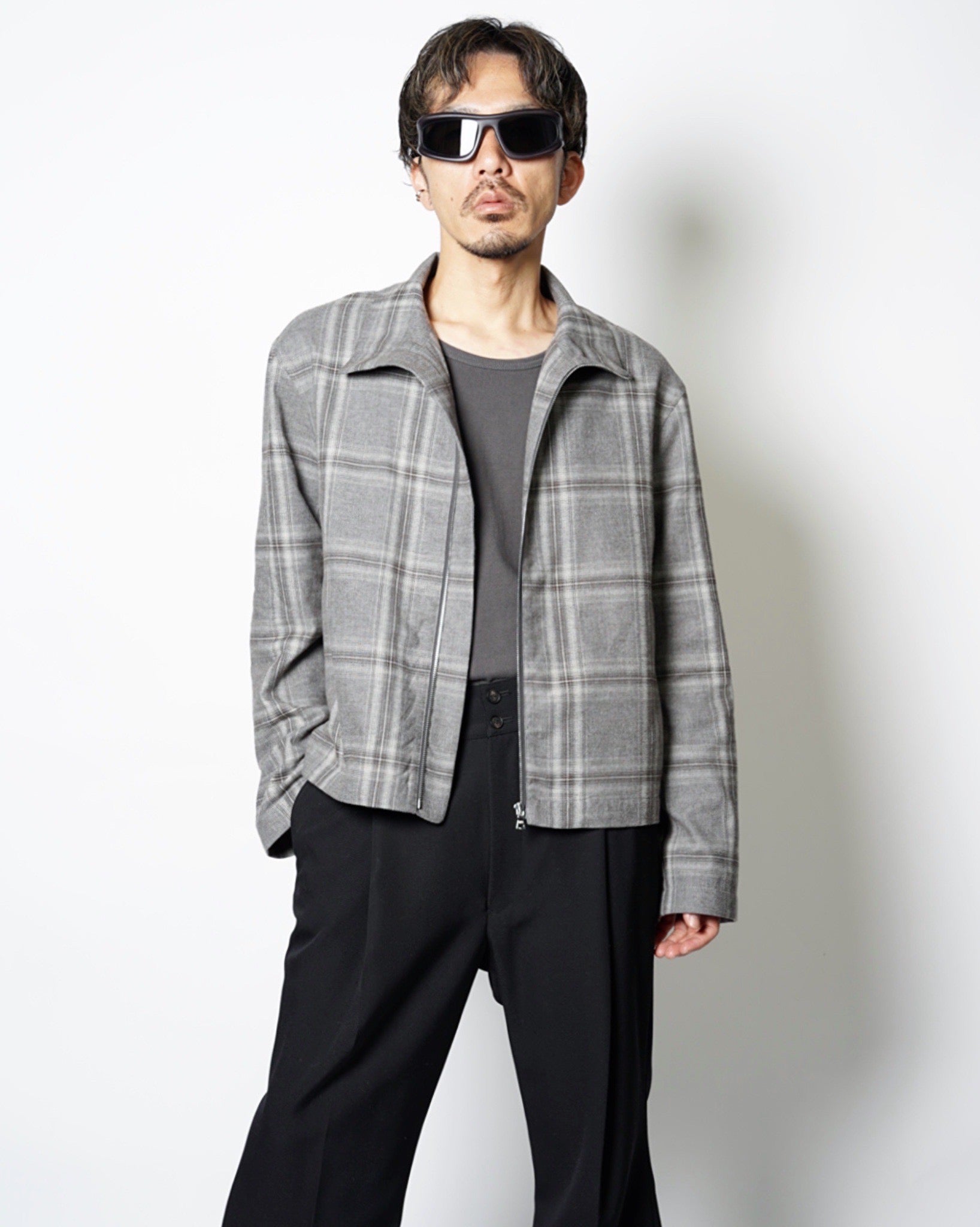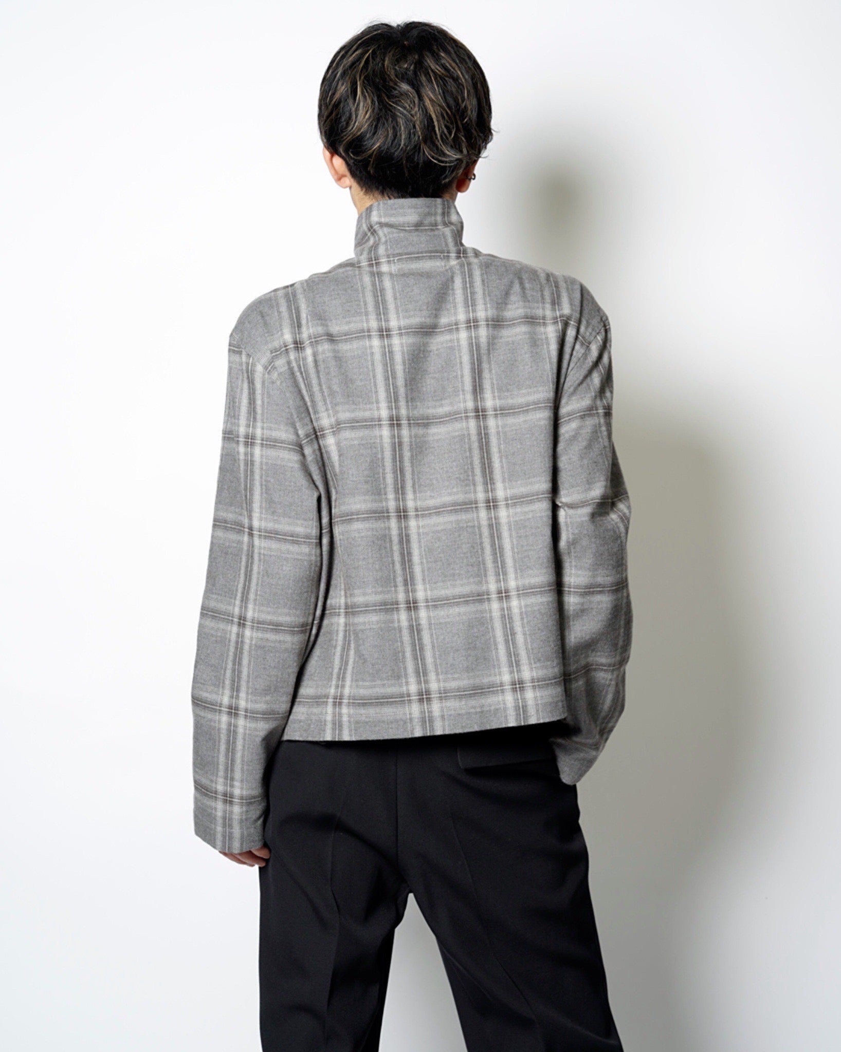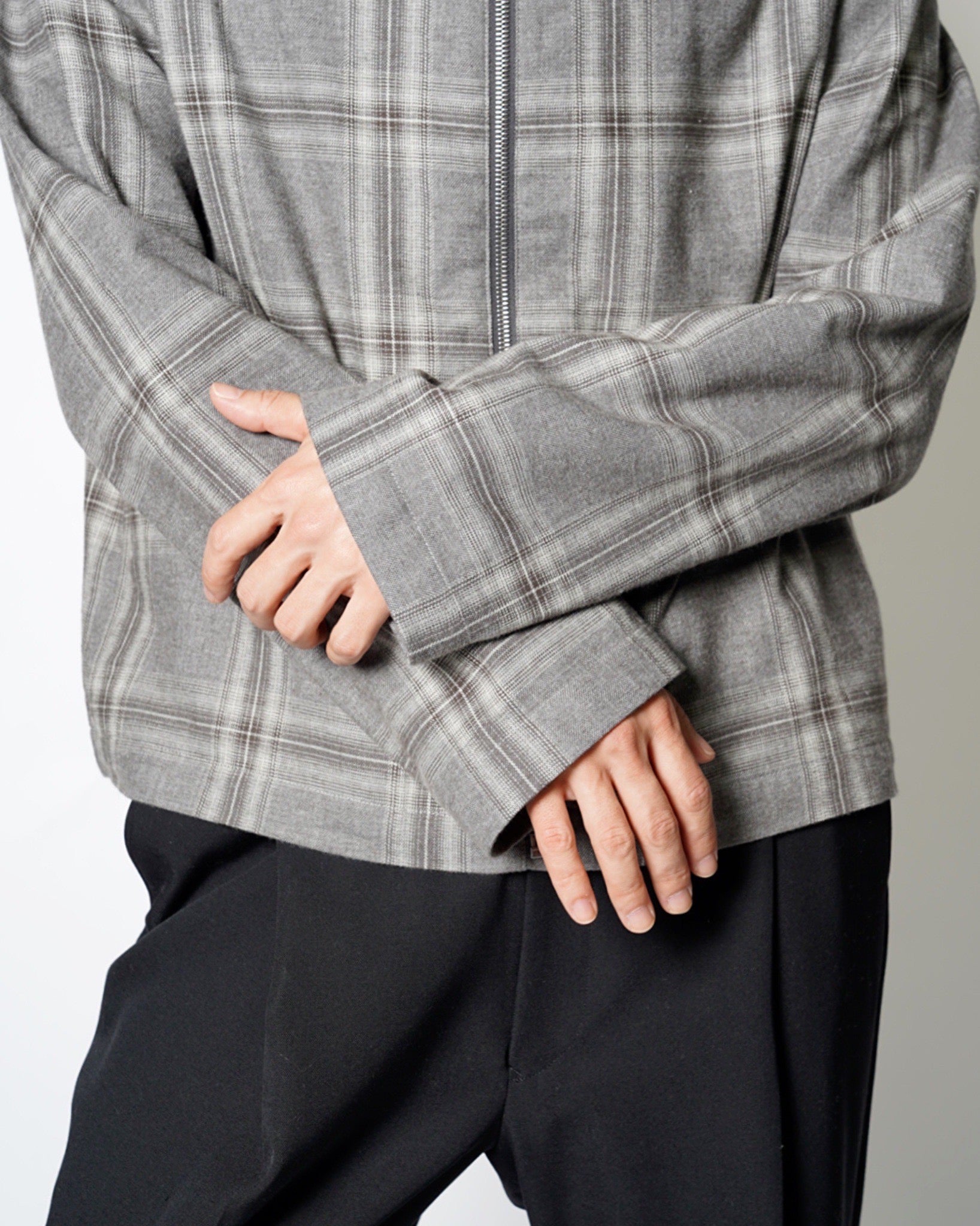 ・スタンドネックのブルゾンでオーセンティックなアイテムをベースとしながら、シックなグレーベースの品のあるウィンドウペンチェックで野暮ったさを感じさせないデザインに。